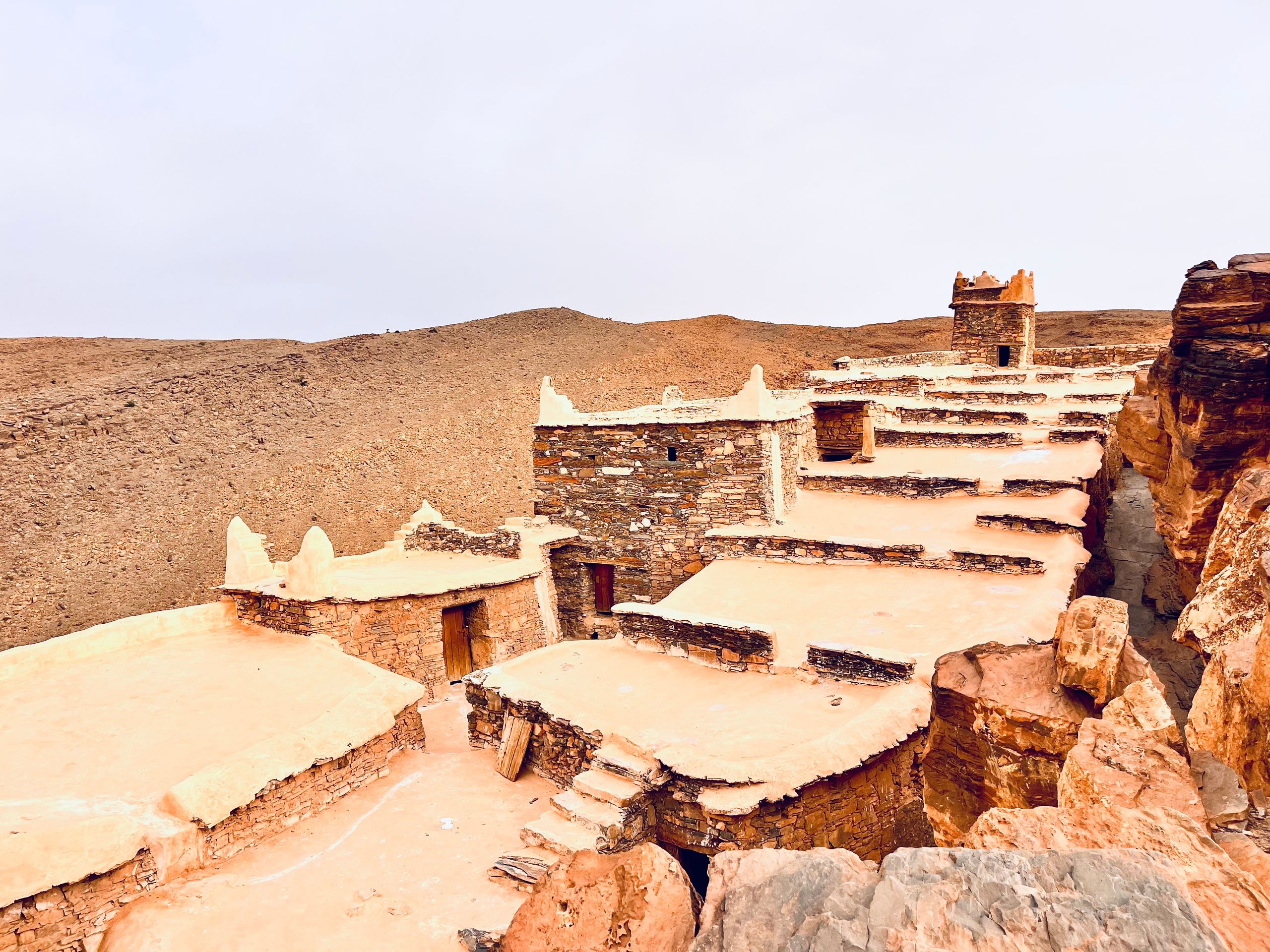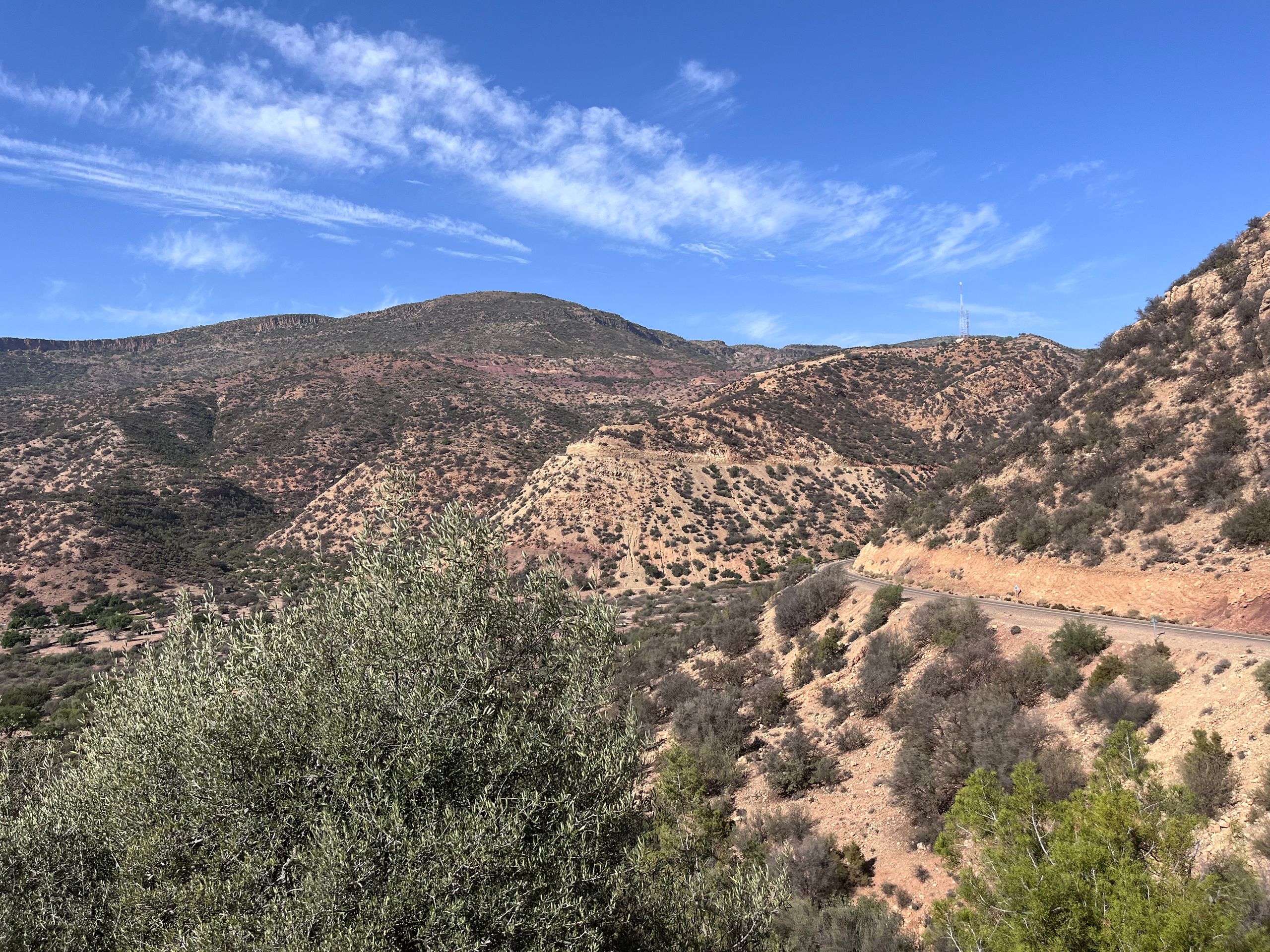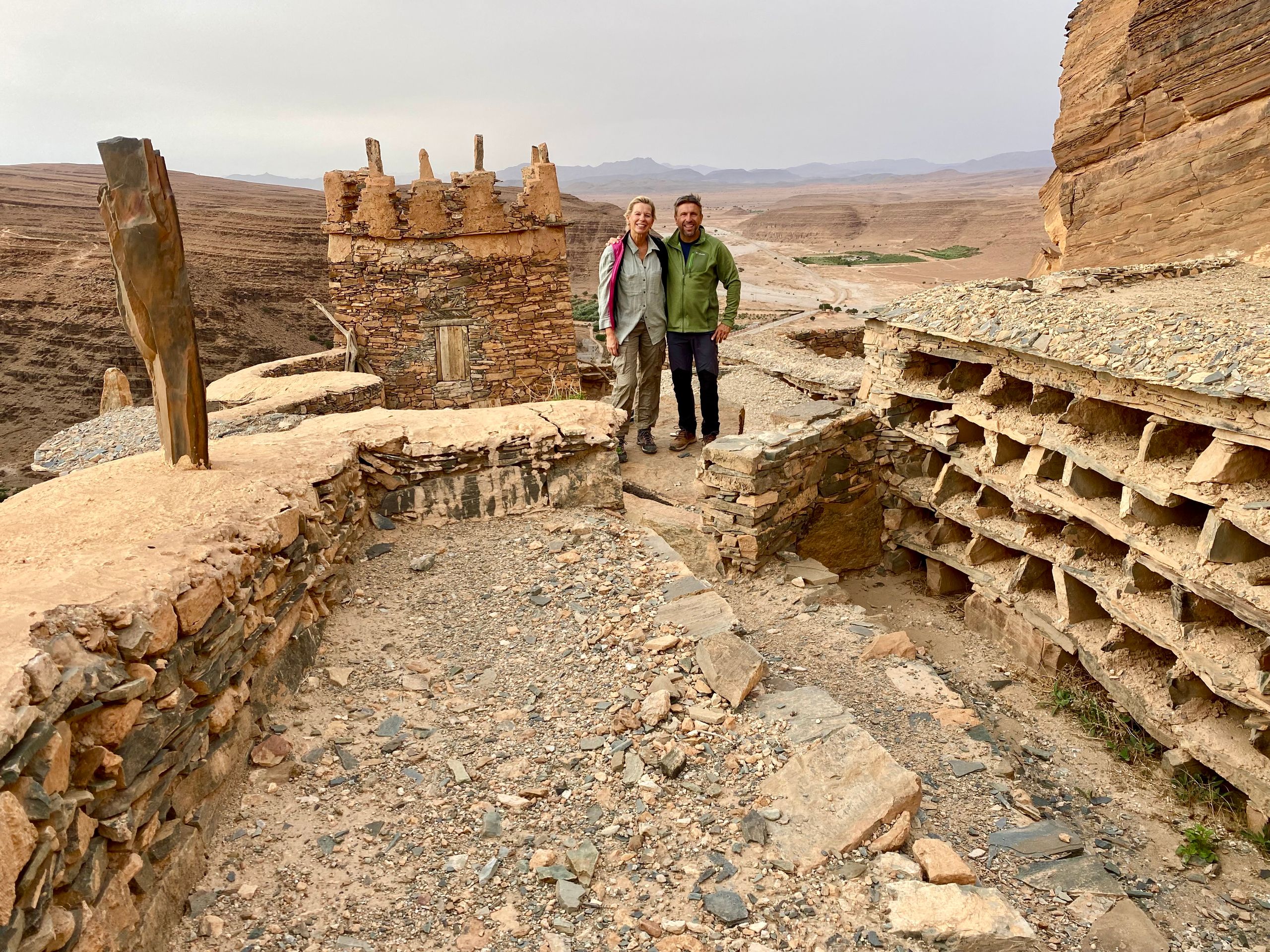 Nachdem wir am Vortag durch die Amtoudi Schlucht gewandert sind, wollen wir heute einen der Agadire besichtigen. Agadire sind antike Speicherfestungen auf Bergen, in denen früher Nahrung vor Feinden geschützt aufbewahrt wurde. Bei Angriffen haben sich dort auch die Dorfbewohner versteckt. Zwei kleine Jungs aus dem Dorf führen uns den steilen Pfad hinauf. Wir beide tragen Bergstiefel und Wanderstöcke, die beiden Jungs nur abgewetzte Sandalen. Oben auf dem Agadir empfängt uns ein alter Berber und gibt uns eine Privatführung durch den Agadir. Unter anderem wurde dort viel Honig gelagert. Es gibt im Agadir auch ein kleines Museum mit antiken Gegenständen aus dem Agadir. Unter anderem Koranverse auf Palmenholz geschrieben und eine uralte Muskete. Vor dem Agadir warten die beiden Jungs auf uns (sie durften nicht mit rein) und führen uns wieder ins Tal. Dafür bekommen sie eine kleine Belohnung in Form von Bonbons und Kugelschreibern.Ein unter Vanlifern hochgelobtes Reiseziel steht noch aus: Tafraoute! Tafraoute ist eine Kleinstadt im westlichen Anti-Atlas, die sich in einem imposanten Talkessel aus Granitfelsen befindet. Kurz vor Tafraoute befinden sich die "Blauen Steine". Ein belgischer Künstler hat 1984 von der Erosion rundgeschliffene Granitblöcke mit vielen Tonnen zumeist blauer Farbe bemalt. Das Kunstwerk ist unstritten, wir finden es gut und für Betty ist es eine fotogene Kulisse. Auf der Suche nach einem CP haben wir mal wieder ein für Marokko leider typisches Erlebnis: Wir halten an der Straße mit den meisten CP kurz an, um uns zu orientieren. Sofort stoppt neben uns ein Mofafahrer, der uns in gutem Deutsch inbrünstig "seinen" CP anpreist. In der Tat sehen die Bewertungen im Netz für diesen Platz wirklich gut aus und wir wir folgen seinem Rat, obwohl er uns etwas zu aufdringlich erscheint. Er zischt auf seiner Mofa von dannen und wir machen uns auf den Weg zum CP. Kurz vor dem nächsten Kreisel etwas außerhalb von Tafraoute überholt uns ein Mann im Geländewagen und hält gestikulierend an, so dass der Kreisel fast blockiert ist: Wir könnten nicht auf den CP, den uns der Mofafahrer empfohlen hätte, der hätte ein Problem mit der Wasserversorgung, redet der Fahrer heftig auf uns ein. Stattdessen sollten wir hier rechts abbiegen und ihm folgen. Auf so etwas haben wir nun so gar keine Lust! Ich gebe Gas, umkurve die "Strassensperre" und wir zischen ab. Zurück in der Stadt gehen wir auf den kleinen, örtlichen, netten CP und sind stinksauer über das Geschehene. Ob die beiden jetzt Konkurrenten oder Komplizen waren, keine Ahnung, verschiedenste Szenarien sind denkbar. Wir gehen abends noch in Tafraoute essen, Stimmung mag aber nicht aufkommen.