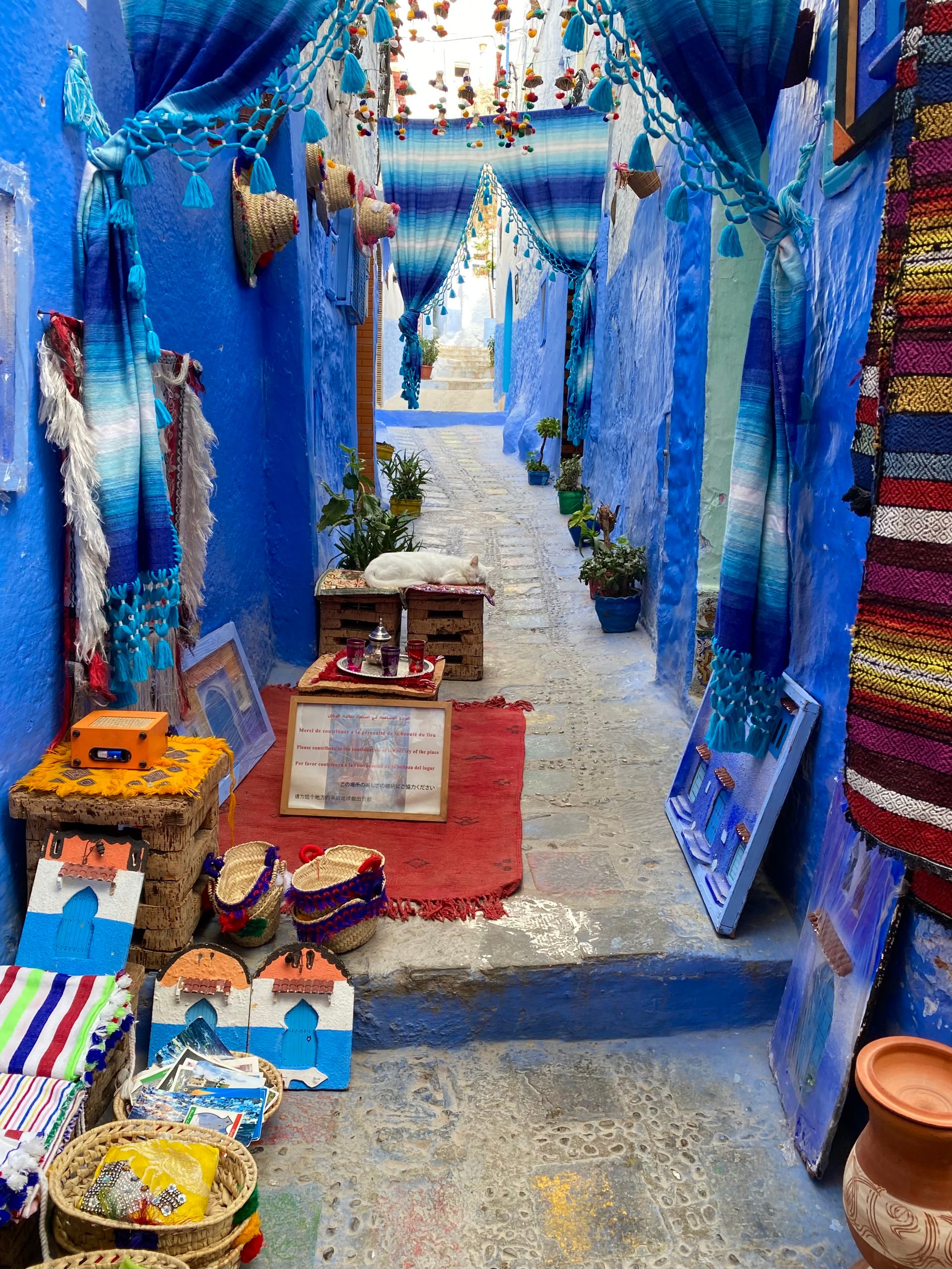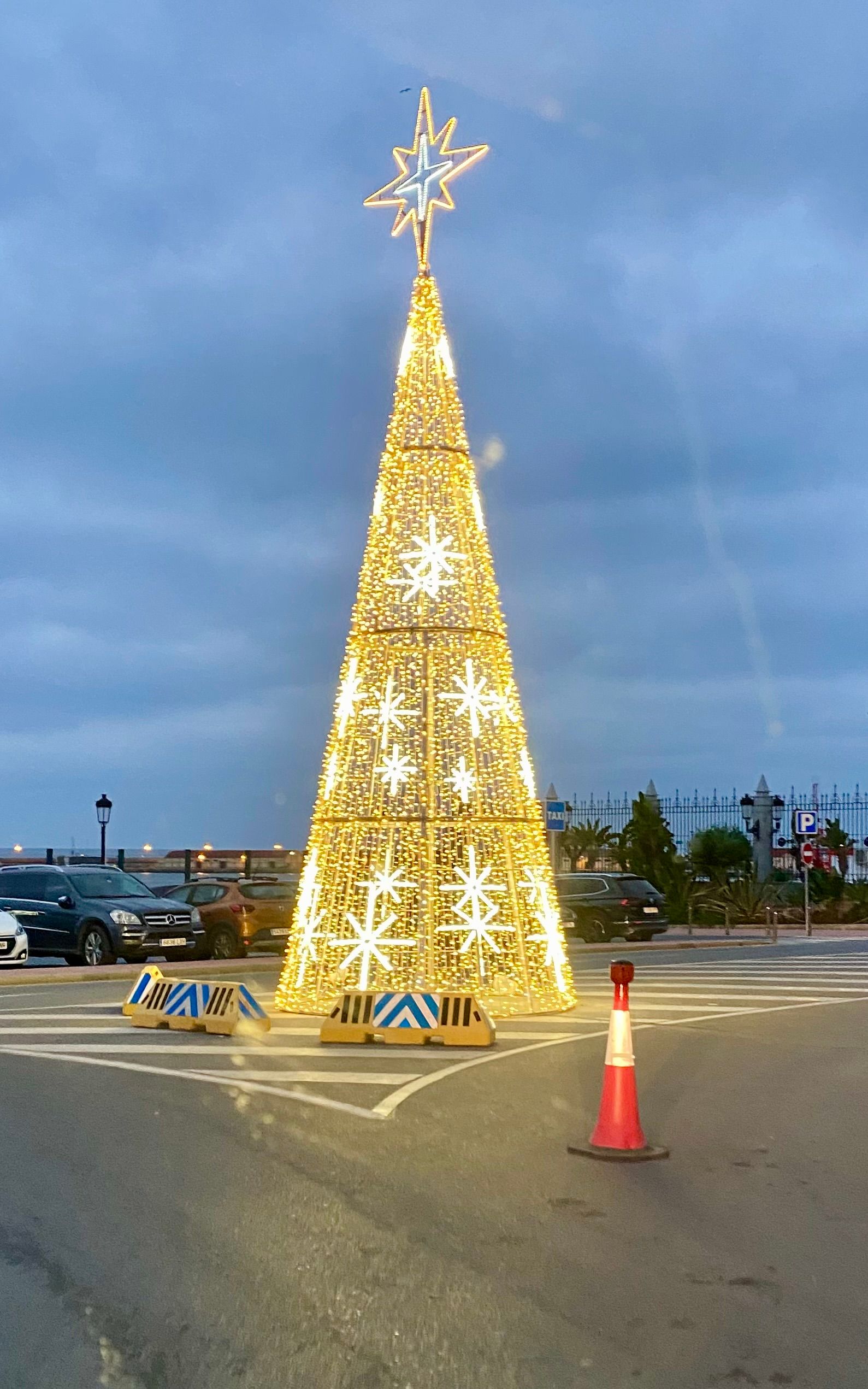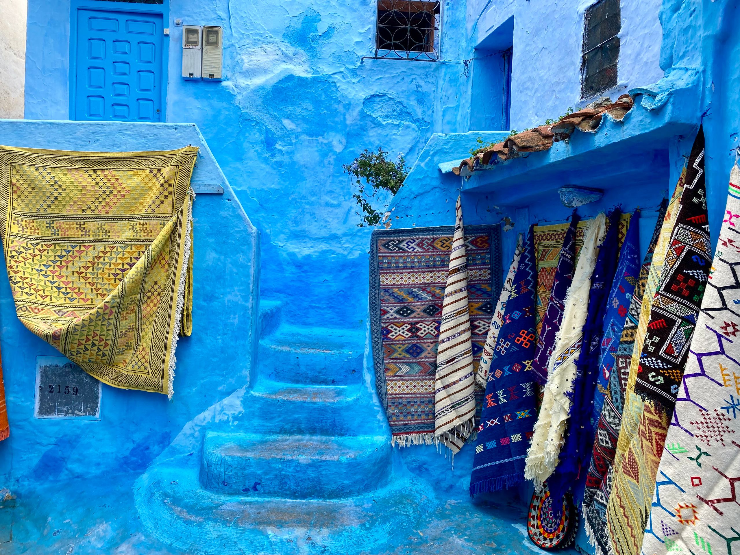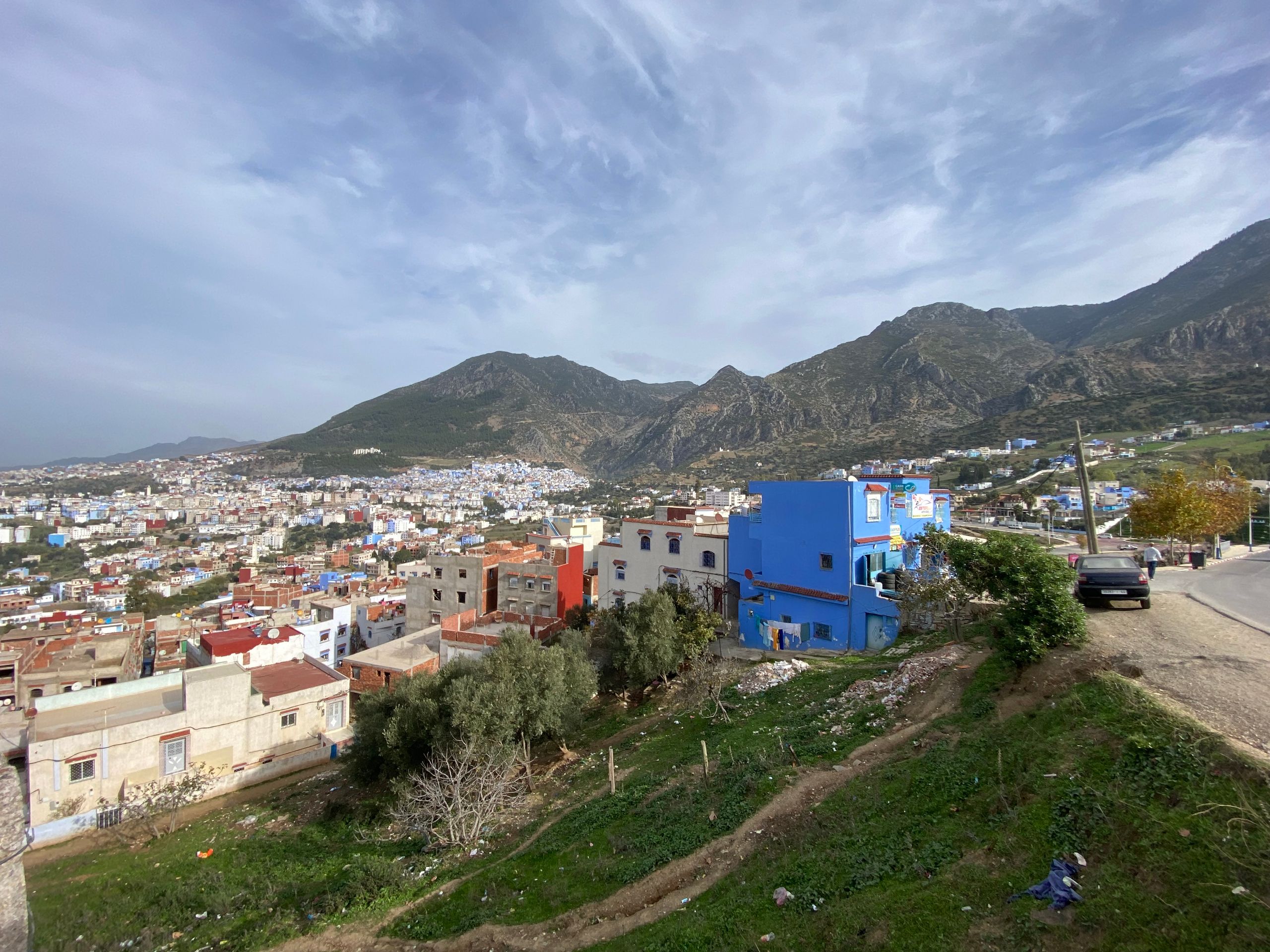 Morgens am 1.12 macht uns die Tante von Monim noch ein leckeres marrokanisches Frühstück und dann, nach einem kurzen, aber herzlichen Abschied von Monim, geht es los in Richtung Chefchaouen, unserem letzten Etappenziel. Bis zum nächsten Ort nehmen wir noch seine Frau und seine Cousine mit, die zum wöchentlichen Markt wollen. Als die beiden Frauen uns vor dem Van, direkt vor dem Markt und vor allen Leuten mit Umarmungen verabschieden, guckt der eine oder andere Marrokaner wohl etwas verdutzt aus der Wäsche. Kurz vor 12 Uhr kommen wir dann in der blauen Stadt Chefchaouen an. Chefchaouen liegt am Rande eines Talkessels des Rifgebirges nur rund 50 km von der Mittelmeerküste entfernt. Von oben kann man schon die vielen blau gestrichenen Gebäude sehen, die in der Sonne leuchten. Wir finden einen Parkplatz mitten in der Stadt und machen einen Spaziergang durch die Medina, die tatsächlich aussieht, wie einen blauen Farbtopf getaucht. Als eines der Hauptreiseziele in Marokko ist der Touristenandrang entsprechend groß und die Medina besteht fast nur aus viel zu vielen Souvenirgeschäften und Restaurants, die entsprechend aufdringlich um Kunden werben. Als wir uns zurückhaltend verhalten, ruft uns ein Händler hinterher, dass wir wohl nicht mit Marokkanern sprechen würden. Wir merken, wie dünnhäutig wir mittlerweile geworden sind und wie uns das Absabbeln und solche Sprüche die Freude an dieser wirklich schönen Stadt verderben. Nach nur knapp anderthalb Stunden starten wir daher den Motor und nehmen die letzten 100 km auf marrokanischem Boden in Richtung der spanischen Enklave Ceuta in Angriff. An der Grenze folgt dann die bekannte Bummelabfertigung durch die marrokanischen Grenzbehörden. Die 2 Stunden Wartezeit sind offensichtlich auch für die vielen Grenzpendler zuviel. Ein wildes Hupkonzert ertönt, was aber gar keinen Effekt auf die Abfertigungsgeschwindigkeit hat. Um 18 Uhr rollen wir dann endlich in das festlich geschmückte Ceuta ein und freuen uns über die schöne Weihnachtsbeleuchtung der Straßen. Unsere Fähre ist erst für den Vormittag des 2.12 gebucht, wir müssten also noch in Ceuta übernachten. Aber irgendwie sind wir durch mit Nordafrika. Im Hafenbüro können wir unsere Fähre noch auf die Nachtfähre umbuchen und am 1. Dezember um 22 Uhr verlassen wir den afrikanischen Kontinent in Richtung Algeciras. Bye bye Marokko!