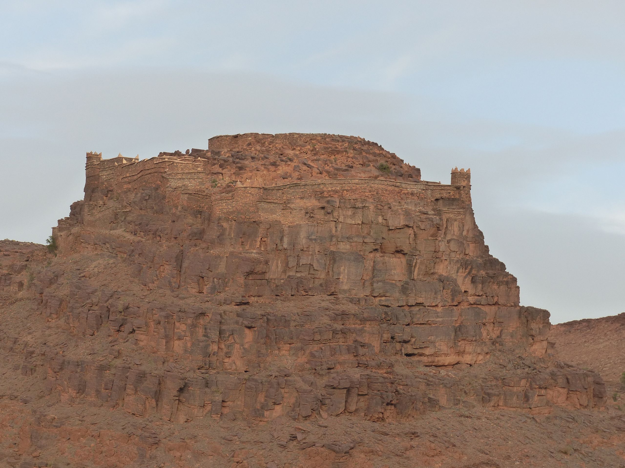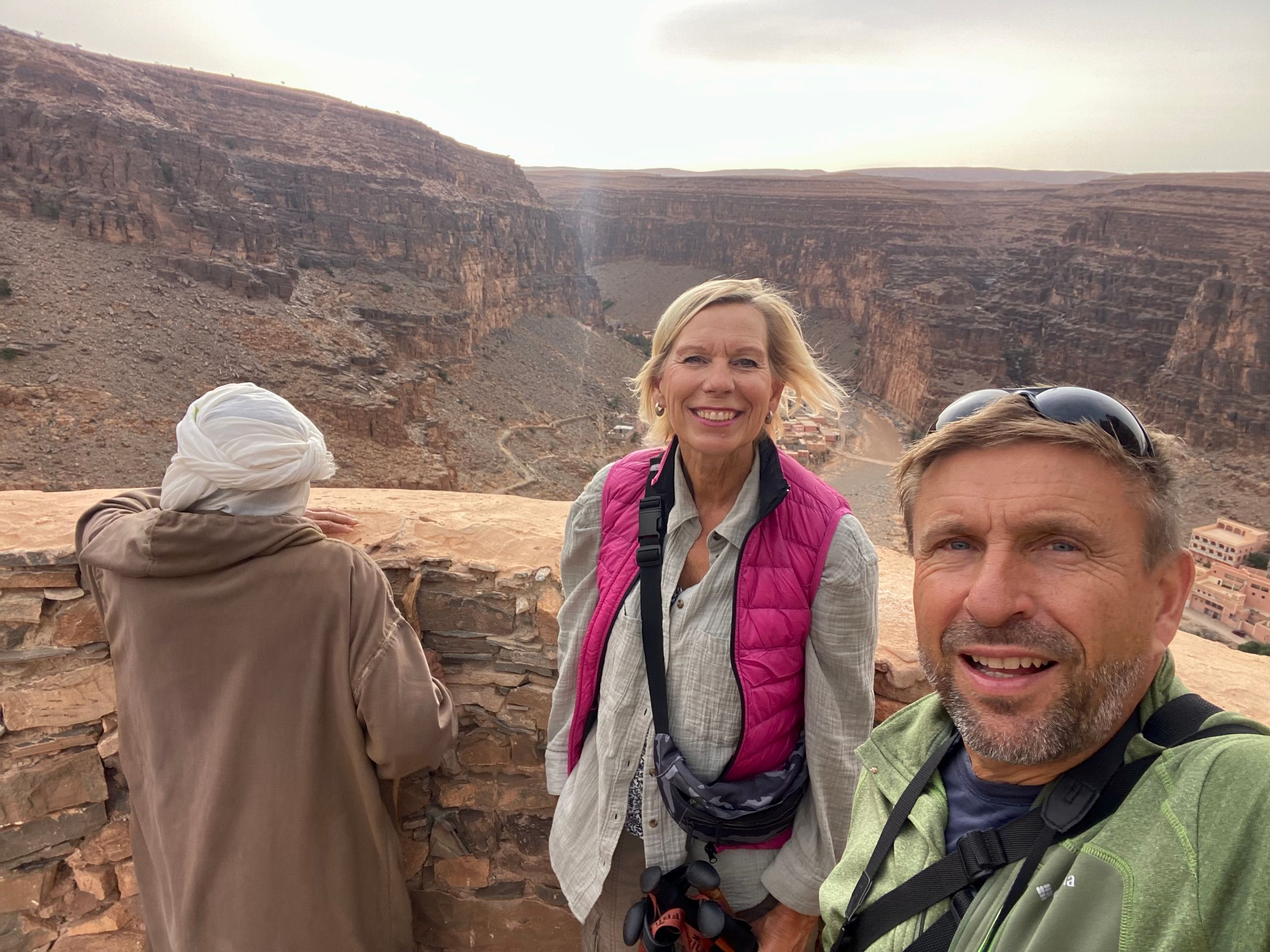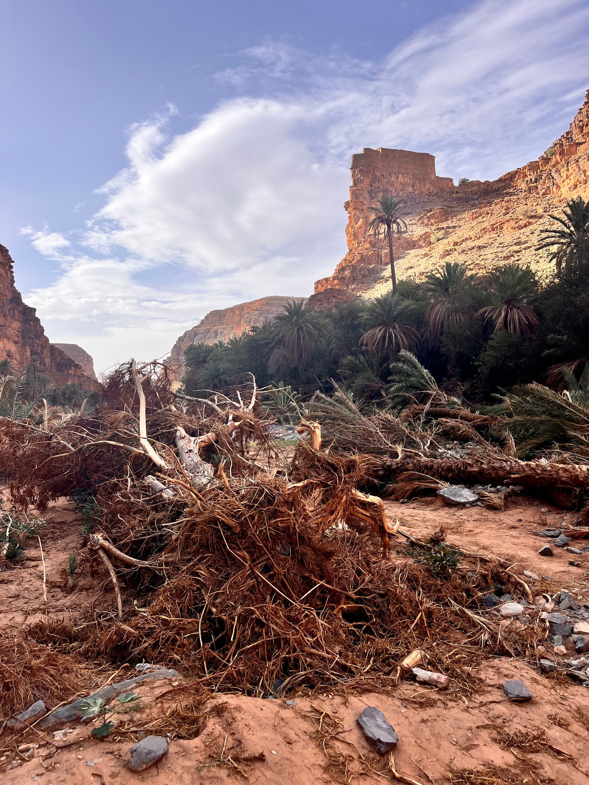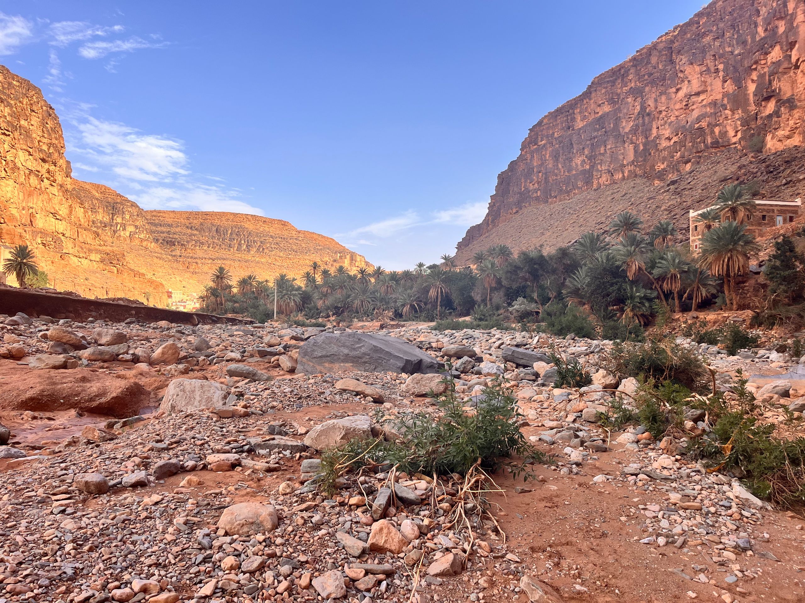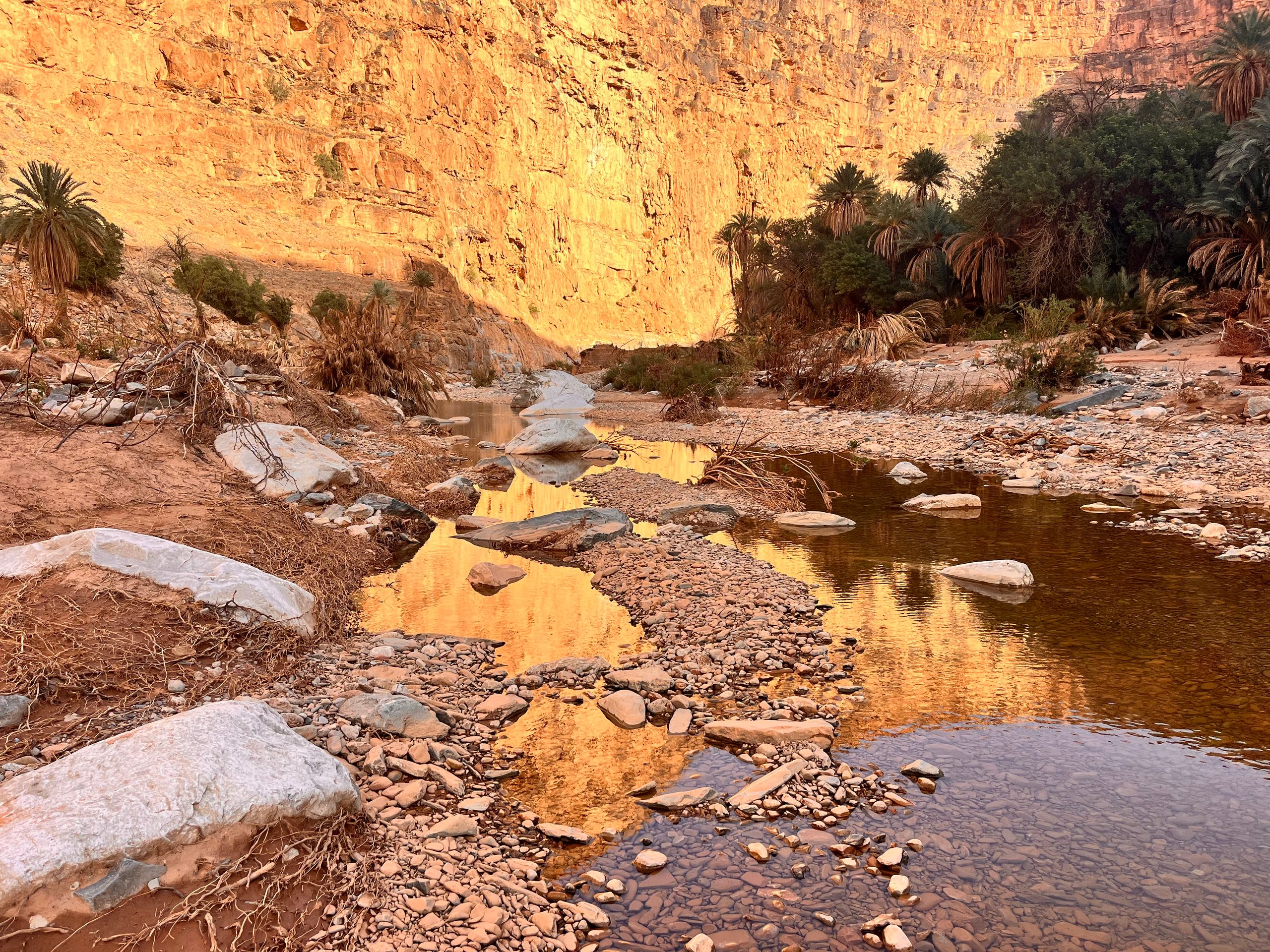 Wir fliehen vor dieser Wetterlage in Richtung Inland, in der Hoffnung auf weniger Staub in der Luft und nachlassenden Wind. Über die Provinzhauptstadt Guelmin geht es die rund 150 km östlich in Richtung Amtoudi. Den bekannten und größten Kamelmarkt am Rand der Westsahara in Guelmin verpassen wir leider um einen Tag. Angeblich werden die verkauften Kamele dort ganz neuzeitlich mit Gabelstaplern verladen! Je weiter wir in das Inland kommen, desto mehr lässt der Sturm nach und die Luft wird wieder klarer. Also richtige Entscheidung! Unsere Reisebekannten Silke und Tim hatten uns sehr ans Herz gelegt, die Schlucht vom Amtoudi zu besuchen. Amtoudi selber ist ein kleines Dorf am Rande der Schlucht, zu der sich offensichtlich nur wenige Touristen verlieren. Auf dem örtlichen CP sind wir fast die einzigen Gäste. Vom fast leeren Campingplatz wandern wir in die berühmte Amtoudi Schlucht. In der Schlucht befindet sich ein fast trockener Wadi. Bei den katastrophalen Regenfällen im vergangenen September schwoll dieser Fluss auf über 10 m Höhe an. Fast die gesamte Palmenoase und einige Häuser in Flussnähe wurden zerstört. Zum Glück gab es keine Opfer zu beklagen. Streckenweise fühlt man sich an das Ahrtal erinnert. Trotzdem gewinnt man einen Eindruck, wie schön diese Gegend ist. Über der Schlucht thronen malerisch zwei Agadire. Agadire sind Bergfestungen. Am Ende der Wanderung treffen wir noch zwei einheimische Frauen, die am Fluss sitzen und aus Palmenblättern und bunten Fäden hübsche Schalen anfertigen. Wir kaufen eine Schale und waren bestimmt die einzigen Kunden heute.