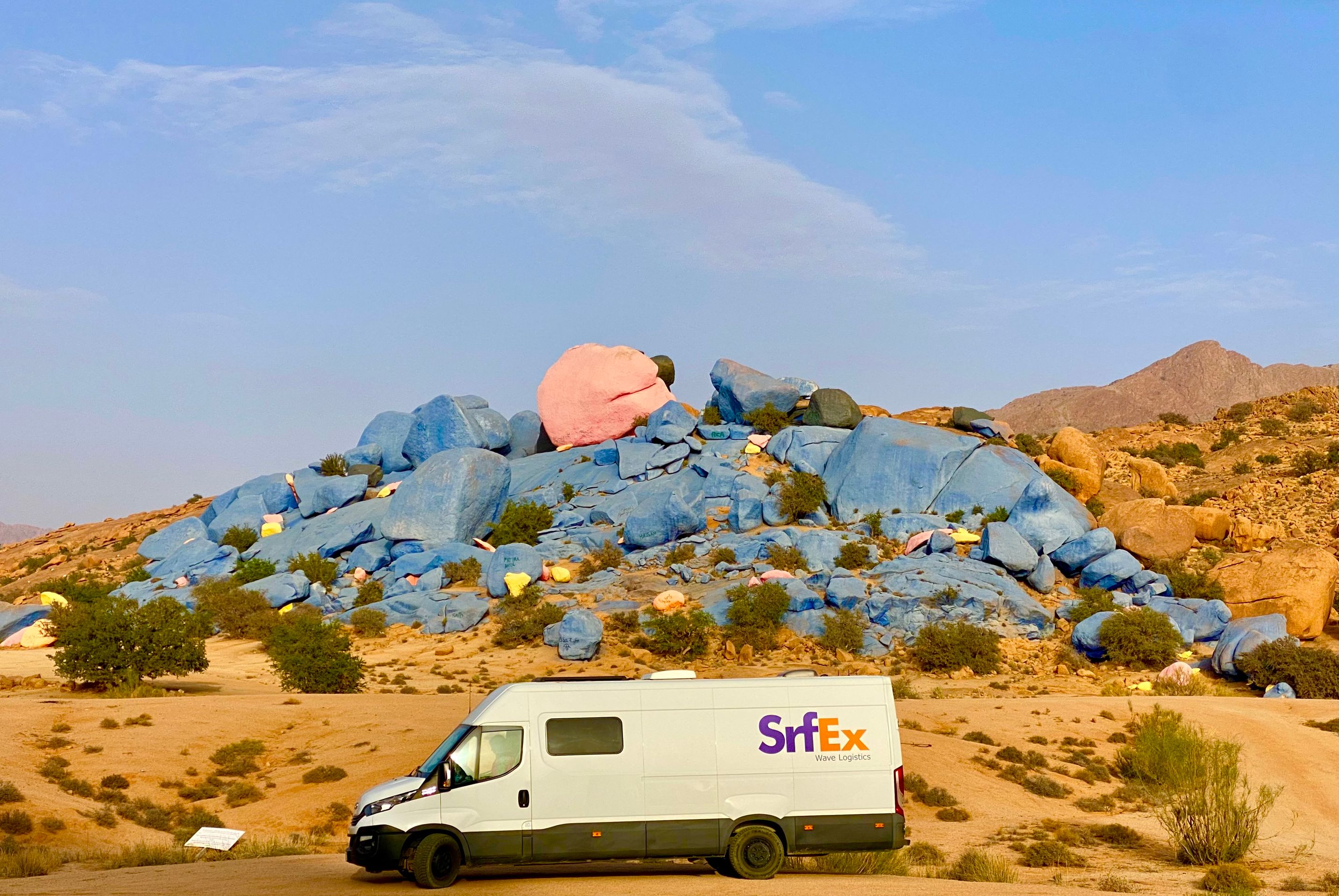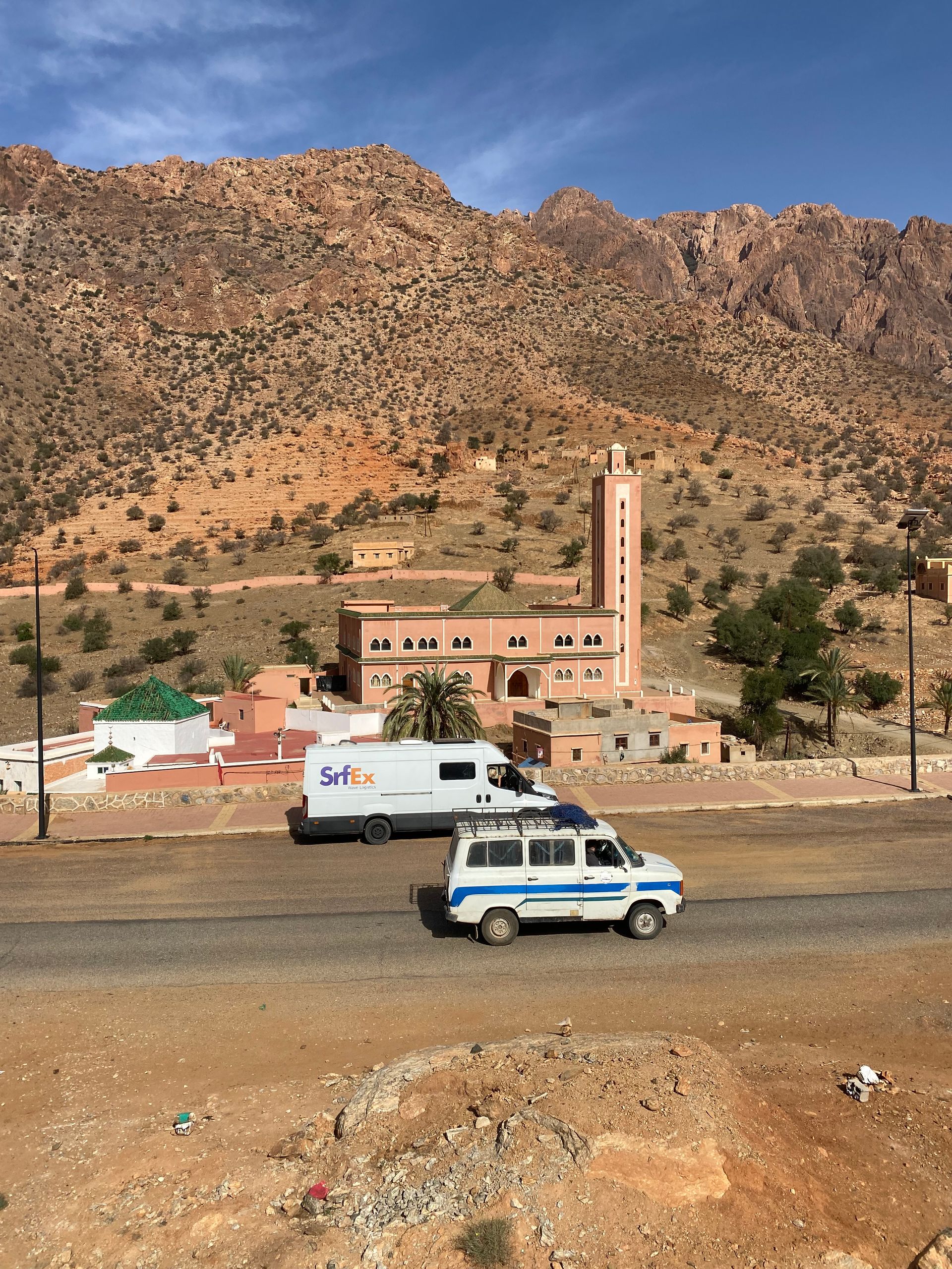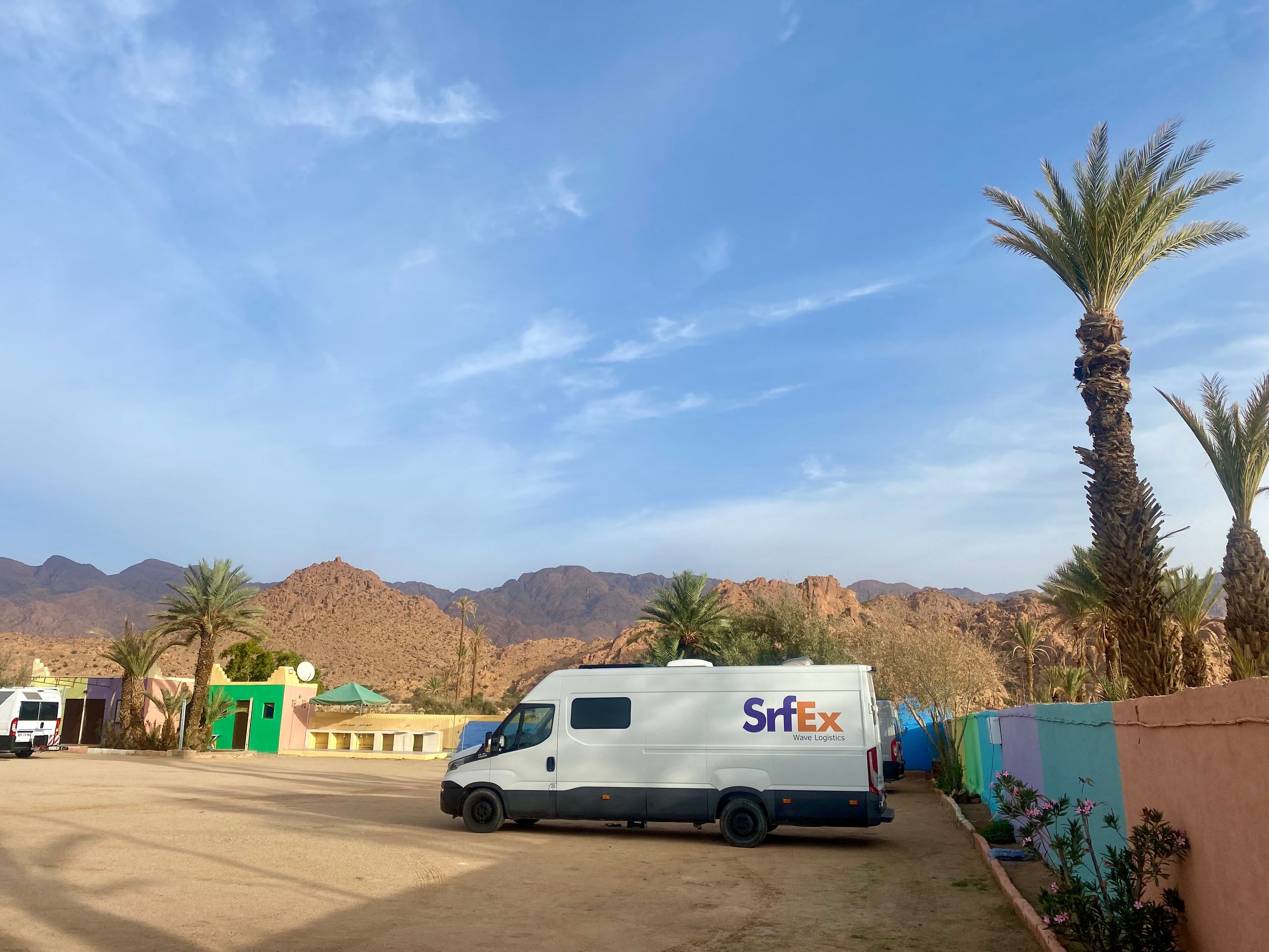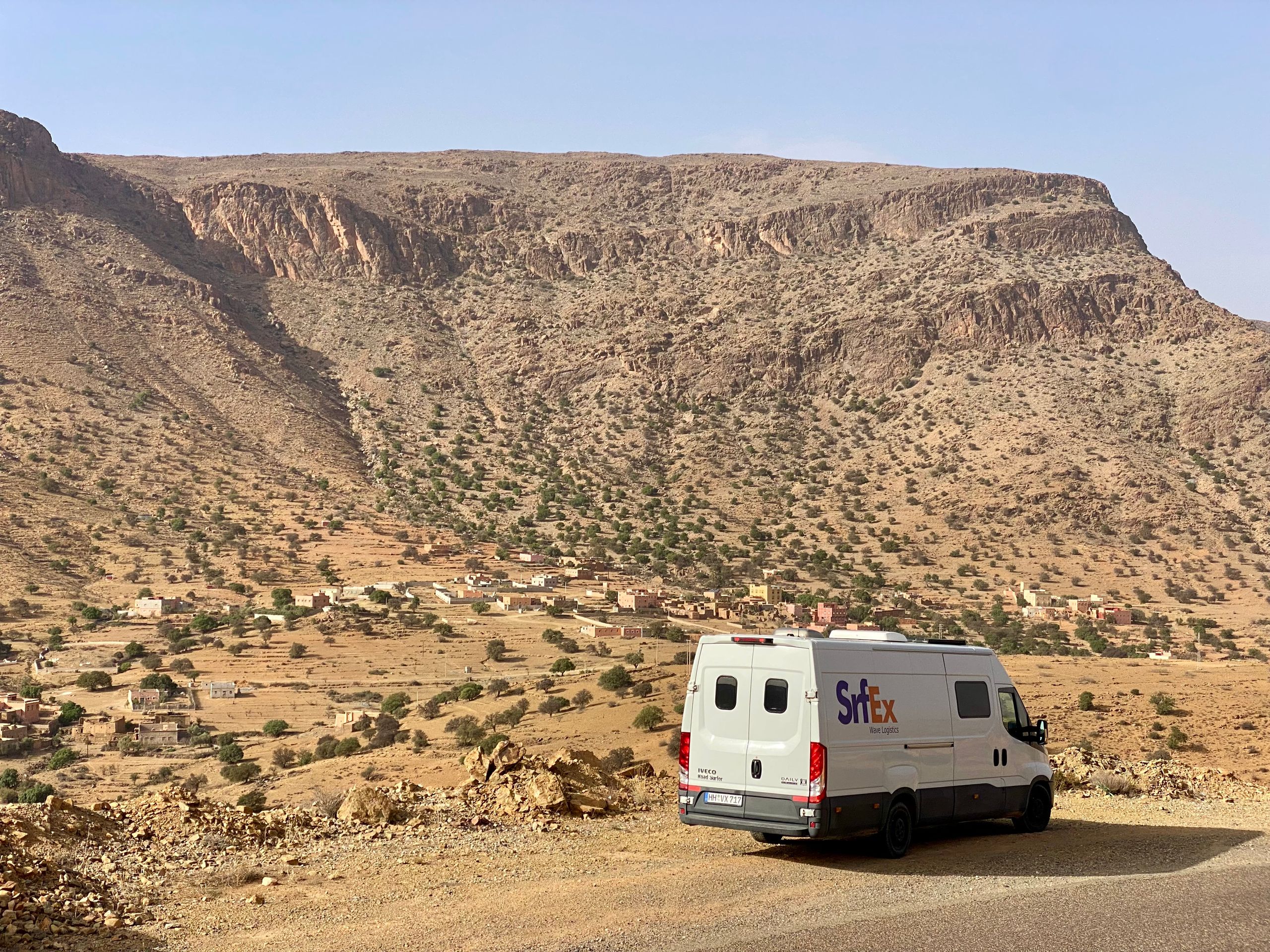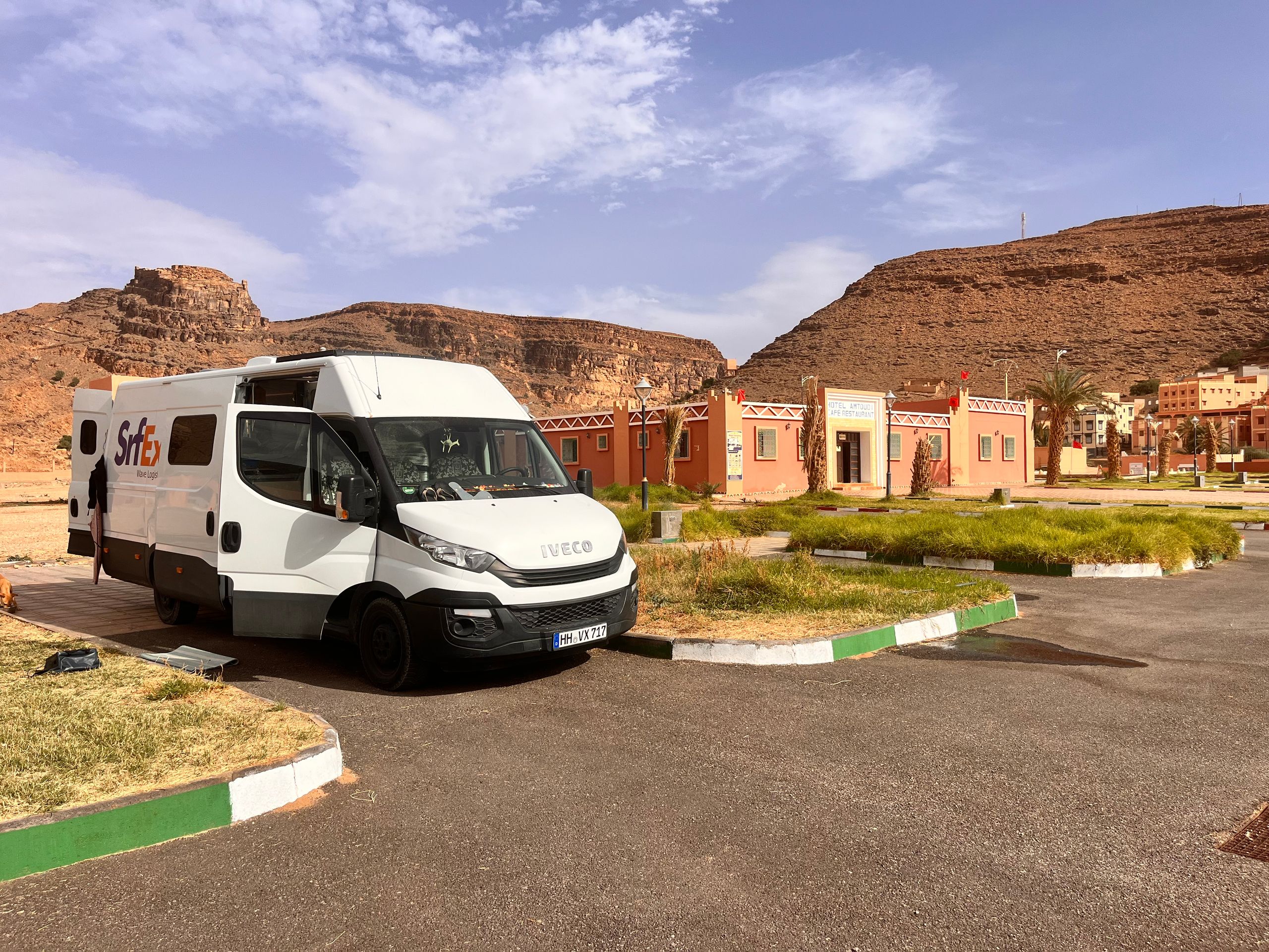 Gegen Mittag treffen wir in Mirleft ein und finden nach kurzer Suche das Wohnmobil unserer Bekannten Mike und Maki mit ihren beiden Kindern an einem der Surfspots von Mirleft. Nach gut sechs Wochen "Lieferzeit" können wir Ihnen endlich das uns mitgegebene Paket aus Spanien (mit Harry Potter Büchern, wir wir jetzt erfahren) übergeben. Die Übergabe des Paketes unter dem Srf_Ex Logo wird natürlich für deren Insta Account 3littlespirals mit fast 5.000 Followern professionell dokumentiert! Da sich über den Tag ein Sandsturm aufbaut und es am Strand langsam unerträglich wird, fliehen wir alle nach einer Weile notgedrungen vom Strand. Im Ortskern von Mirleft lässt es sich gut aushalten und wir verbringen einen netten Tag zusammen. Die "3littlespirals" sind gerade am Planen für die Zukunft, im nächsten Jahr soll es entweder nach Mittelamerika oder nach Japan gehen. Wahre Globetrotter! Leider trennen sich unsere Wege an diesem Tag schon wieder, da wir jetzt noch ein strammes Programm in Marokko haben und Mike in Mirleft noch besonders hohe Wellen abwarten möchte, die der Wetterdienst angekündigt hat. Mirleft gefällt uns übrigens sehr gut. Die kleine Stadt ist aufgeräumt und sauber. Es gibt nette Restaurants und Cafes und beim flanieren durch die Straßen wird man weitestgehend in Ruhe gelassen.