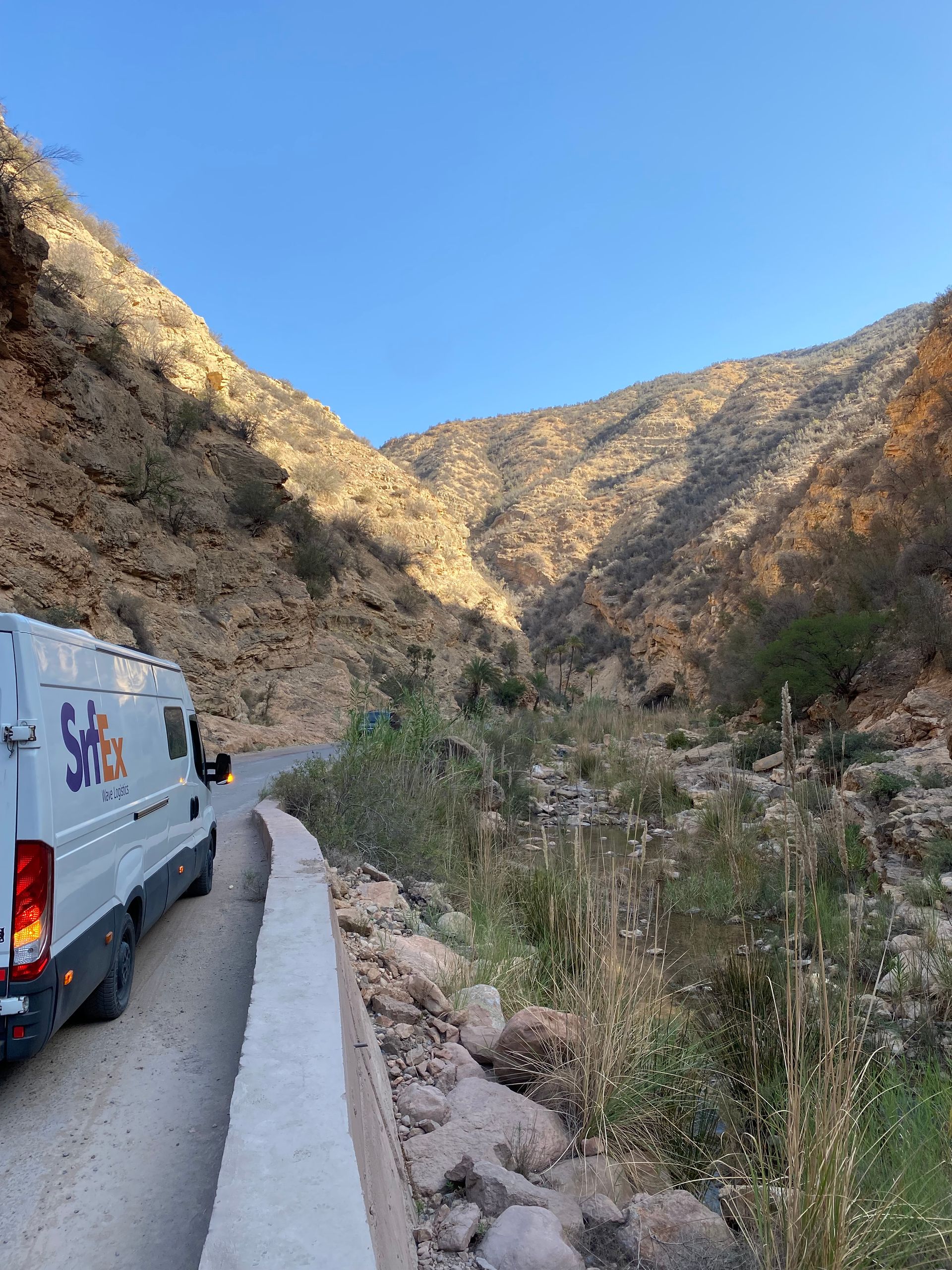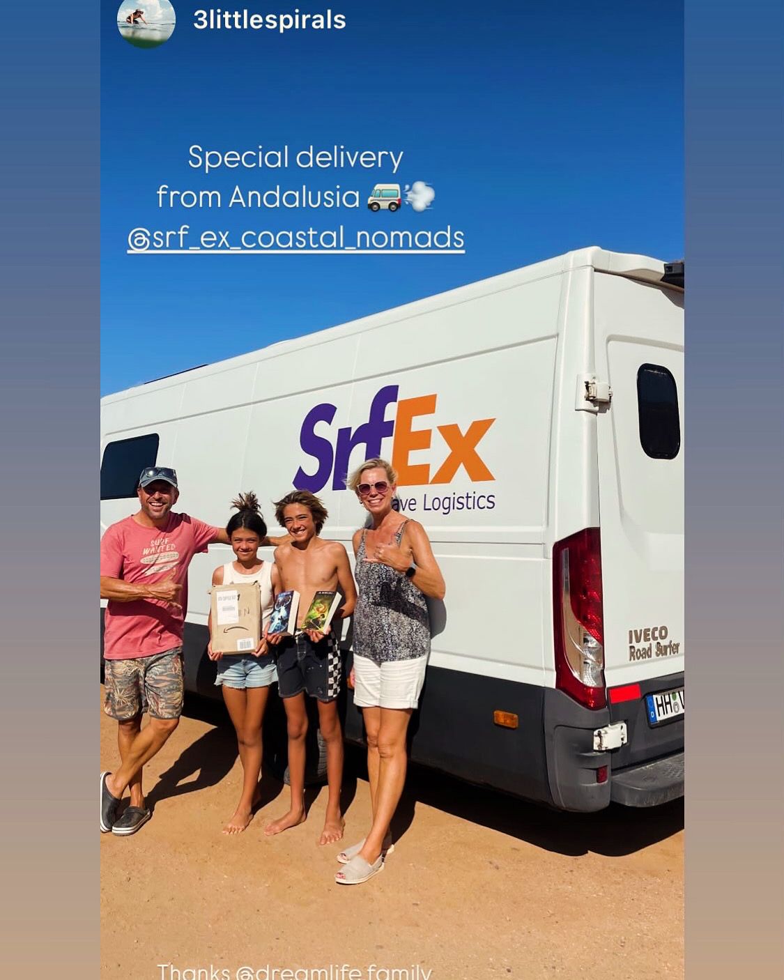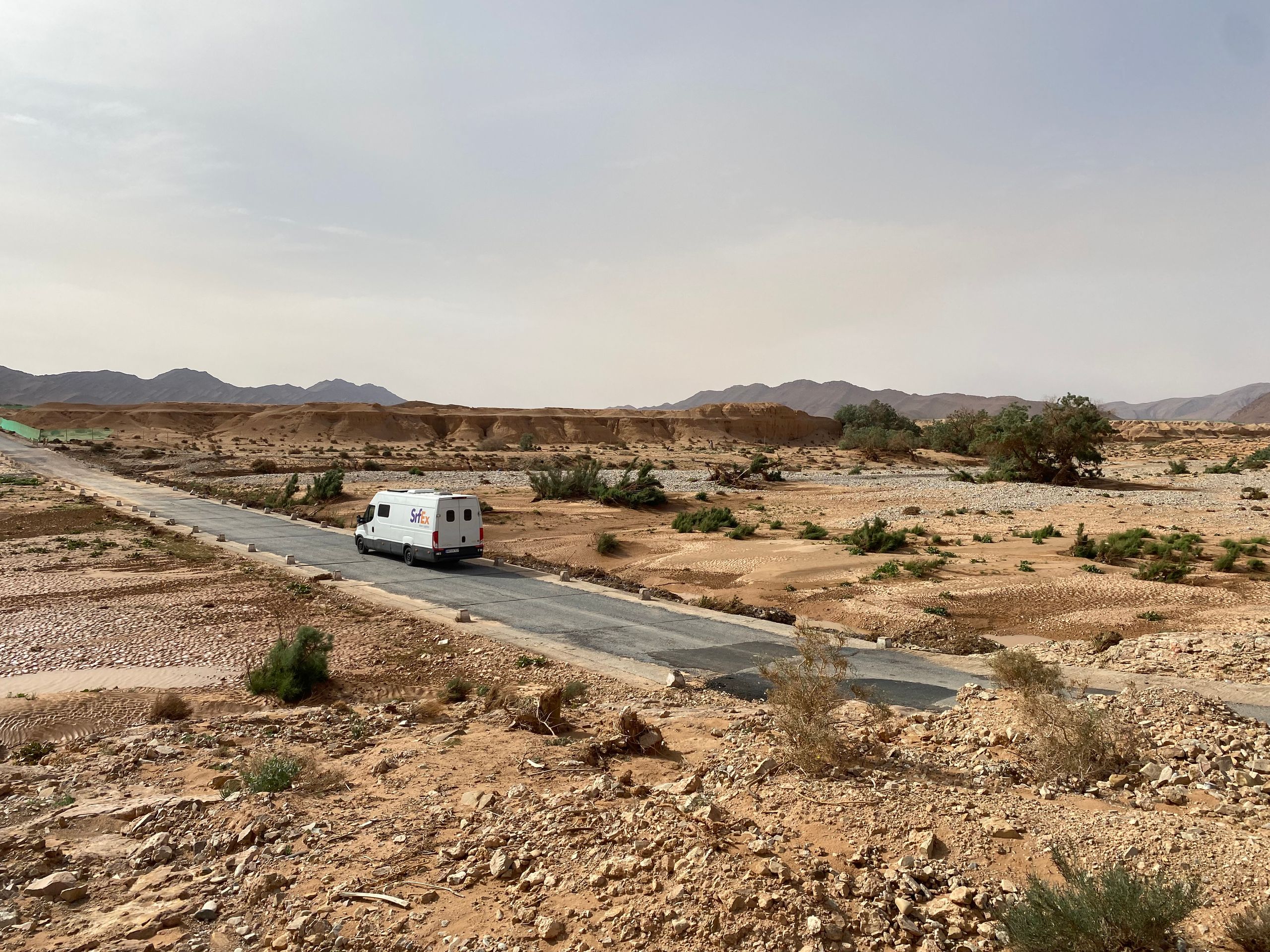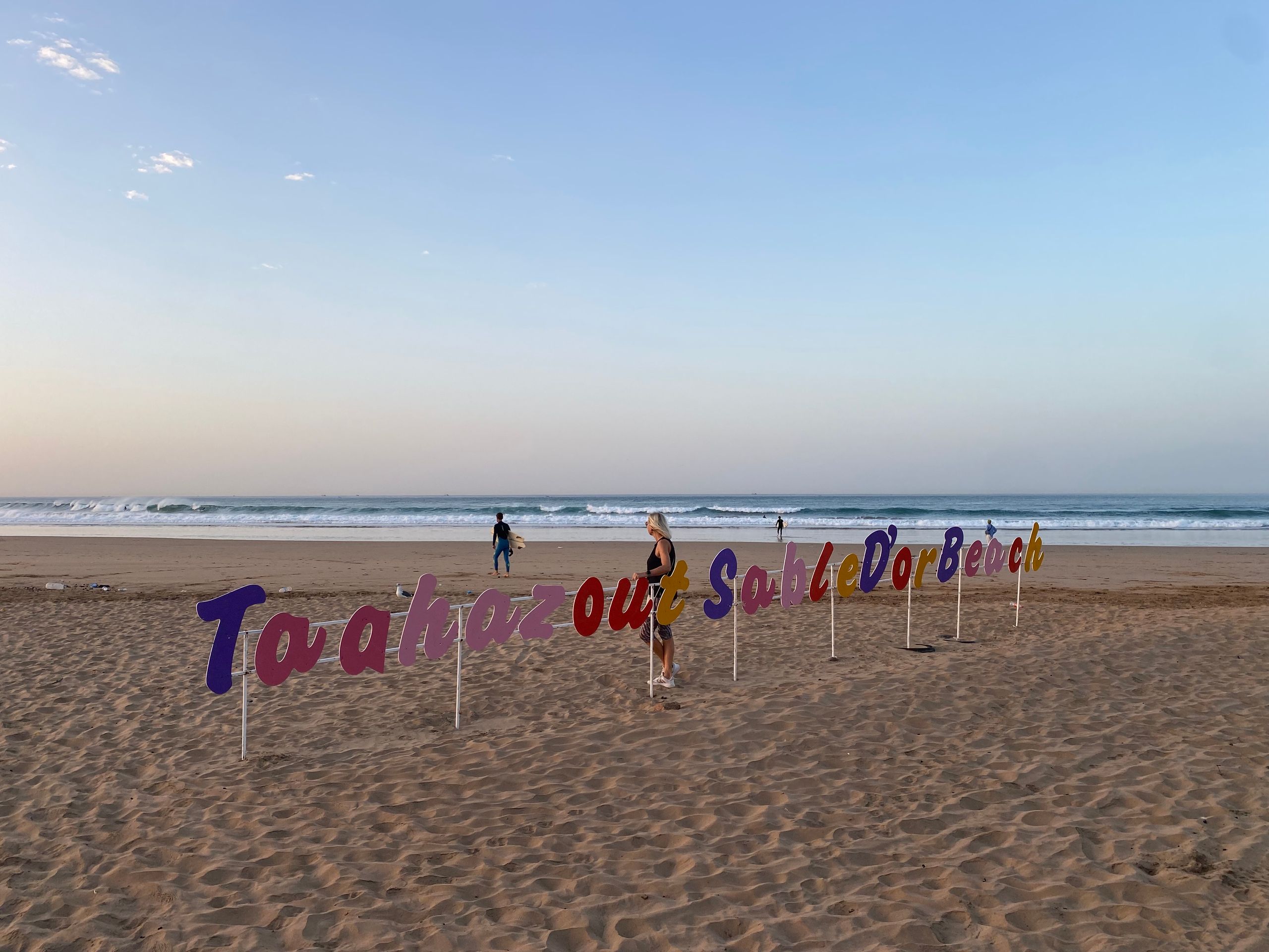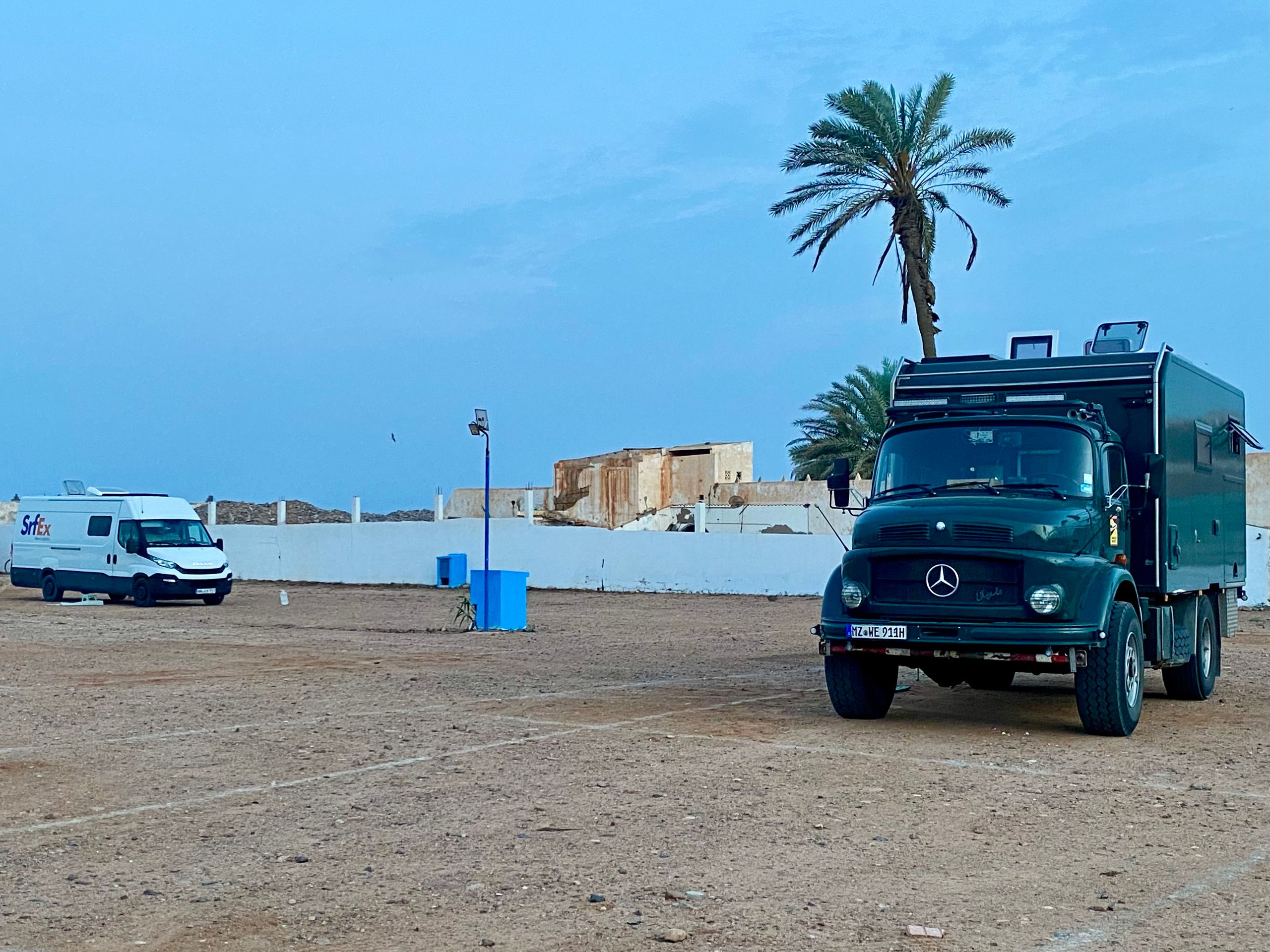 Gegen Mittag treffen wir in Mirleft ein und finden nach kurzer Suche das Wohnmobil unserer Bekannten Mike und Maki mit ihren beiden Kindern an einem der Surfspots von Mirleft. Nach gut sechs Wochen "Lieferzeit" können wir Ihnen endlich das uns mitgegebene Paket aus Spanien (mit Harry Potter Büchern, wir wir jetzt erfahren) übergeben. Die Übergabe des Paketes unter dem Srf_Ex Logo wird natürlich für deren Insta Account 3littlespirals mit fast 5.000 Followern professionell dokumentiert! Da sich über den Tag ein Sandsturm aufbaut und es am Strand langsam unerträglich wird, fliehen wir alle nach einer Weile notgedrungen vom Strand. Im Ortskern von Mirleft lässt es sich gut aushalten und wir verbringen einen netten Tag zusammen. Die "3littlespirals" sind gerade am Planen für die Zukunft, im nächsten Jahr soll es entweder nach Mittelamerika oder nach Japan gehen. Wahre Globetrotter! Leider trennen sich unsere Wege an diesem Tag schon wieder, da wir jetzt noch ein strammes Programm in Marokko haben und Mike in Mirleft noch besonders hohe Wellen abwarten möchte, die der Wetterdienst angekündigt hat. Mirleft gefällt uns übrigens sehr gut. Die kleine Stadt ist aufgeräumt und sauber. Es gibt nette Restaurants und Cafes und beim flanieren durch die Straßen wird man weitestgehend in Ruhe gelassen.
