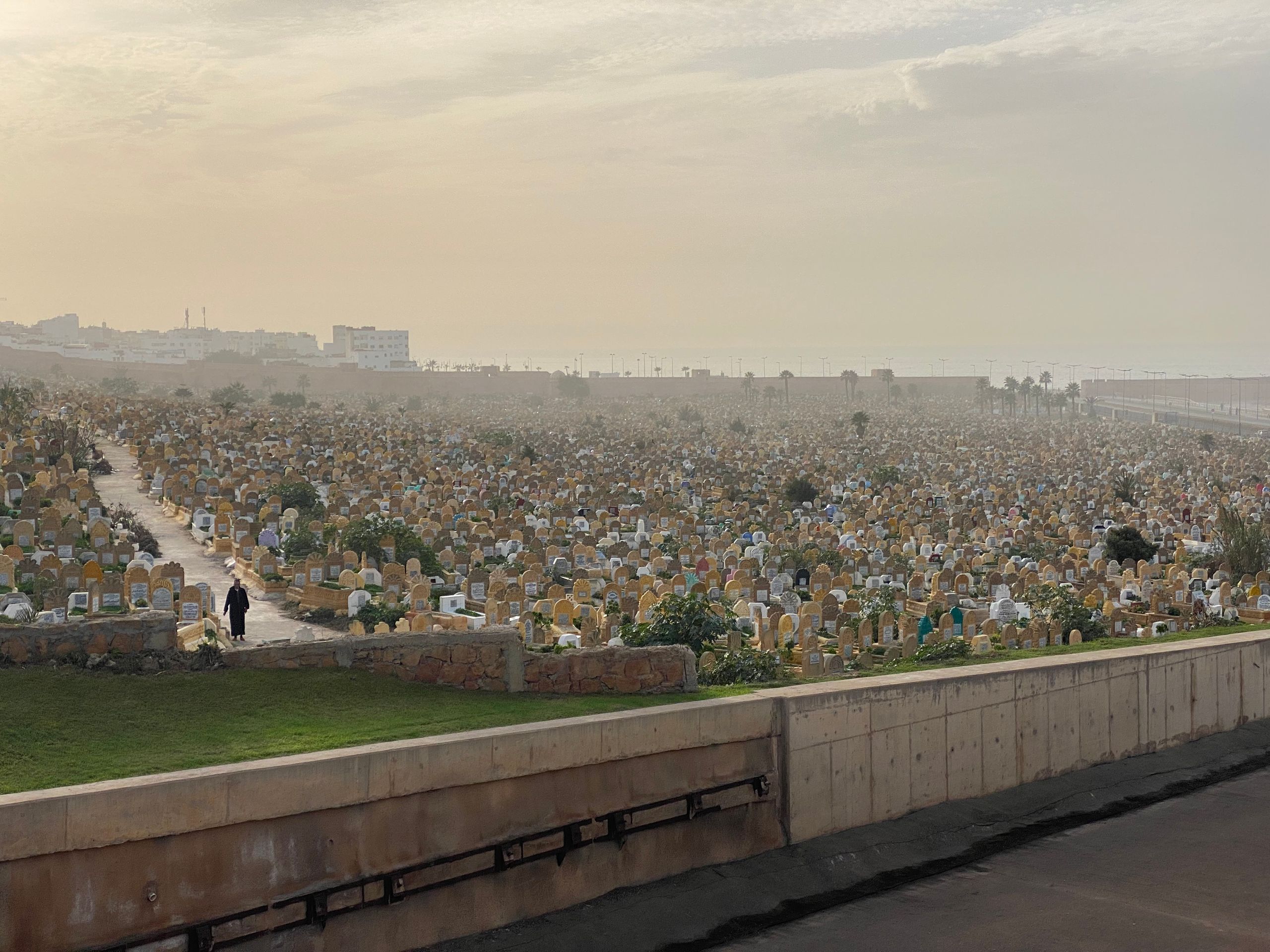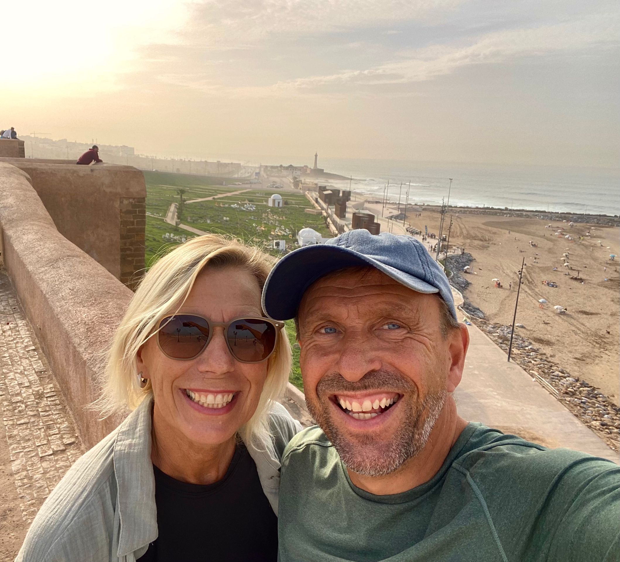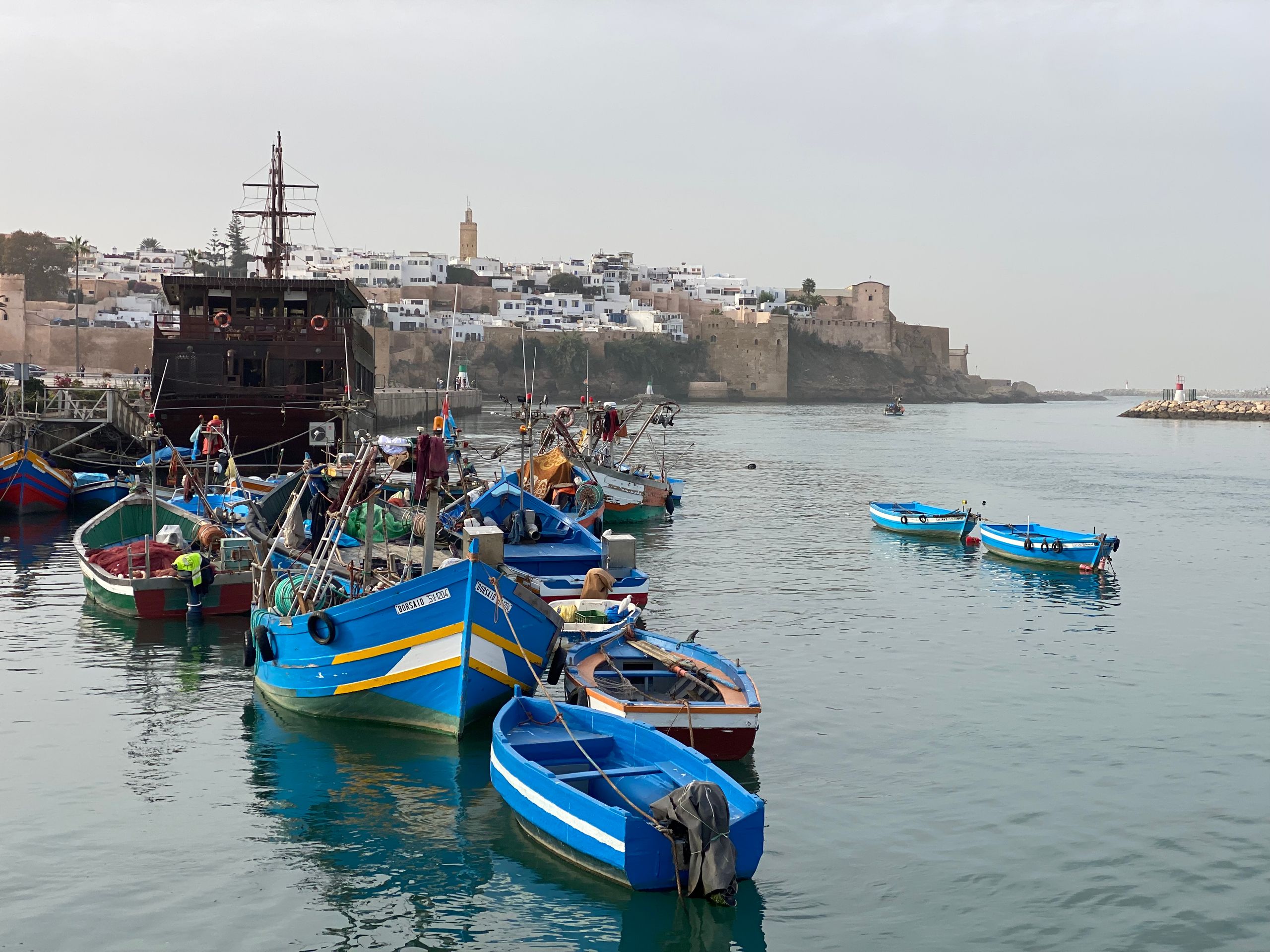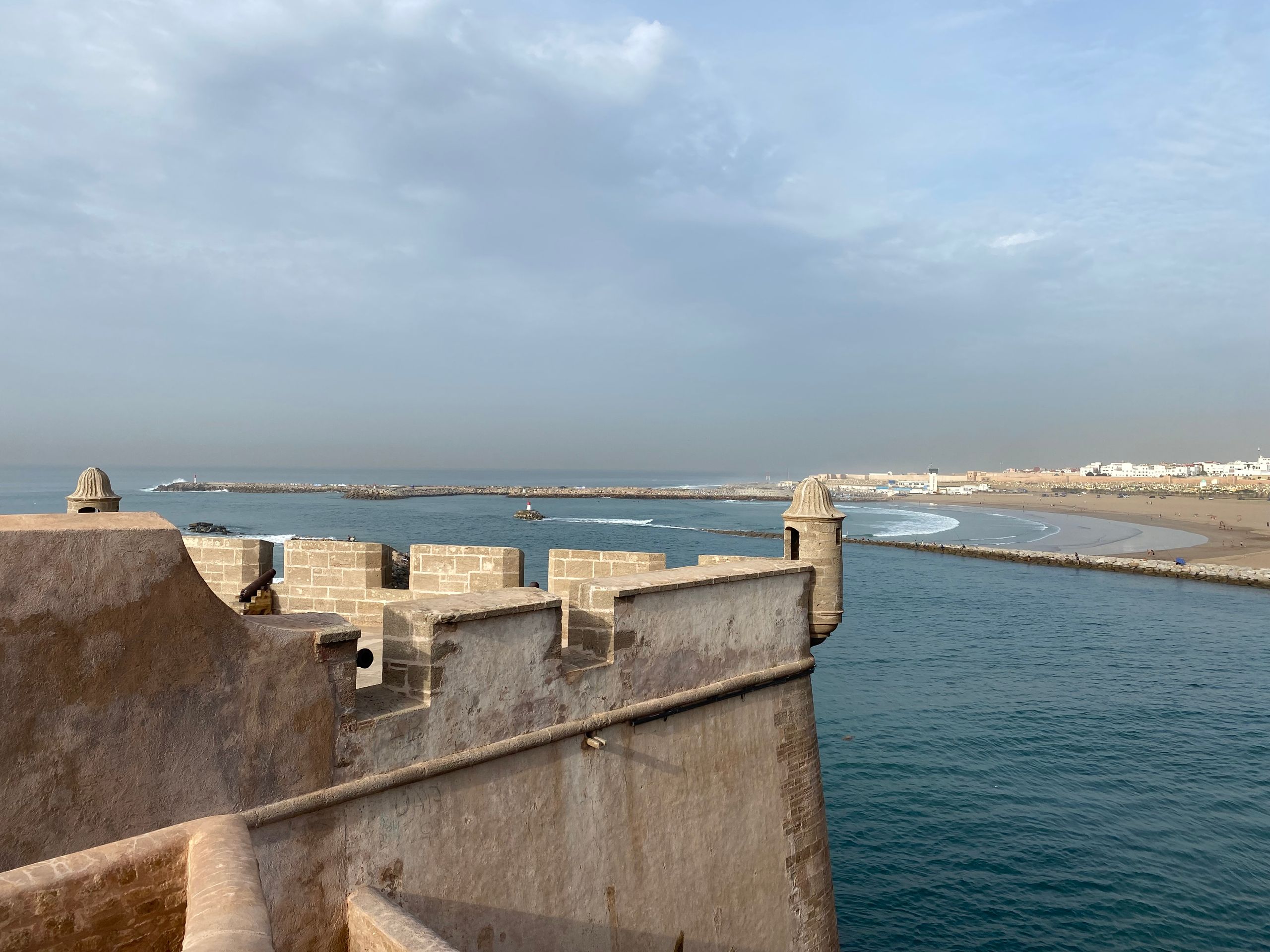 Am nächsten Morgen geht es früh los. Wir haben 400 km Fahrt vor uns und wollen auf der Strecke noch Casablanca und Rabat kurz besichtigen. Casablanca soll bis auf die Moschee Hassan II nicht besonders sehenswert sein, aber die Moschee soll sehr schön und als einzige Moschee Marokkos für Nichtmuslime zugänglich sein. Auf der Fahrt fällt uns leider ein, dass heute Freitag ist. Zum Freitagsgebet ist auch in der Moschee von Casablanca der Zutritt für Nichtmuslime untersagt. Wir beschränken uns auf ein Autosightseeing der Moschee, die direkt am Meer liegt und mit ihrem über 200 m hohen Minarettturm zu den größten Moscheen der Welt zählt. Gebaut wurde sie allerdings Anfang der 1990er und ist damit noch ein sehr junges Bauwerk. Ansonsten ist die 4-Millionen Metropole Casablanca eher uninteressant und wir fahren die rund 80 km weiter nach Norden. Hier liegt Rabat, die Hauptstadt und eine der vier Königsstädte Marokkos. Rabat liegt am Atlantik und an der Mündung des Flusses Bou Regreg. Vom Parkplatz am Meer machen wir einen Spaziergang am Stadtstrand mit den vielen Surfern entlang zur festungsähnlichen und malerischen Kasbah des Oudayas und von dort an der Uferpromenade des Flusses stadteinwärts. Die Szenerie am Fluss kommt uns doch bekannt vor, hier waren wir 1984 schon einmal! In Rabat residiert König Mohammed VI. Die Stadt erscheint (daher) wie geleckt, sogar der feine Flugsand wird mit Besen von der Uferstrasse gefegt. Umso erstaunter sind wir, dass der eigentlich schöne Stadtstrand sehr vermüllt ist.