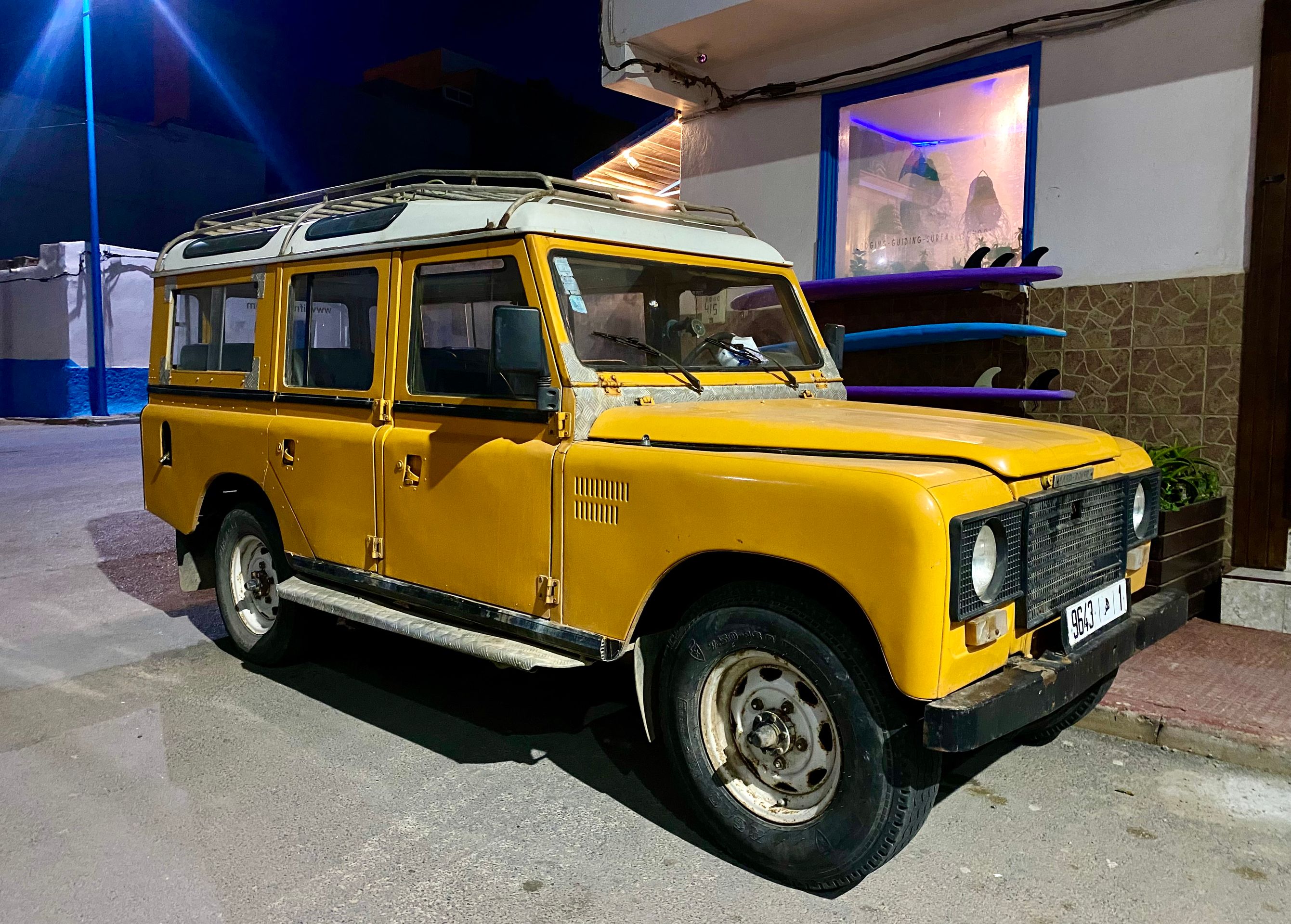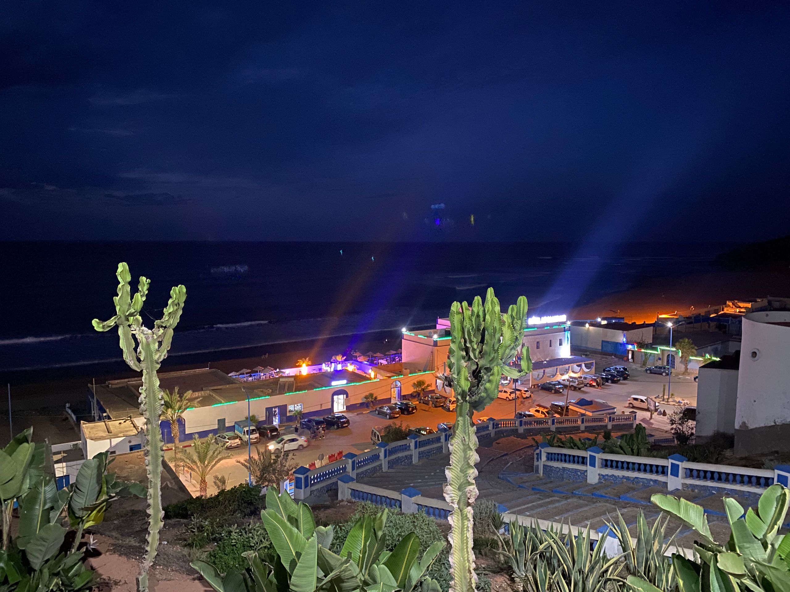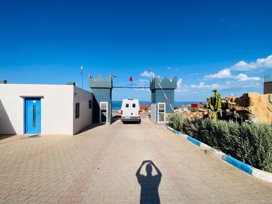 Am späten Nachmittag fahren wir noch die kurze Strecke zum nächsten Wellenreitspot Sidi Ifni weiter. Dies wird jetzt der südlichste Punkt unserer Reise in Marokko. Sidi Ifni liegt ungefähr auf halber Strecke zwischen Tanger Med, unserem Ankunftsort in Marokko, und Dakhla, unserem ursprünglichen Ziel. Dakhla befindet sich nochmal ca. 1.000 km südlich von hier und ist nur über eine endlose Wüstenpiste zu erreichen. Das ist in den verbleibenden Tagen nicht mehr zu schaffen. Also ist dieser Programmpunkt gestrichen! Als wir in Sidi Ifni ankommen, hat der Sandsturm noch mehr zugenommen. Die Luft ist durch den aufgewirbelten Staub und Sand gelblich trübe und es ist sehr warm. Wir übernachten auf dem örtlichen, sehr einfachen Campingplatz (CP) vor dem Strand und schlafen bei hohen Temperaturen von nachts um die 30° C mehr schlecht als recht. Morgens bekomme ich noch eine kurze Wellenreitsession hin, bevor der ablandige Wind endgültig auf Sturmstärke aufdreht und das Wellenreiten unmöglich macht. Auch der Aufenthalt auf dem CP ist im Sturm sehr ungemütlich.