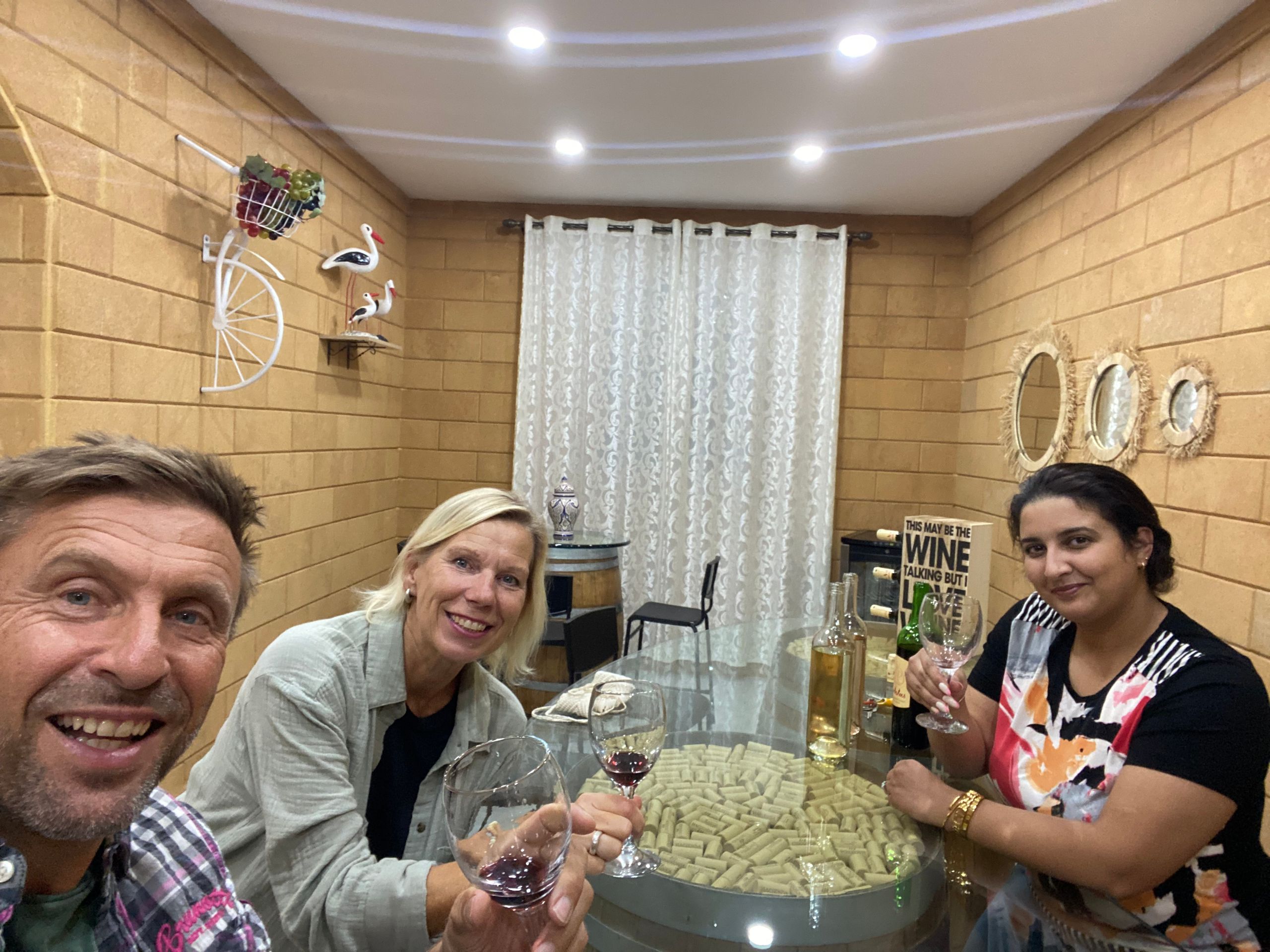 Von Rabat aus machen wir auf die ca. 50 km lange Strecke zu einem Weingut, dass Übernachtungen für Wohnmobile anbietet. Wir haben uns vorher per mail zur Weinprobe und zum Abendessen angemeldet und sind gespannt. Als wir auf der Hacienda de Cicognges (Hacienda der Störche, die dort tatsächlich nisten) ankommen, sind wir das einzige Wohnmobil weit und breit und es sieht auch sonst sehr einsam aus. Aber nach einer Weile holt uns aber Wafae, die Dame des Hauses ab und wir haben eine leckere Weinverkostung, in der wir viel über die Geschichte des Weinanbaus in Marokko erfahren. Anscheinend trinken doch sehr viele Marokkaner Wein, aber nie zum Essen, wie wir erfahren Aus der Verkostung dürfen wir uns eine Flasche aussuchen, die dann zum Abendessen serviert wird. Der Rotwein der Hacienda ist übrigens köstlich! Und die Tajine, die Wafae für uns zubereitet hat, ist die beste, die wir in Marokko gegessen haben. Satt, zufrieden und etwas weinselig fallen wir in unseren Van und schlafen tief und fest.