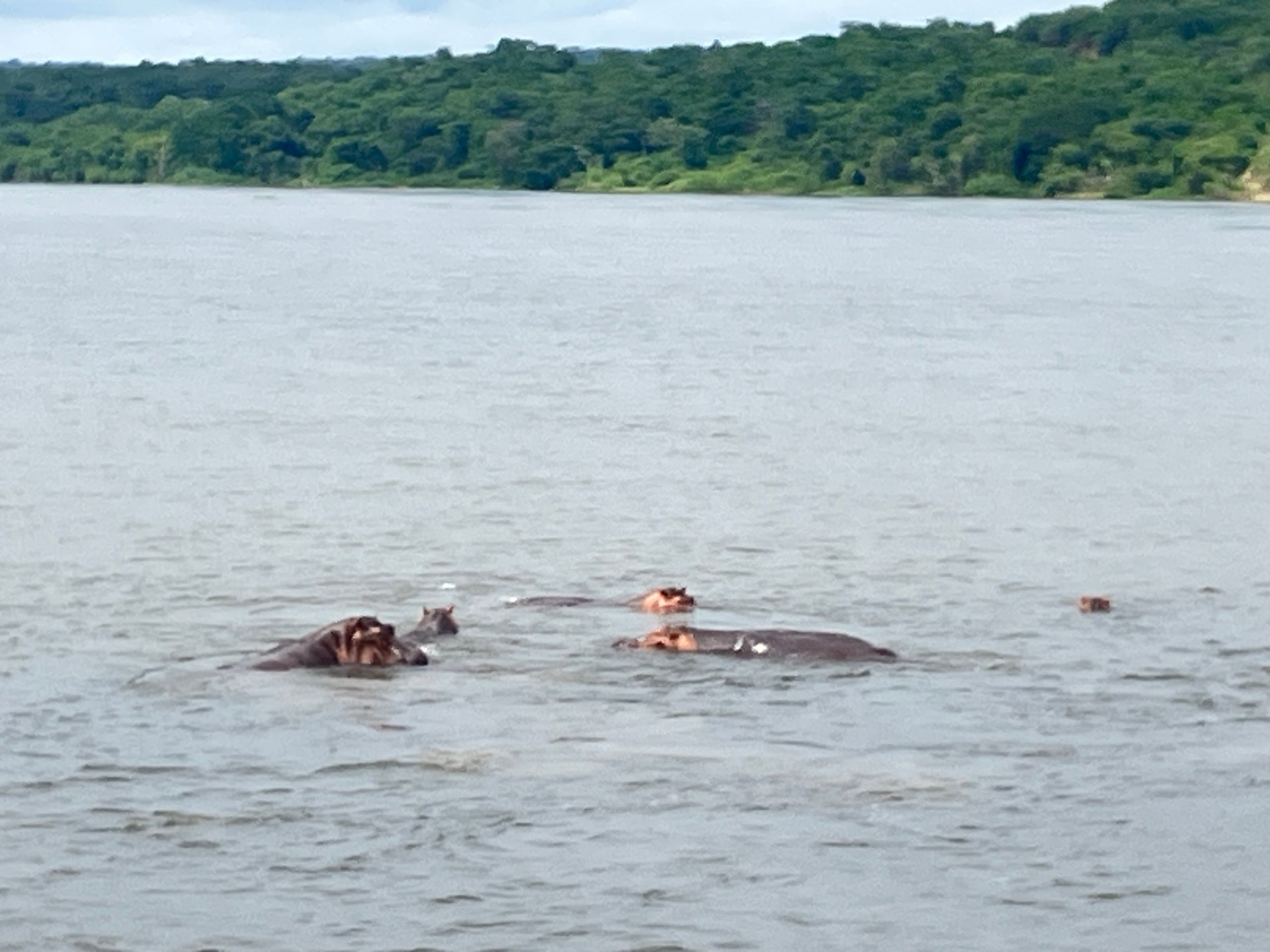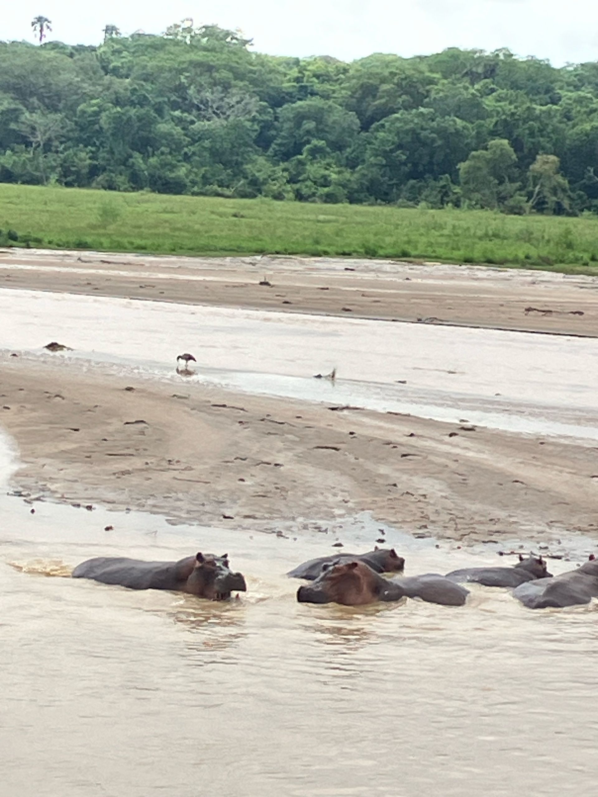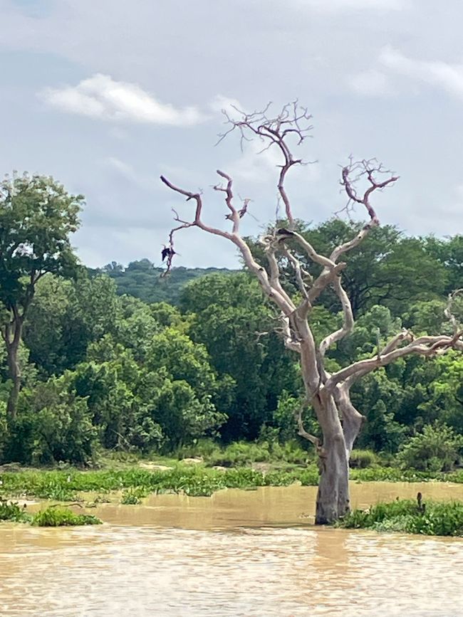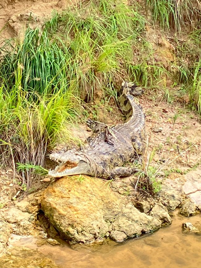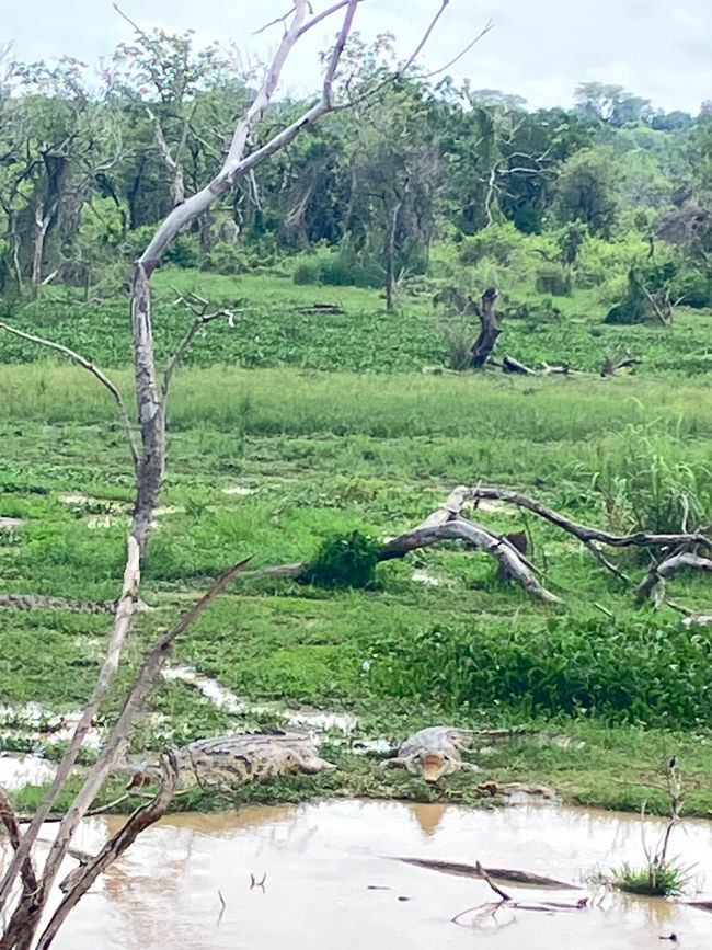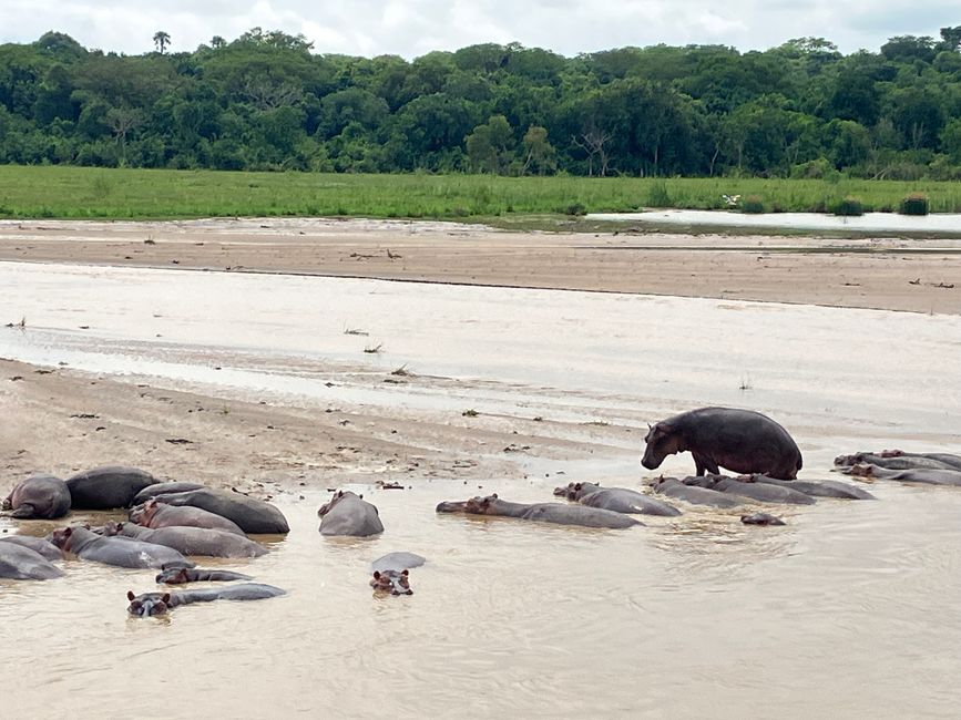 Auf dem Weg dorthin sehen wir zahlreiche Nilpferde und Nilkrokodile am Uferrand liegen.