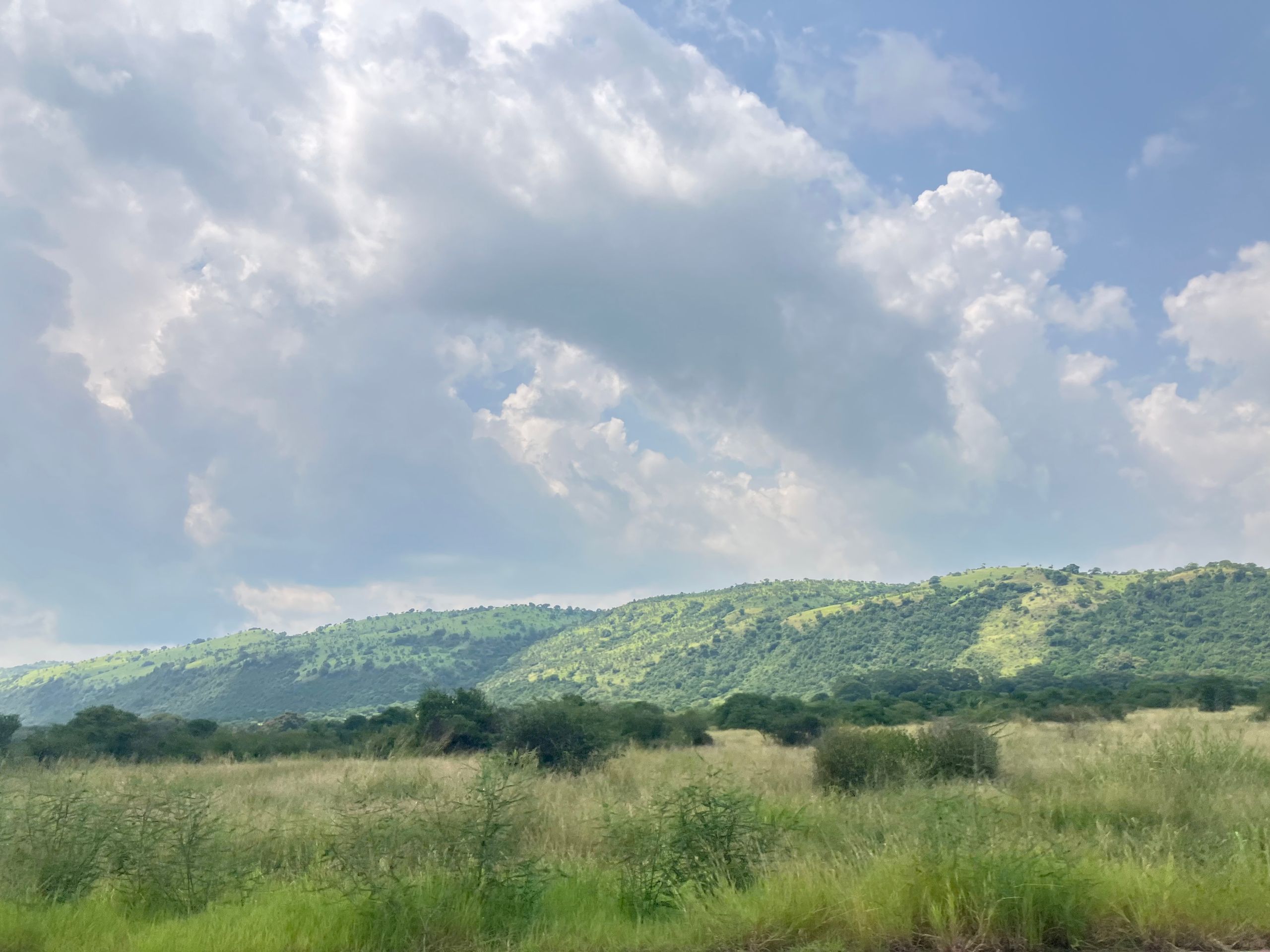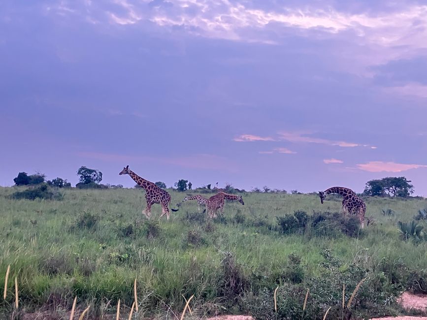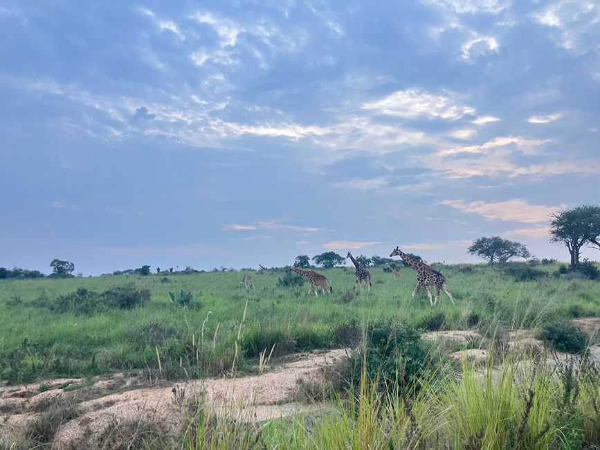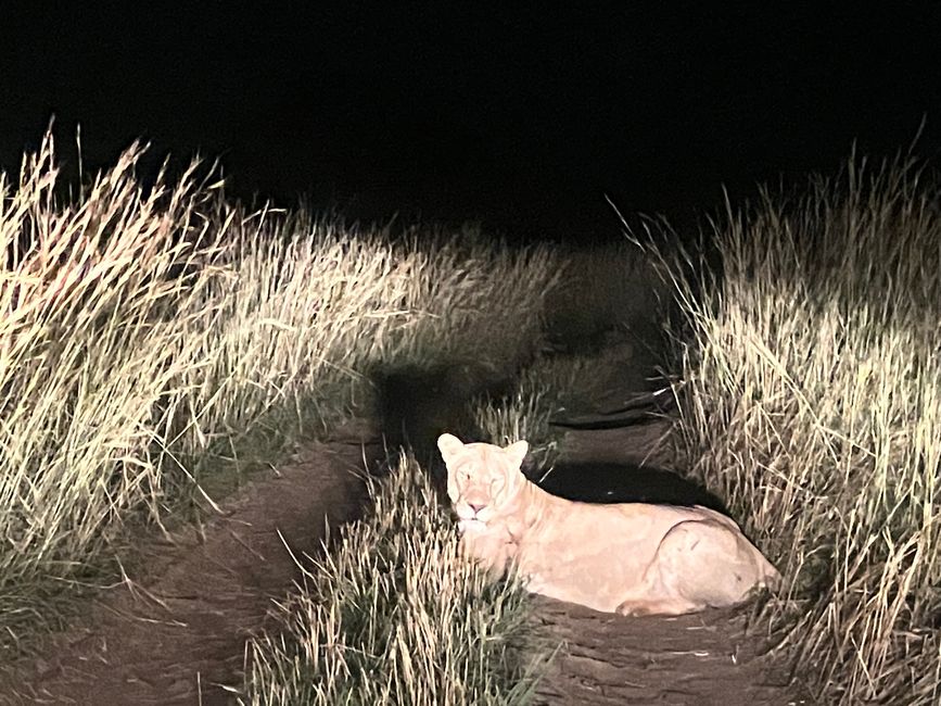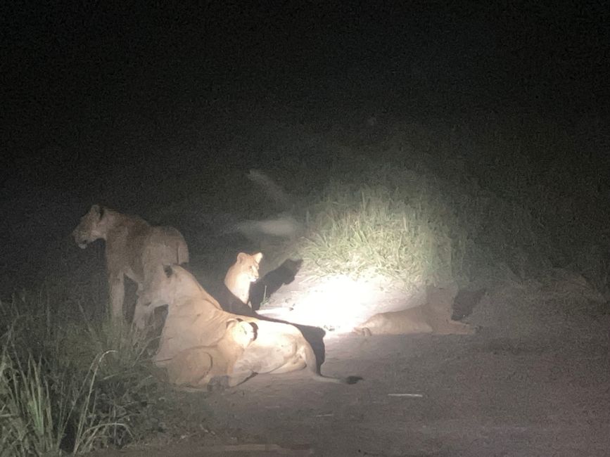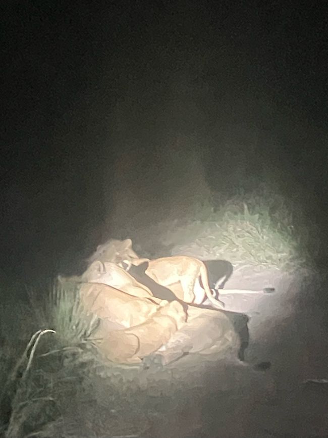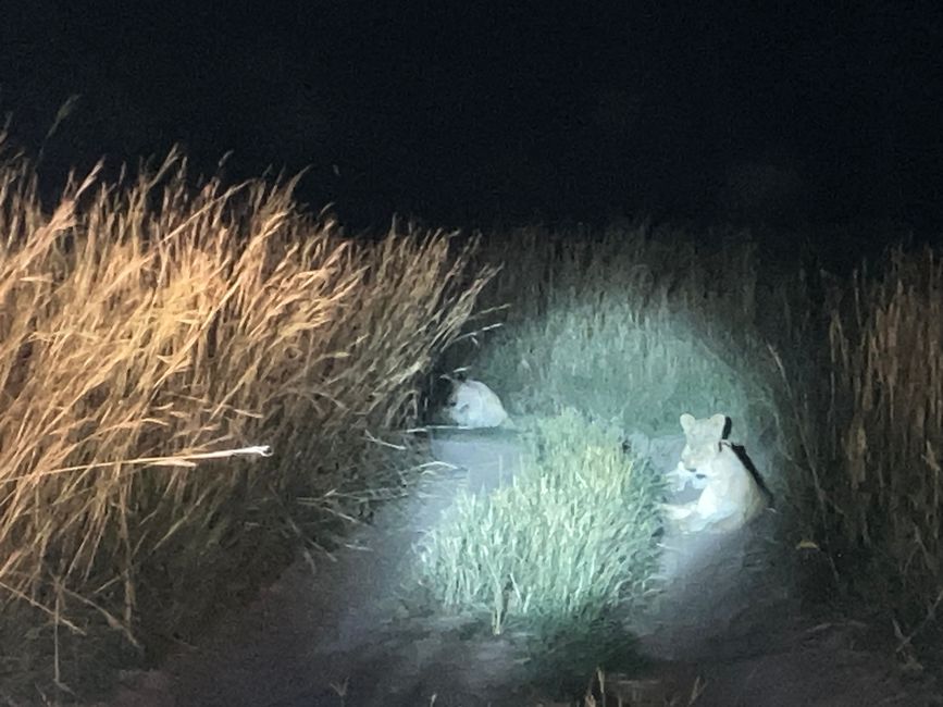 Und schon stürzen wir uns ins nächste Abenteuer. Mit einer Rangerin auf dem Rücksitz brechen wir auf zu einer Nachtsafari. Mit Gewehr und einer starken Lampe ausgerüstet, weist sie uns den Weg weit in den Park hinein. Ziel ist es, eines der Löwenrudel zu entdecken! Zunächst bekommen wir relativ wenige Tiere zu Gesicht: Die Landschaft ist unglaublich grün, doch dadurch verschwinden viele Tiere in der dichten Vegetation. Jedoch gelingt es Büffeln und Giraffen kaum, sich zu verstecken 😁