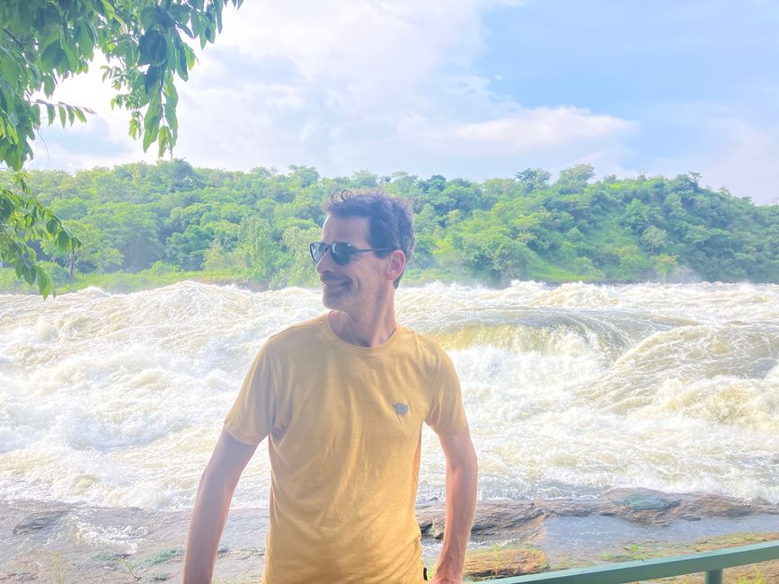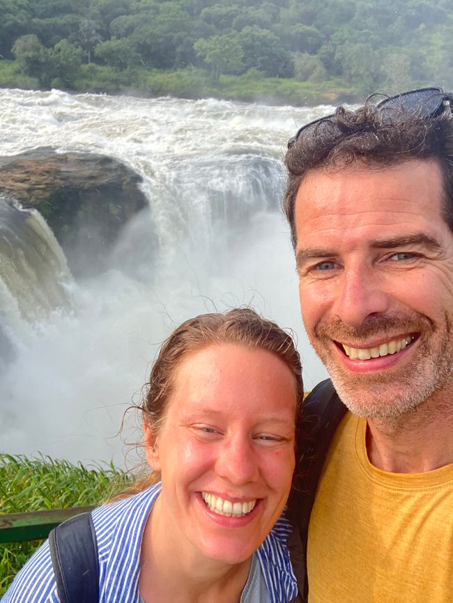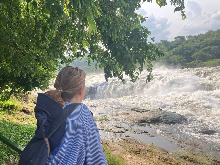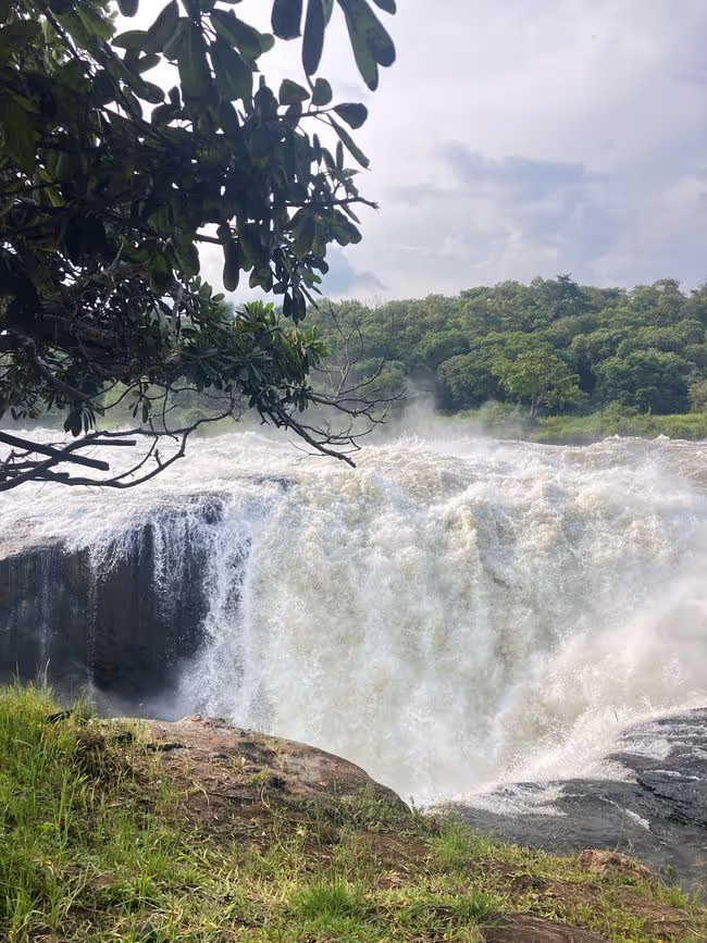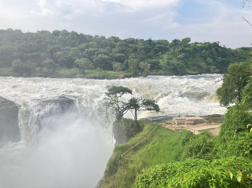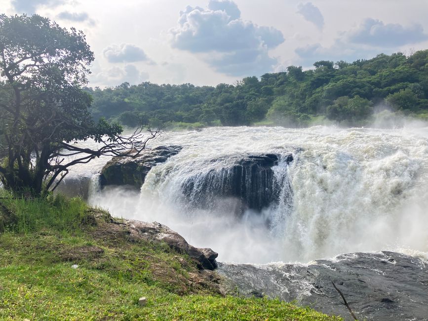 Hier stürzt der Viktoria-Nil durch eine nur sieben Meter breite Schlucht 43 Meter in die Tiefe und bildet dabei einen der mächtigsten Wasserfälle Afrikas.