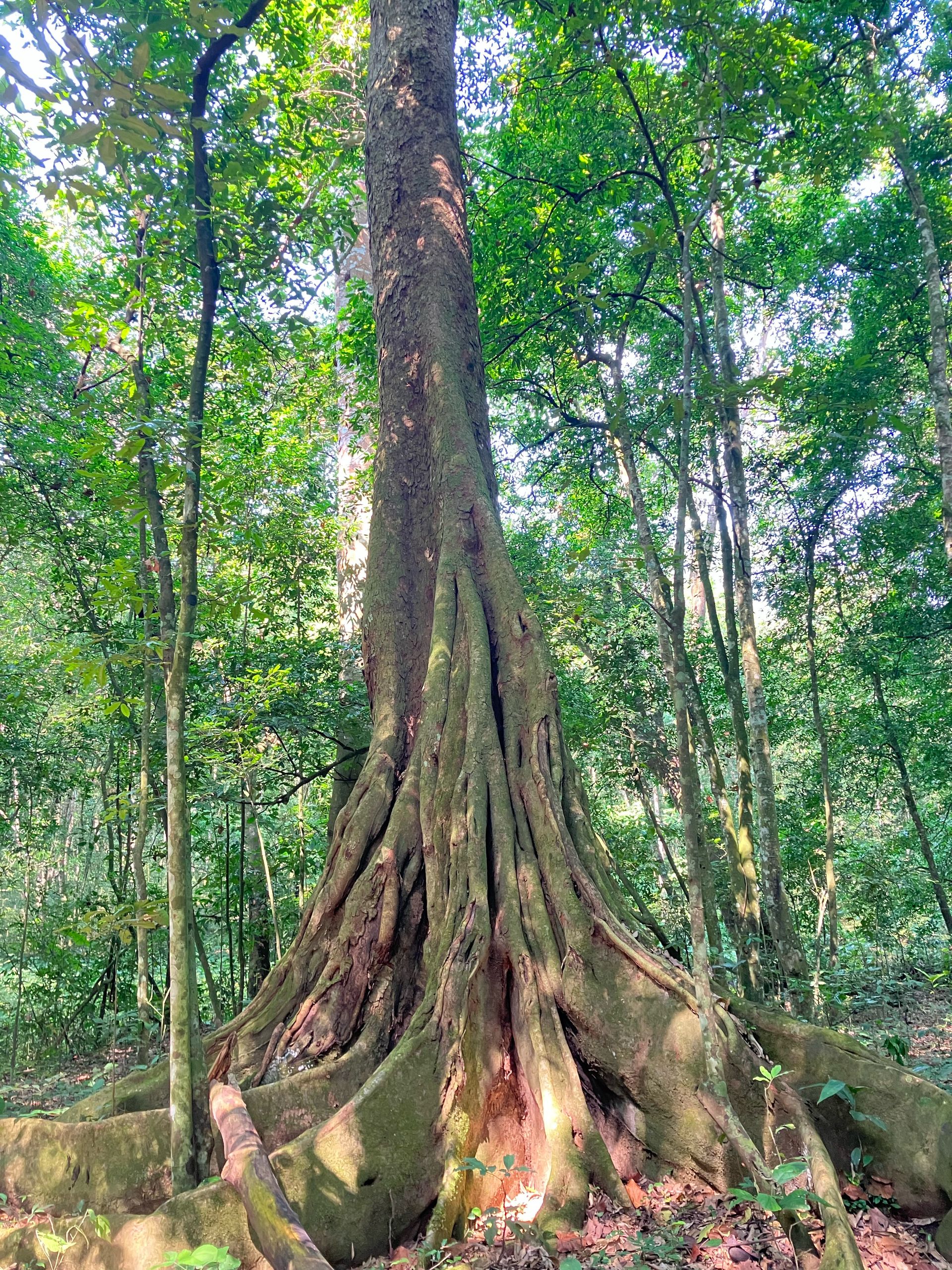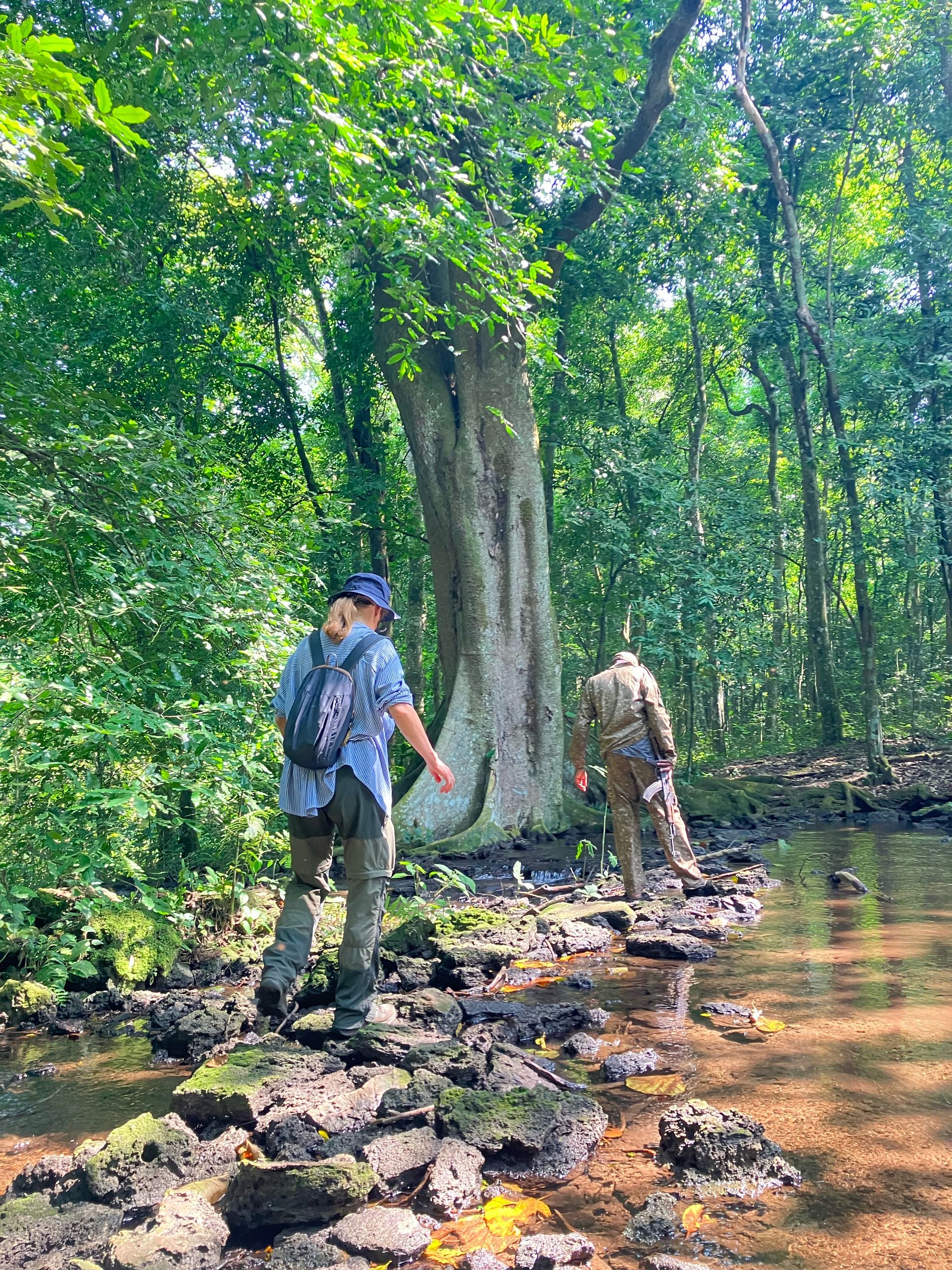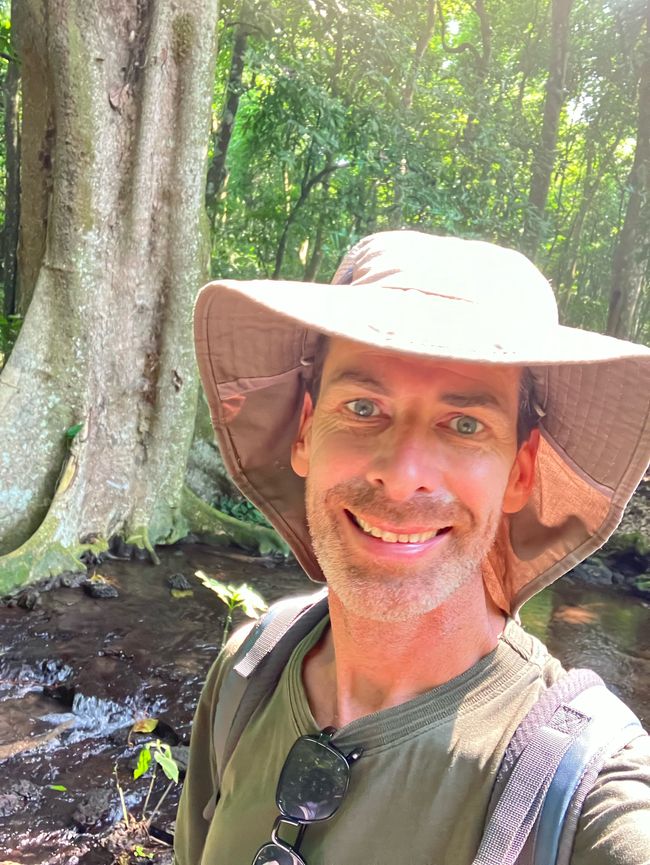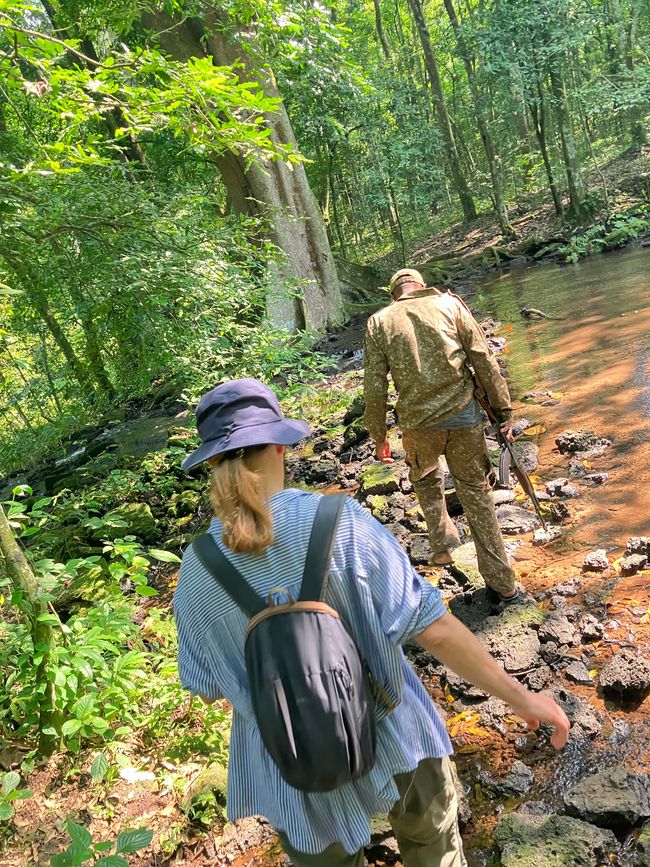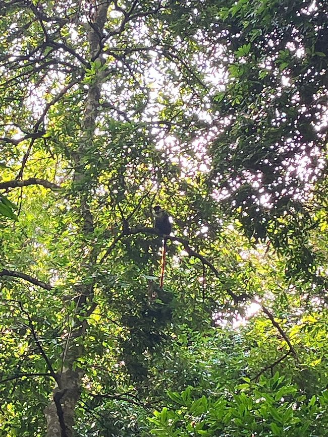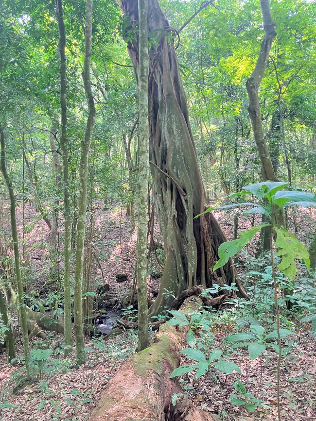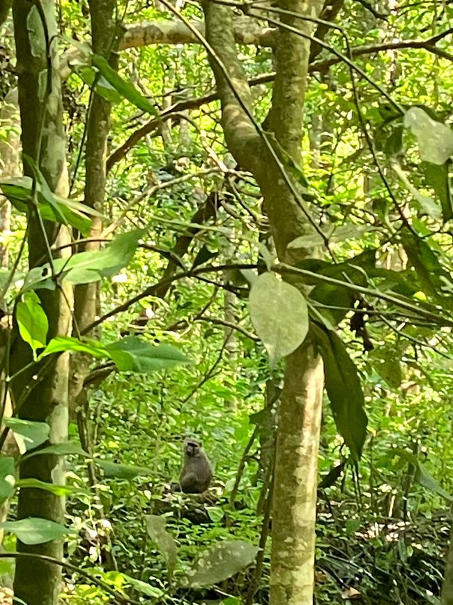 Der Wald beherbergt gleich mehrere Affenarten, da sich sehr viele Feigenbäume hier befinden! Sie sind bei den meisten Affen heiß begehrt 😋Bereits zu Beginn unserer Wanderung sehen wir Rotschwanz-Meerkatzen in den Bäumen. Diese Affen sind sehr scheu und verstecken sich rasch zwischen den Zweigen als unser Blick auf sie fällt.