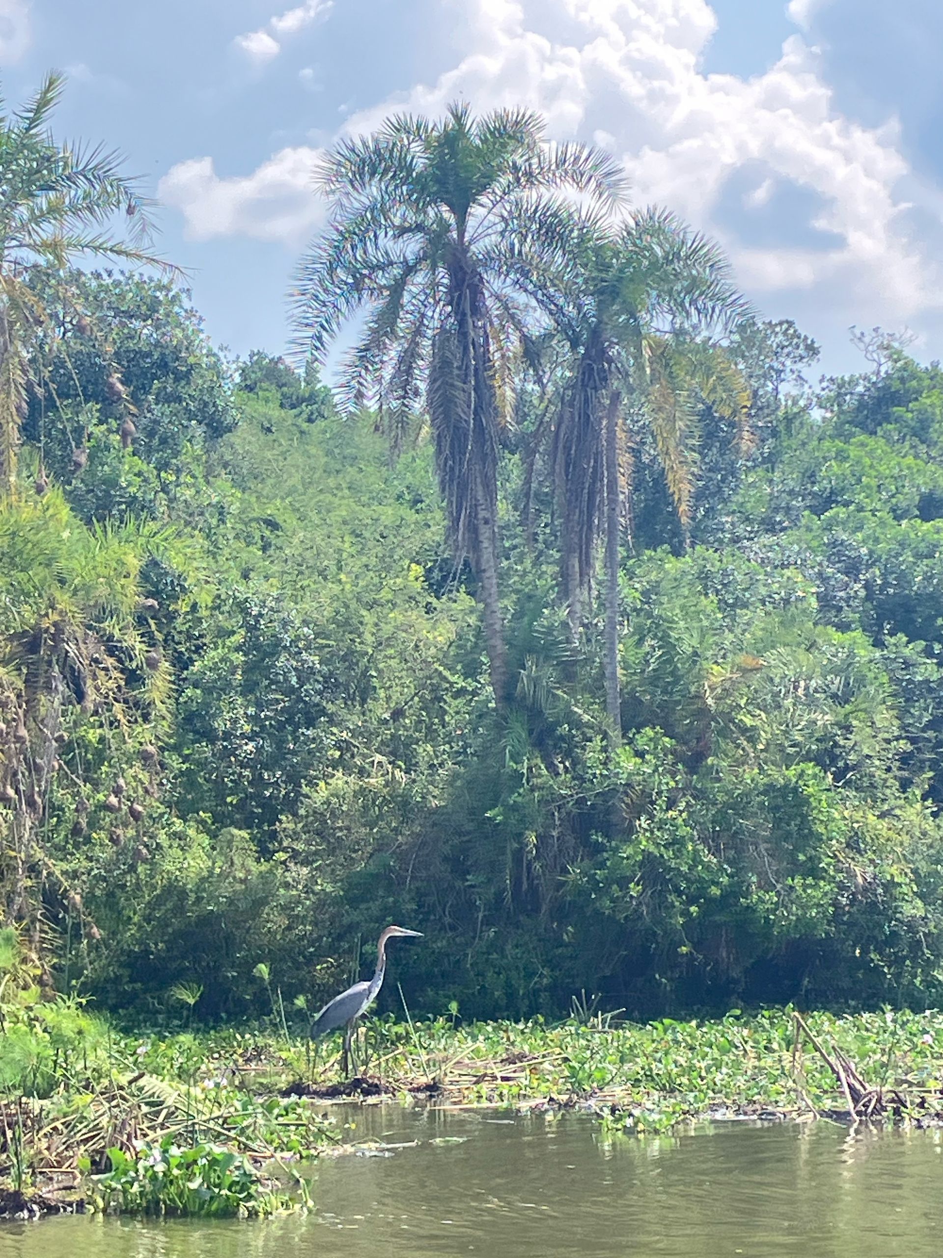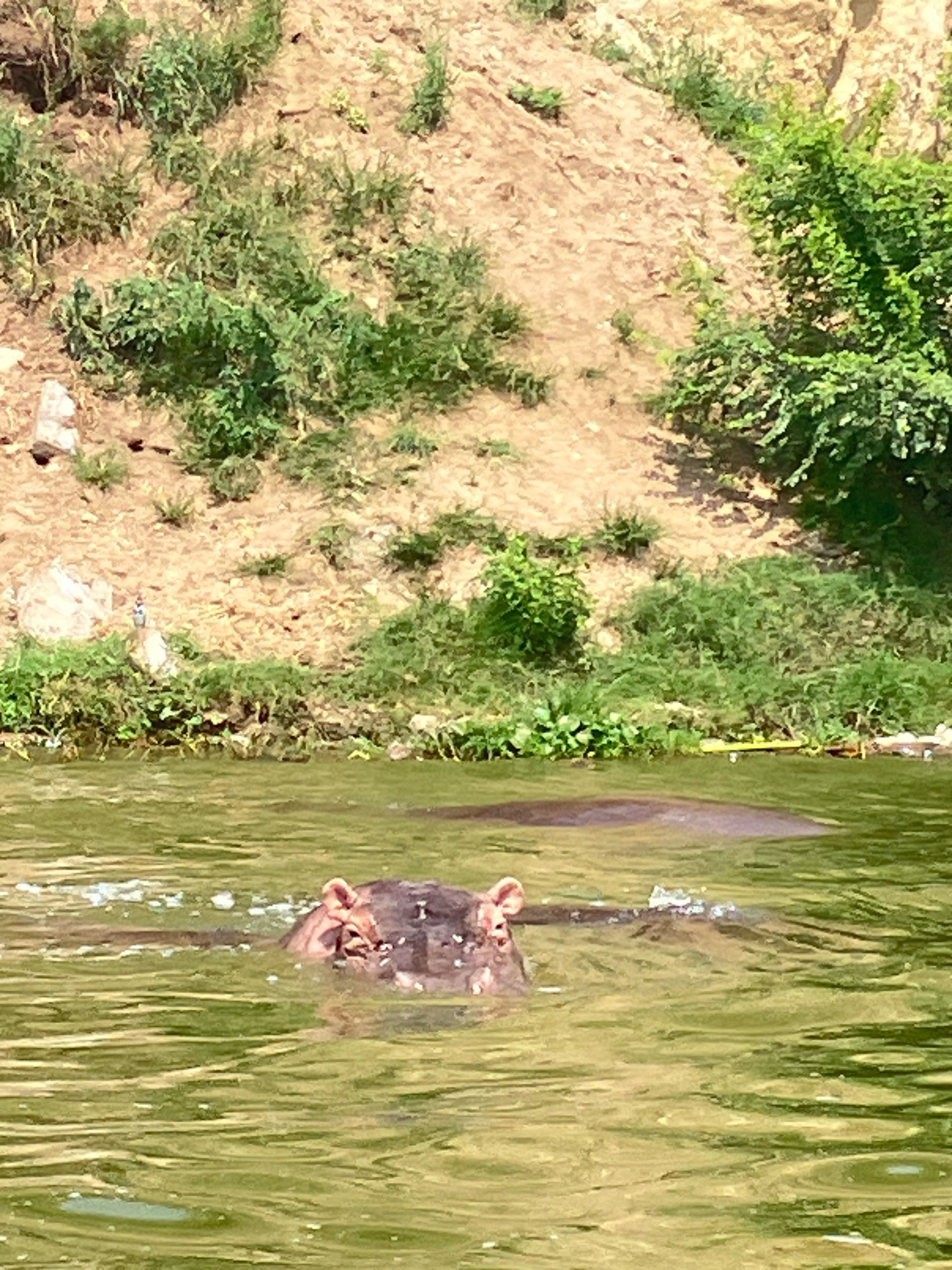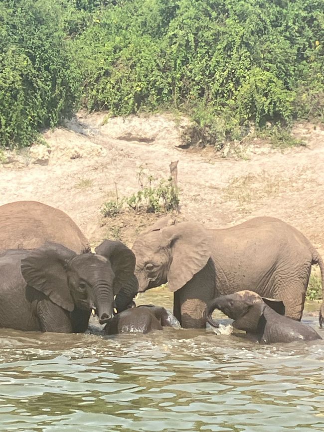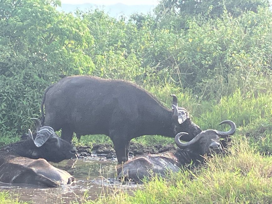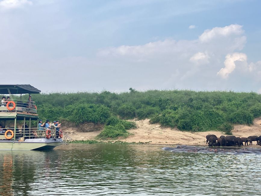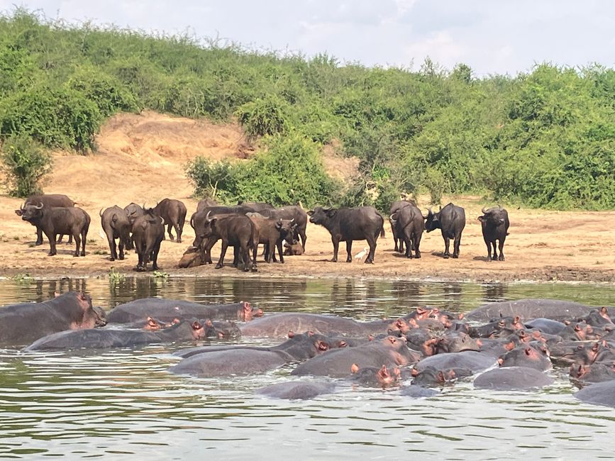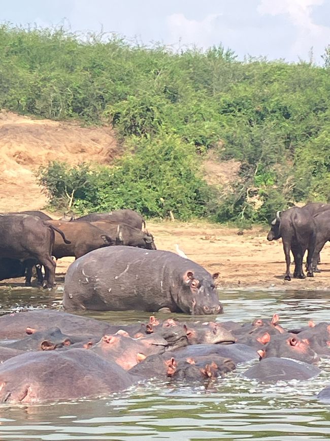 Wir starten als Erstes mit der Bootstour und werden nicht enttäuscht! An den Ufern des Kanals bietet sich uns ein wahres Schauspiel. Zahlreiche Flusspferde liegen gemütlich beisammen, direkt dahinter eine Herde Büffel.