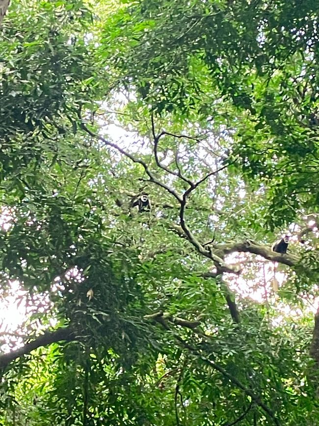In den Baumwipfeln über uns erkennen wir schwarz-weiße Colobus, die uns neugierig beobachten.
