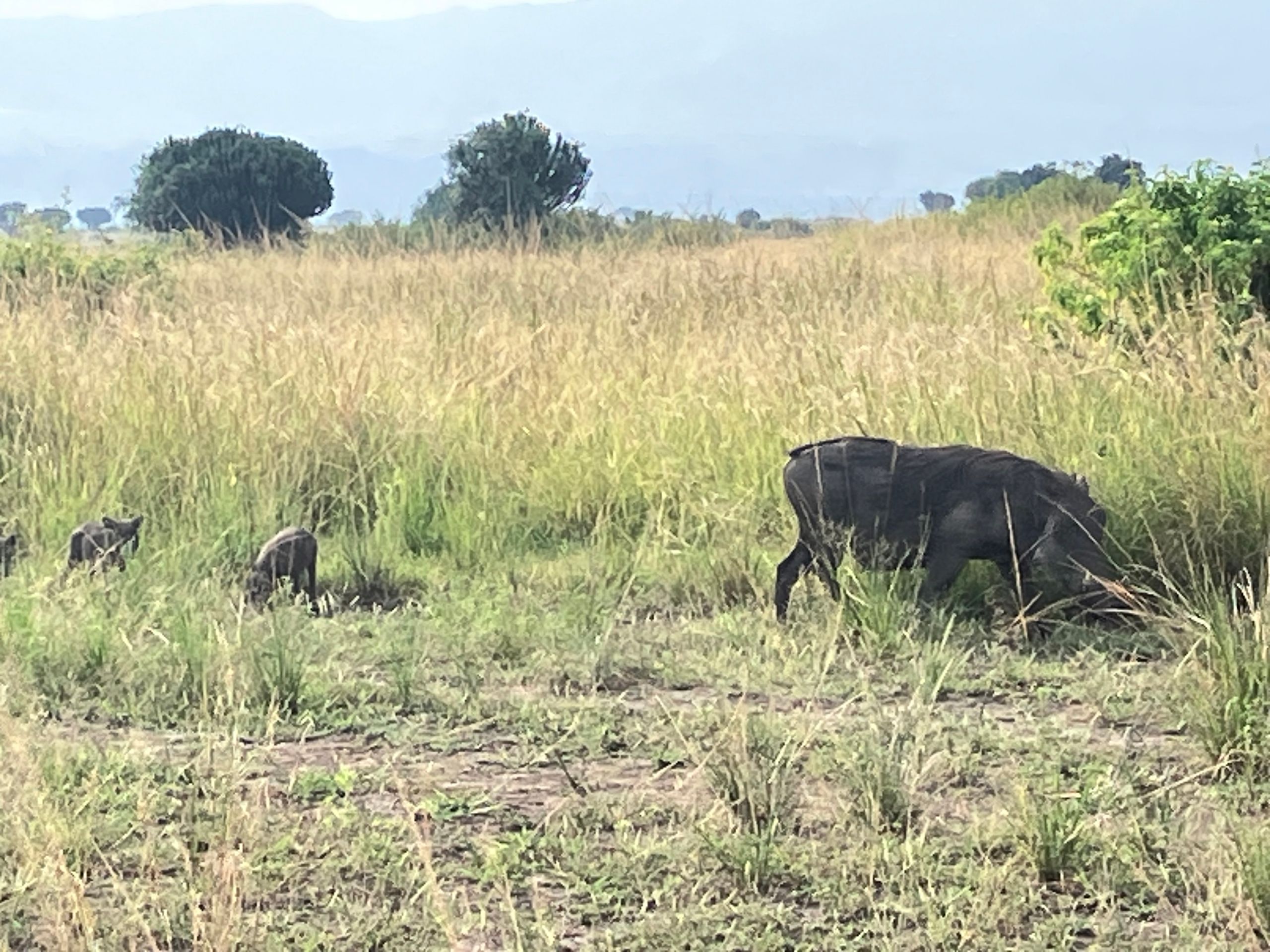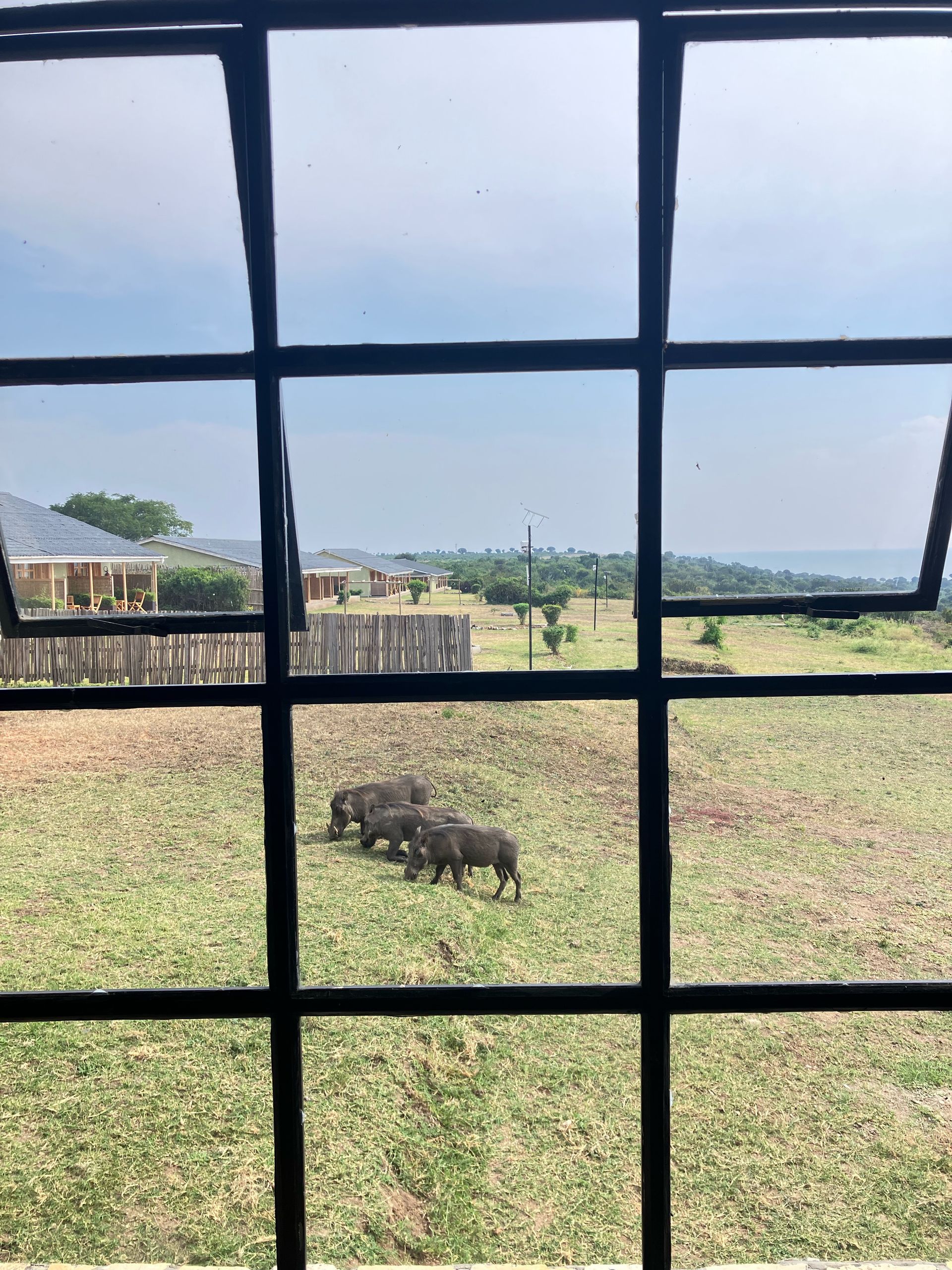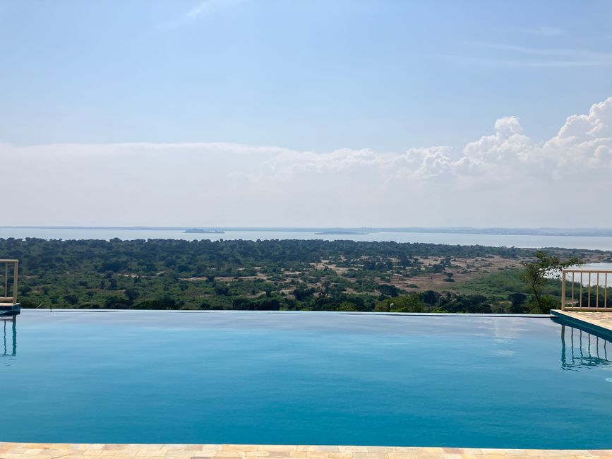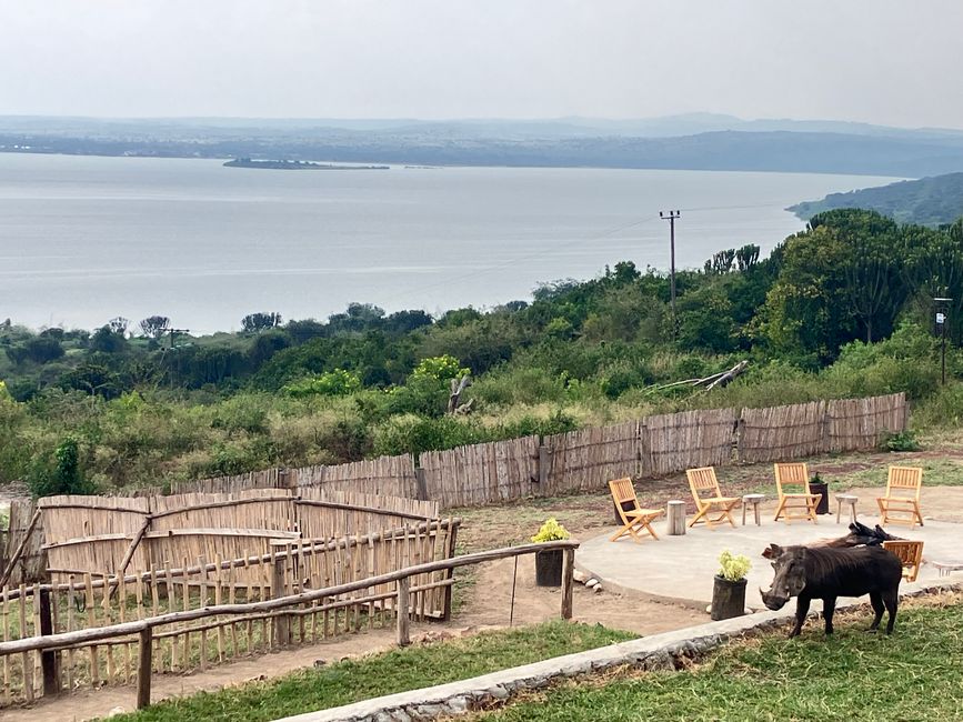 Die Halbinsel ragt in den Kazinga-Kanal hinein. Dort legen wir Station bei einer luxuriösen Lodge ein. Der Blick auf den Lake Edward ist fantastisch und wir bekommen zudem Gesellschaft von meheren Warzenschweinen, die das saftige Gras "abmähen". Eine Übernachtung kostet hier wohl mehrere hundert Euros…