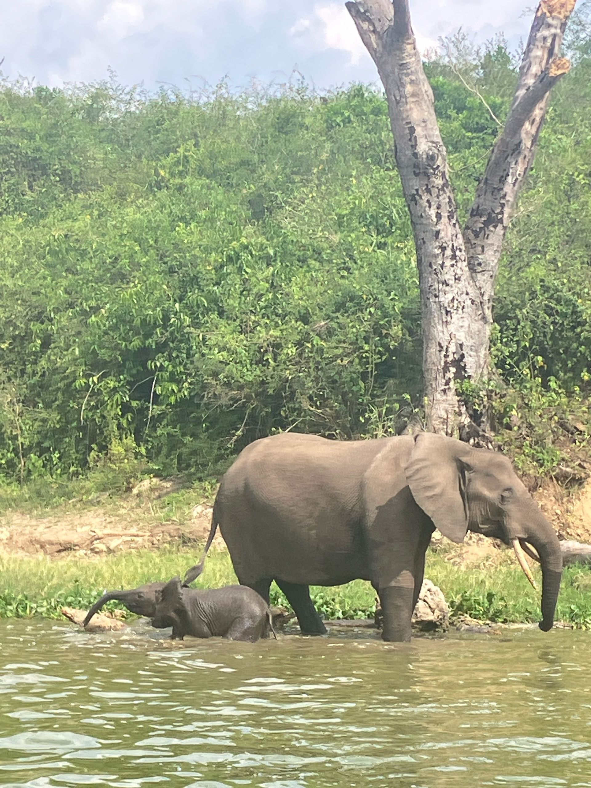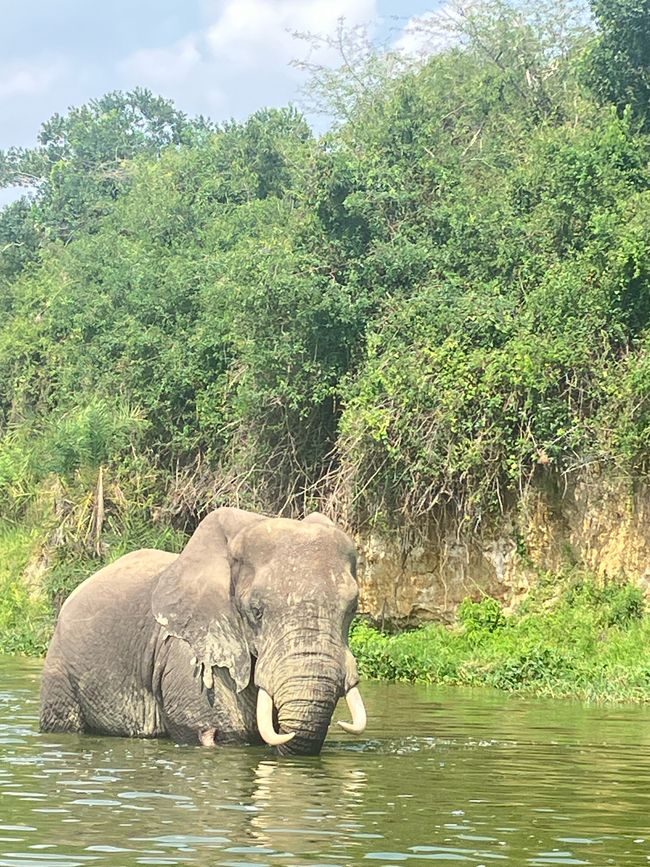 Als Nächstes beobachten wir einen einzelnen großen Elefanten durchs seichte Wasser waten. Er grast an den Büschen am Uferrand. Zudem verschafft das Wasser ihm eine willkommene Abkühlung. Übrigens sind Elefanten trotz ihrer Größe ausgezeichnete Schwimmer! Wer hätte das gedacht 😊