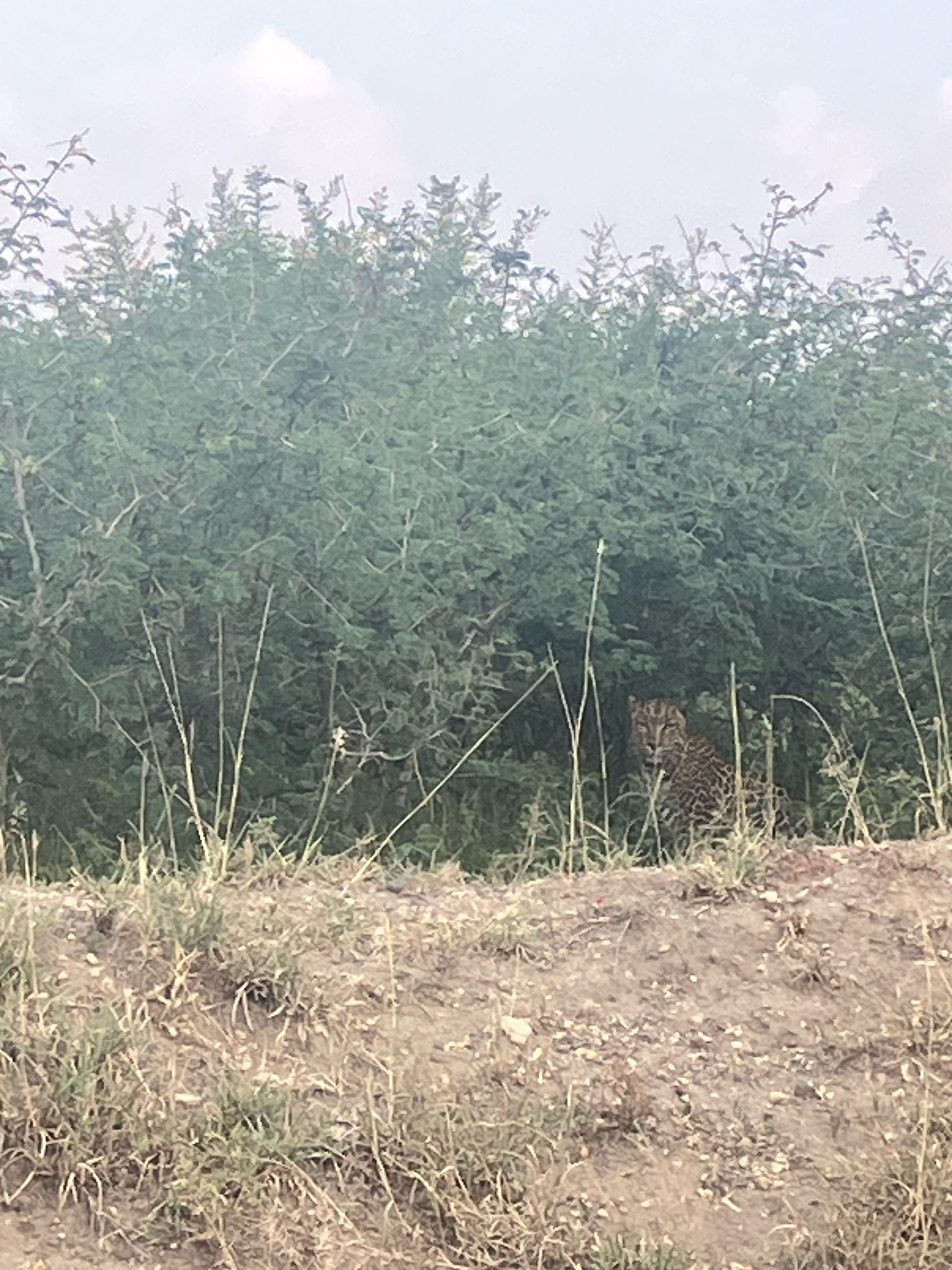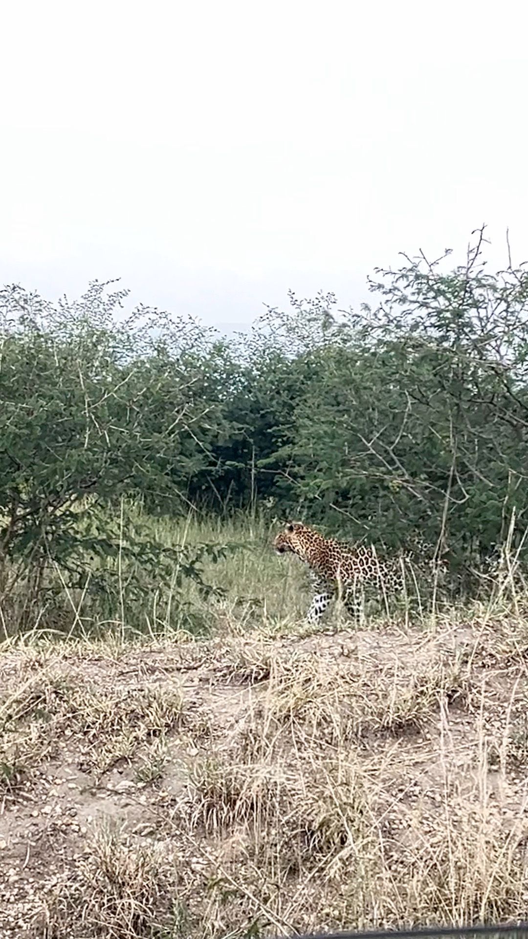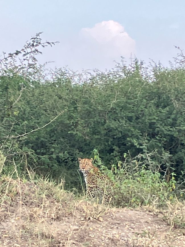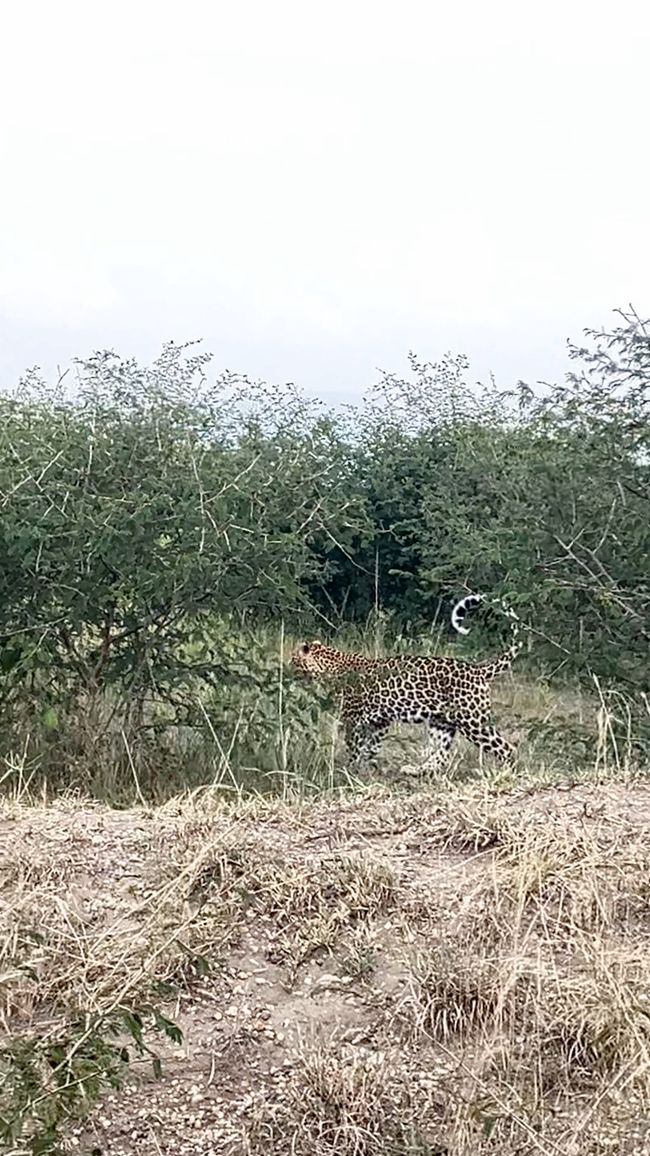 Es wird langsam Zeit und wir fahren zurück Richtung Hauptstraße! Auf halber Strecke haben wir eine absolut magische Begegnung: Ein Leopard schlendert gemächlich am staubigen Straßenrand entlang. Wir bleiben mit unserem Auto stehen - Auge in Auge mit dieser majestätischen Großkatze!