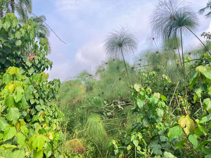 Der Sumpf selbst ist dicht bewachsen und gleicht einem Urwald: Wasserläufe, dichter Papyrus, hohe Bäume – und immer wieder das Rascheln im Geäst über uns.