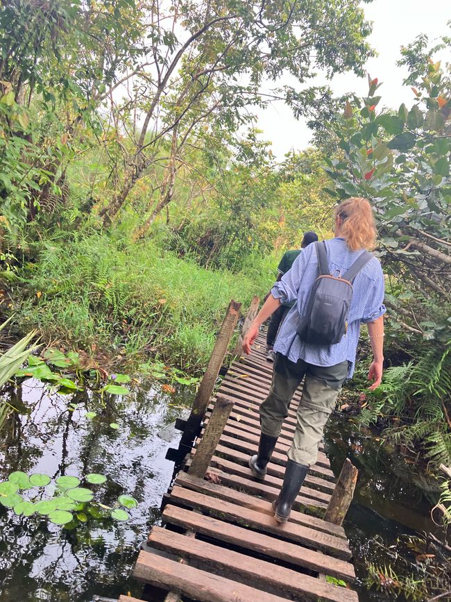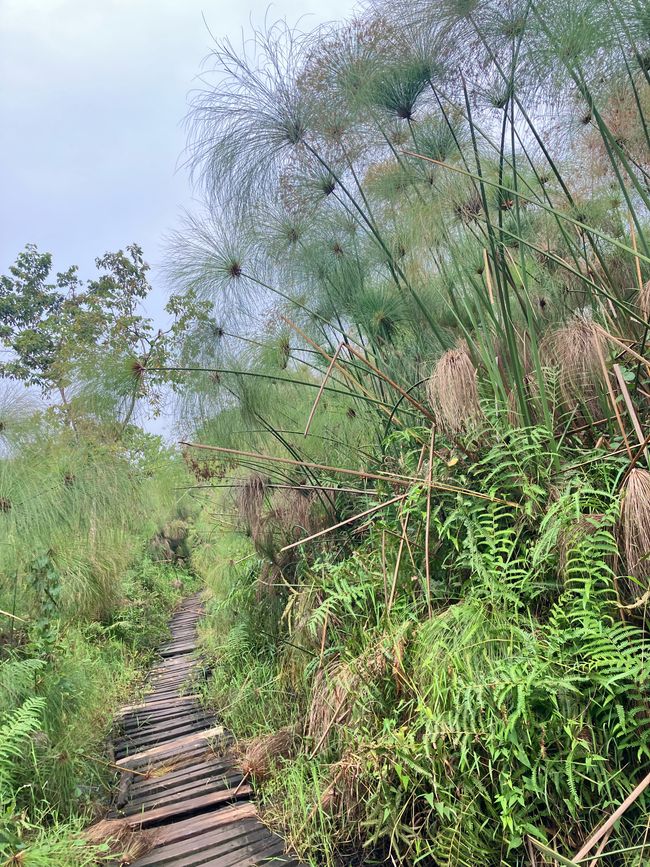 Am zweiten Tag besuchen wir ein völlig anderes Ökosystem: die Bigodi Wetlands, ein geschütztes Feuchtgebiet am Rande des Kibale-Nationalparks. Gemeinsam mit einem lokalen Guide und in Gummistiefeln starteten wir die Tour auf Holzstegen und schmalen Pfaden durch das Sumpfgebiet.