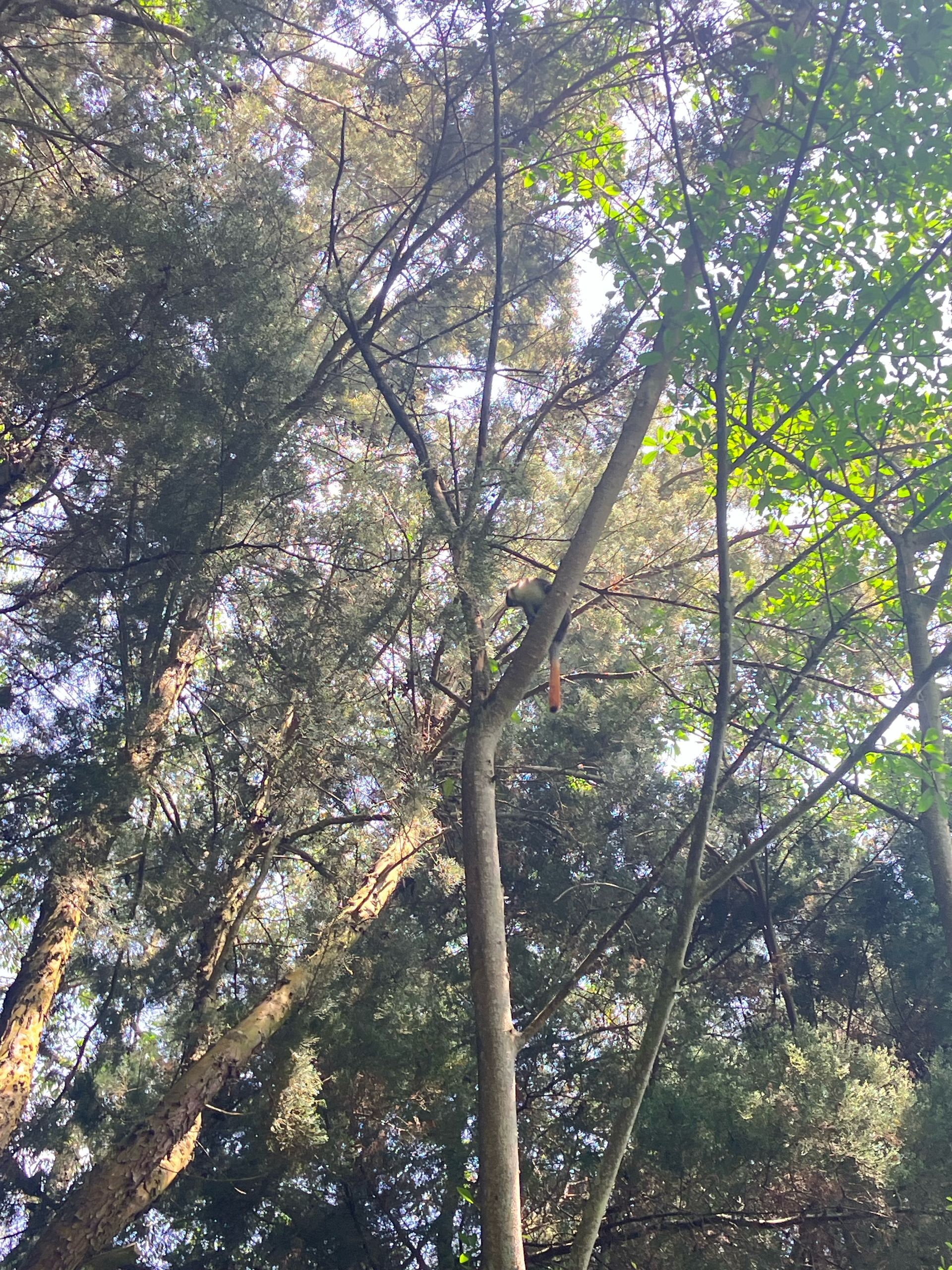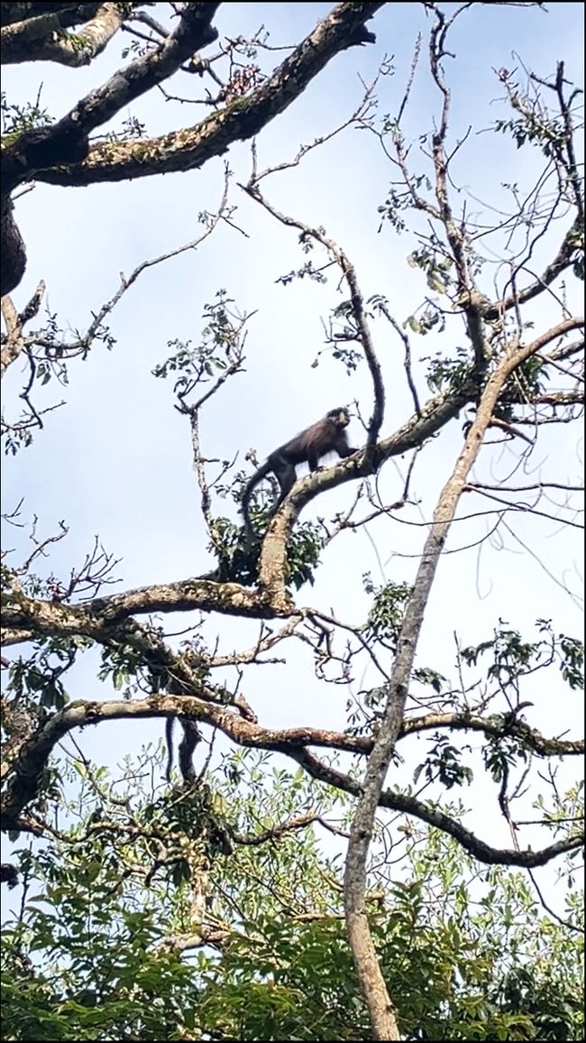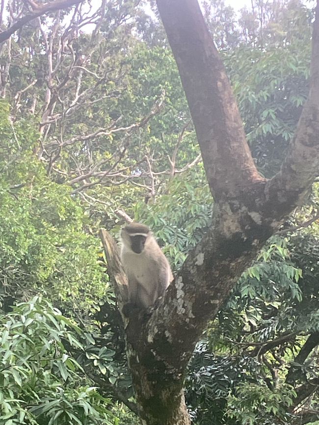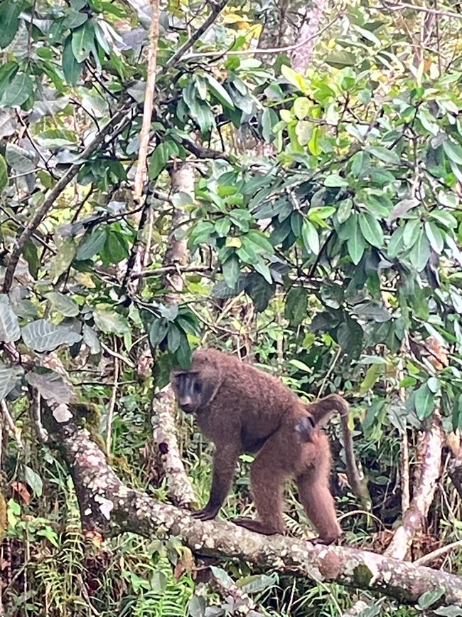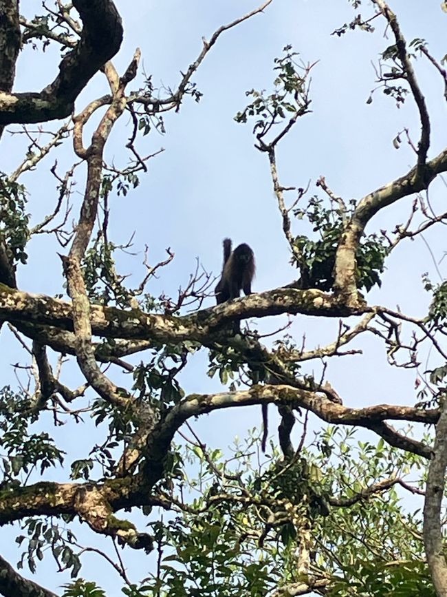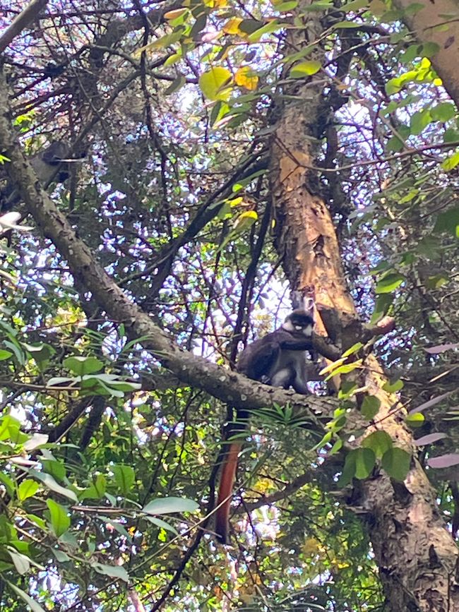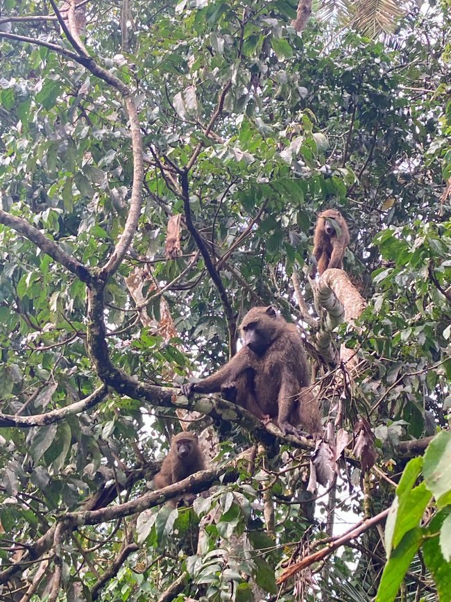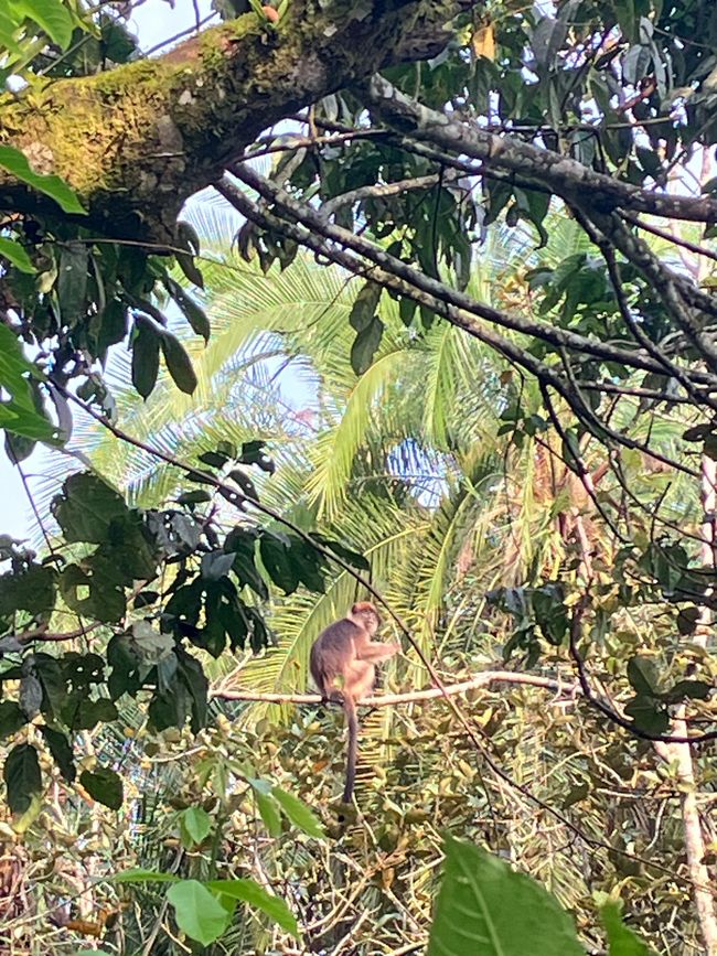 Schon zu Beginn treffen wir auf zahlreiche Affen, darunter Rotschwanzaffen und Meerkatzen. Sie klettern in den Bäumen und bleiben auf Abstand.