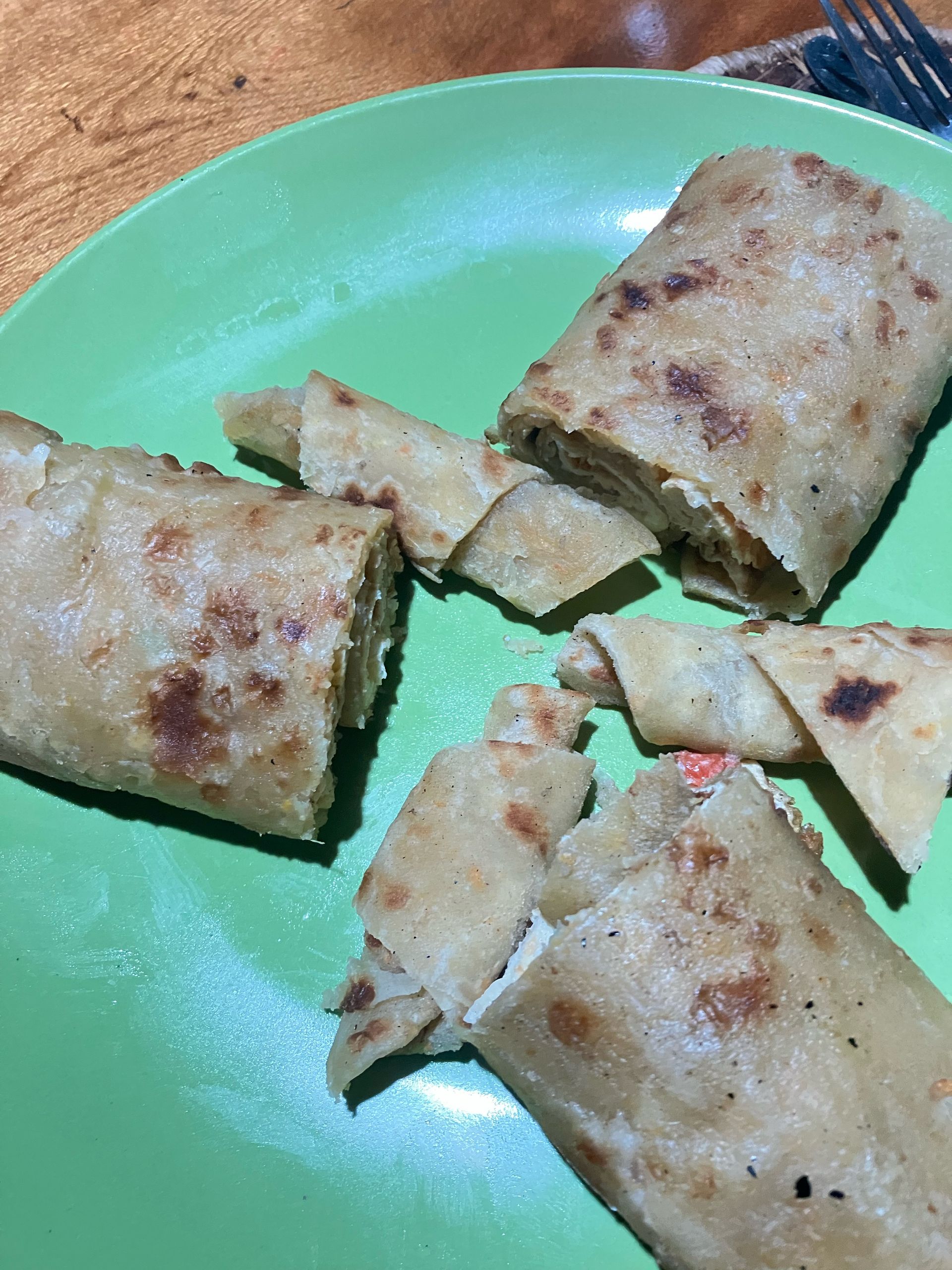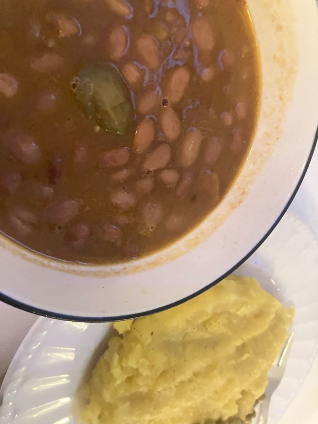 Zurück in Fort Portal stärken wir uns erstmal: Traditionell gibt es Matoke (ein Brei aus grünen Kochbananen) mit Bohnen.
