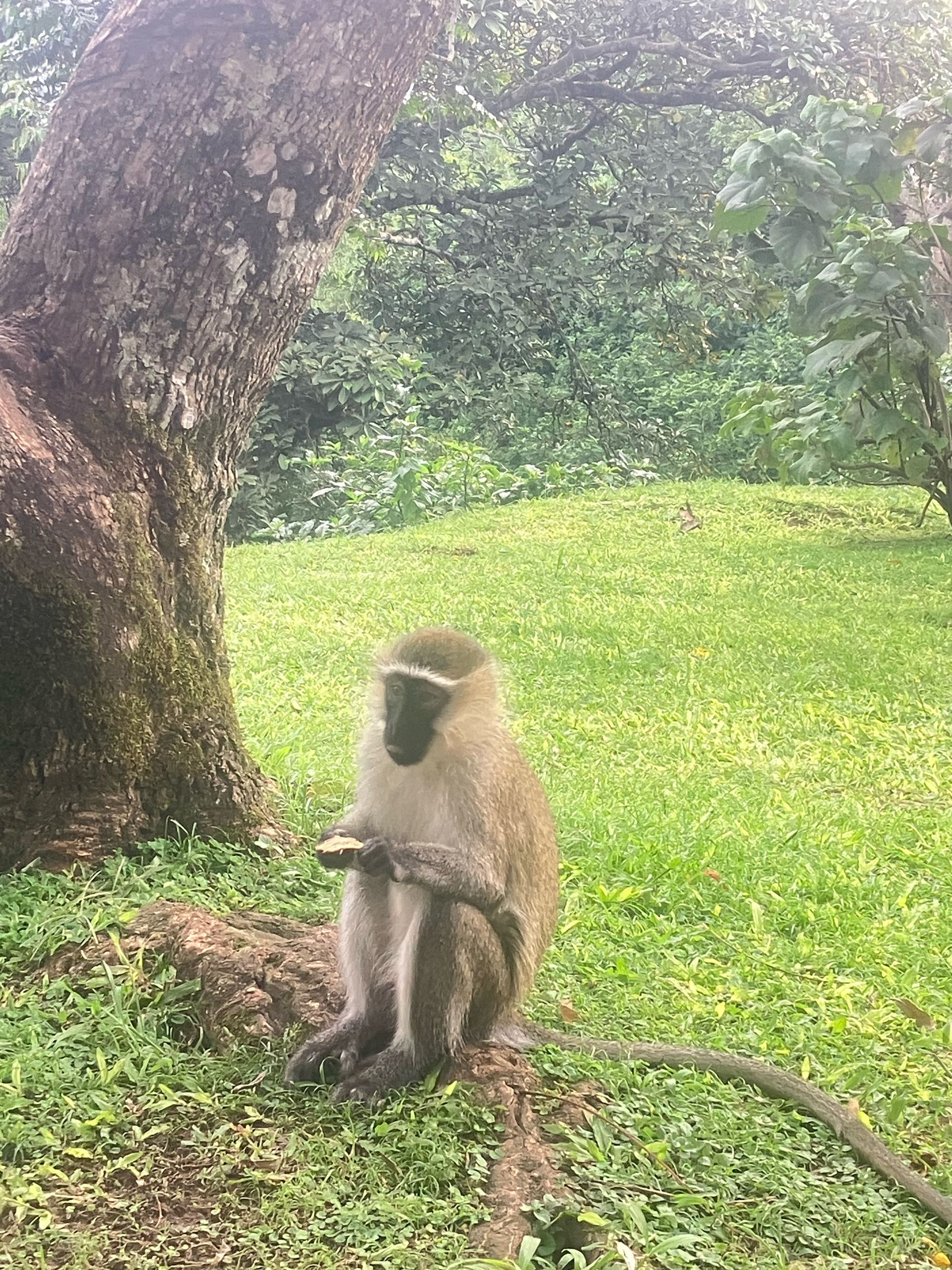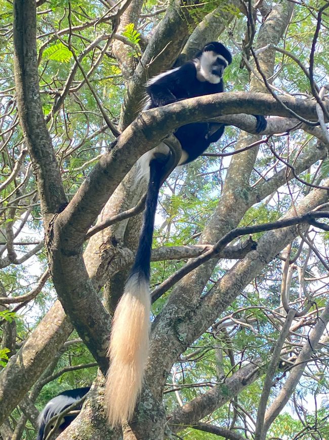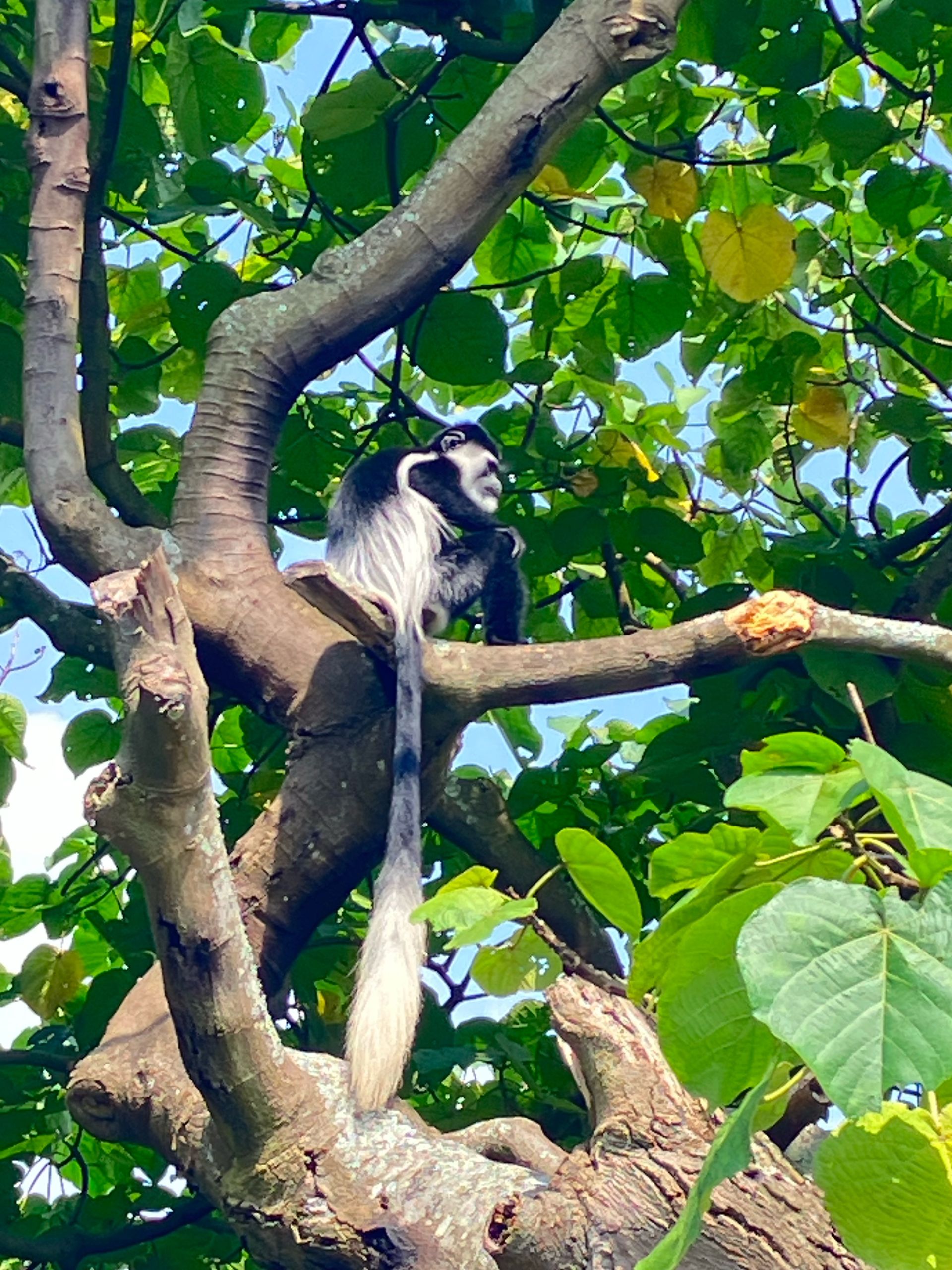 Für unseren ersten Ausflug treffen wir uns mit dem sympathischen Guide Robert am Ufer des Lake Nkuruba. Dort befindet sich eine sehr schön angelegte Lodge, die sich für Übernachtungen eignet. Außerdem ist das Gelände ein Naturschutzgebiet, dass viele Affen anzieht. Sie laufen überall herum und klettern in den Bäumen: schwarz-weiße Colobus, Rotschwanz-Meerkatzen und Vervet-Affen.