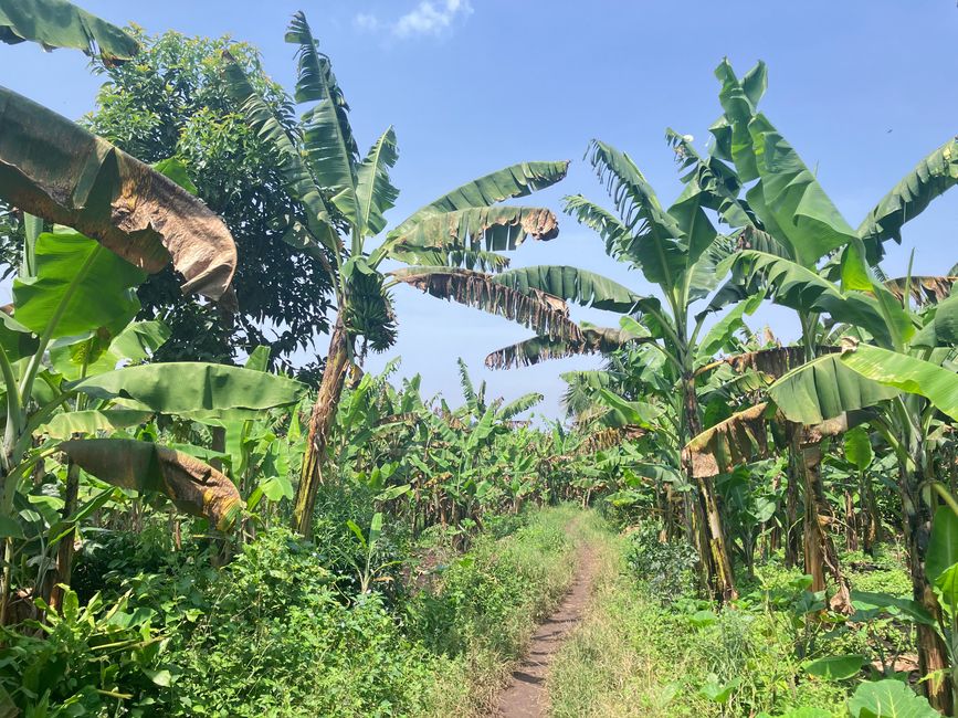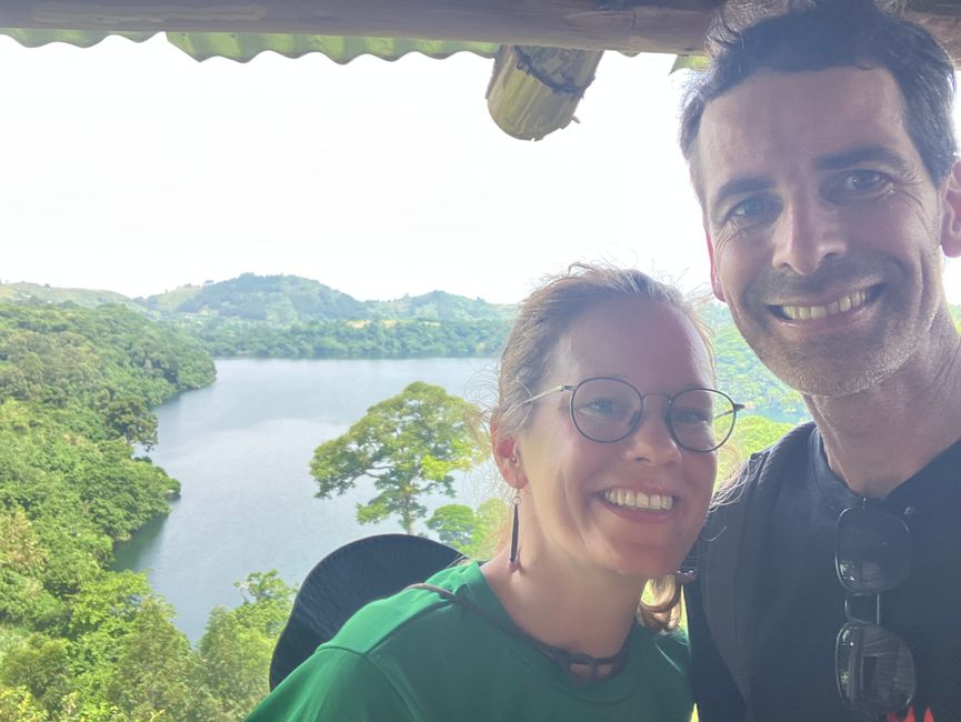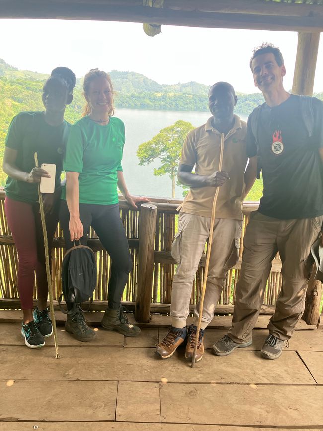 Gemeinsam wandern wir durch die grüne Natur, passieren kleine Dörfer und Bananenplantagen. Mehrfach bietet sich uns ein spektakulärer Blick auf Kraterseen. Der Nyinambuga-See ist einer der größten, sein Foto erscheint auf Ugandas 20.000 Schilling Banknote.