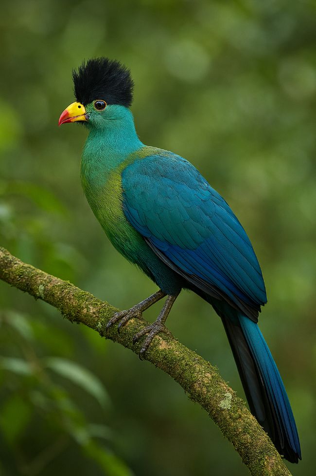 So sehen wir auch einige Vögel, wie z.B. den Great Blue Turaco. Gleich mehrere Exemplare des Riesenturakos tummeln sich weit über uns in den Bäumen. Es sind sehr faszinierende Vögel, hier ein Beispielbild…