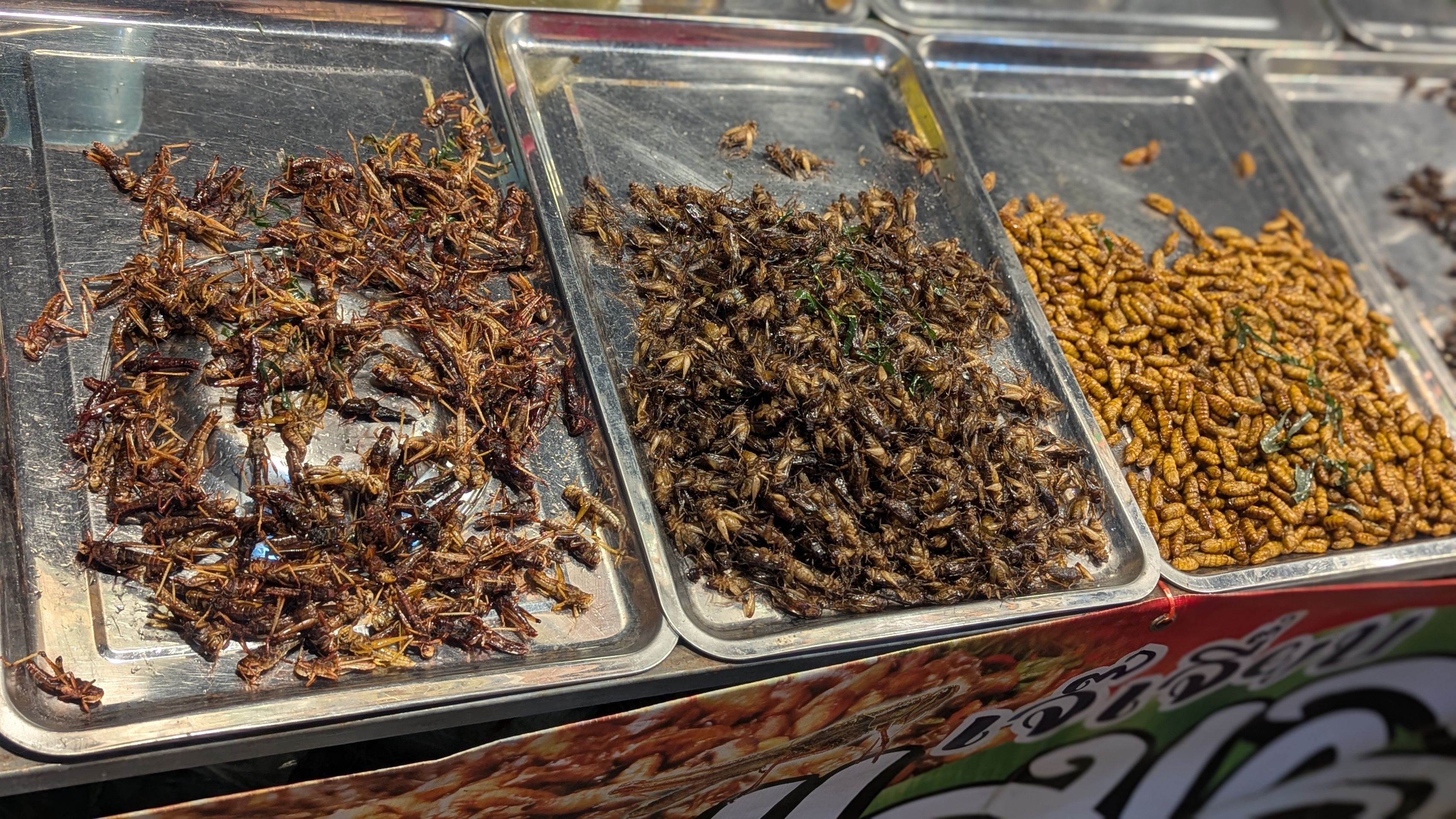 Am Abend machten wir einen Spaziergang zur Fußgängerzone, und der große Markt hatte gerade ein bisschen geöffnet. Also schauten wir kurz vorbei, und Lawa war überglücklich, als sie frittierte Heuschrecken sah. Für sie war es ein Traum, das zu probieren. Verrücktes Kind! Es lief gut, bis sie merkte, dass die Beine der Heuschrecken behaart waren, dann ging sie wieder raus.