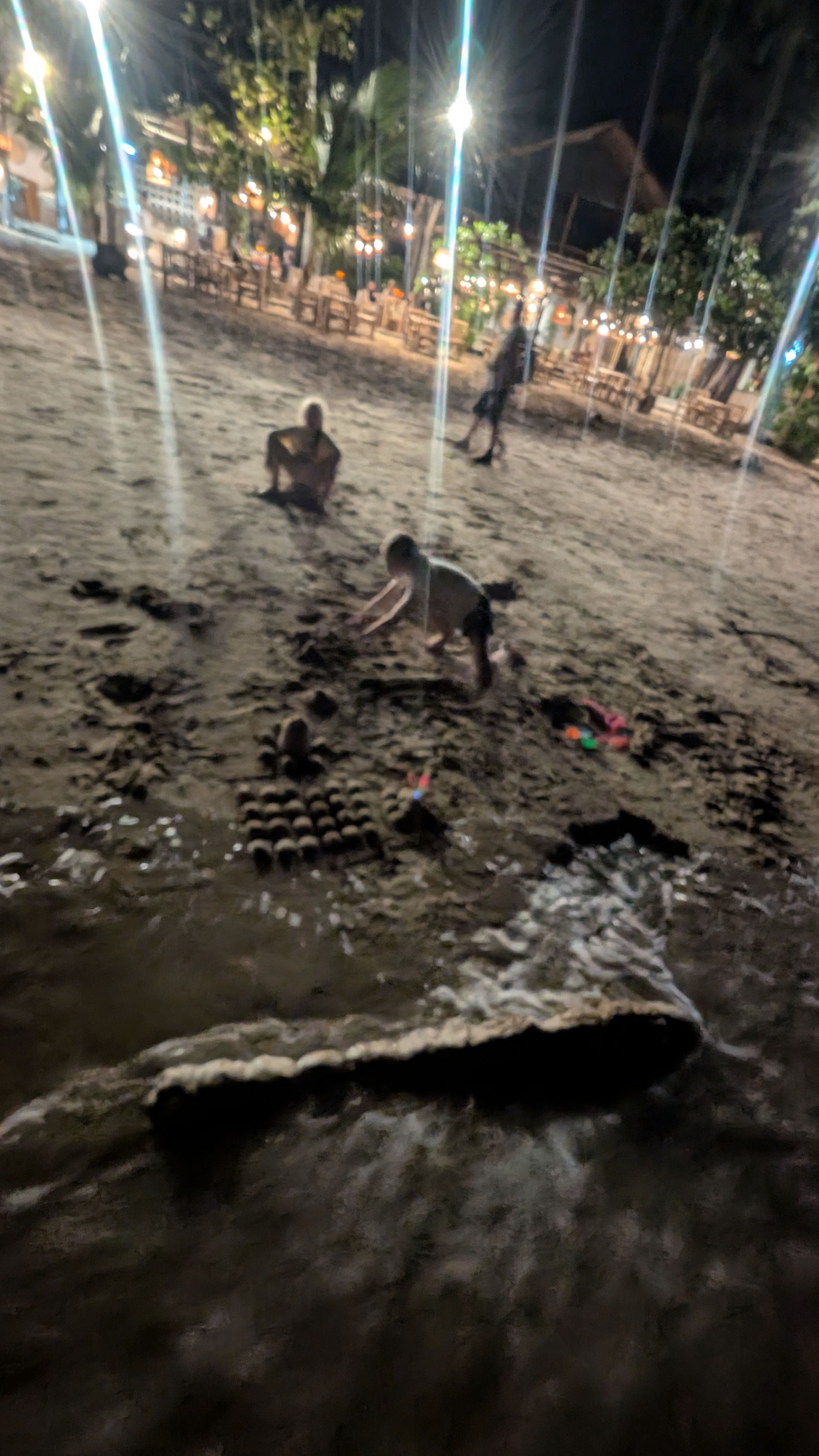 Die Kinder rannten weg und sahen sich zuerst eine Lichtershow an und bauten dann einen Eisstand im Sand, aber die Flut kam schnell und zerstörte das Kunstwerk.