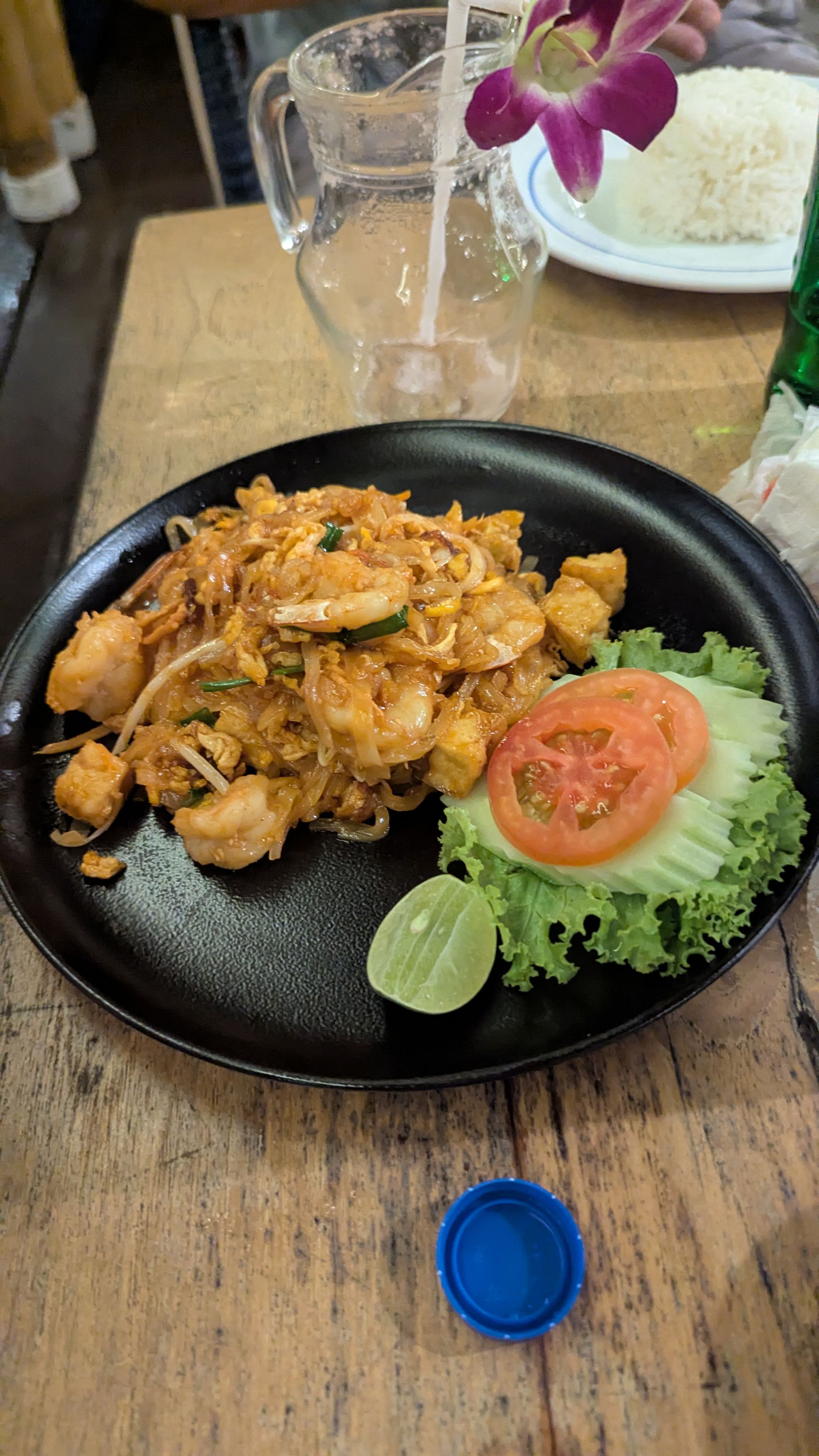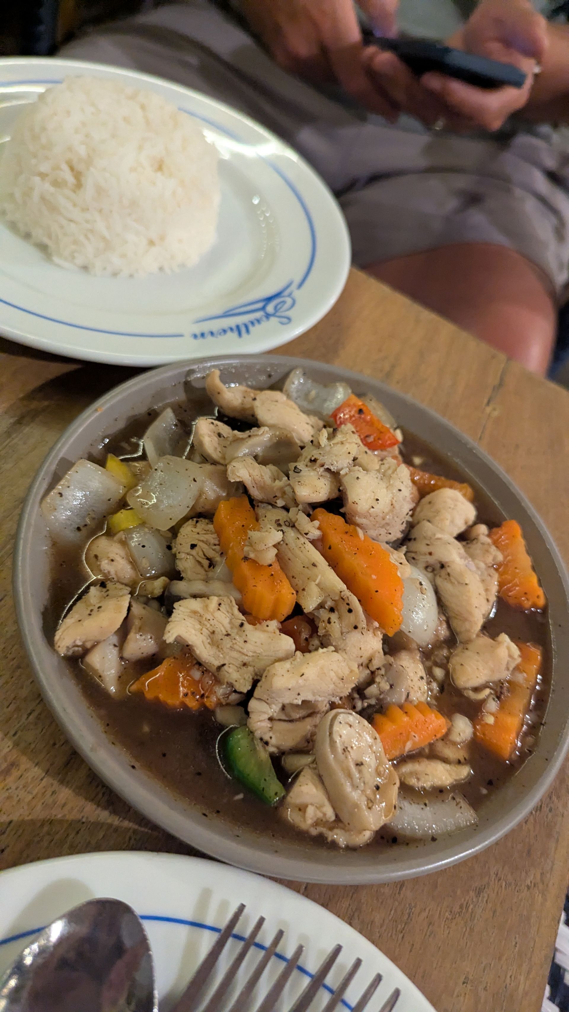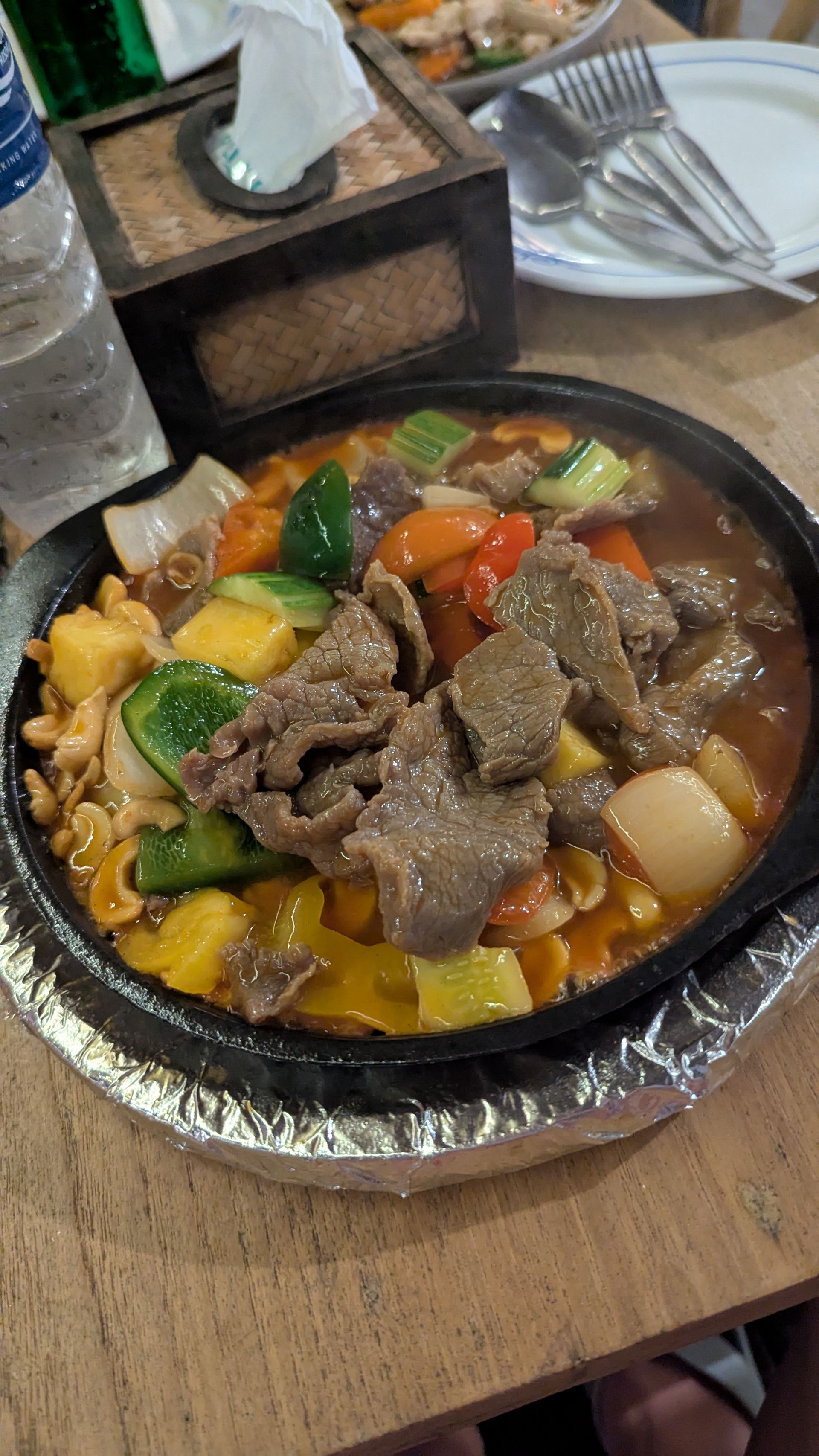Lawa hatte panische Angst, also setzten wir uns mit Stirnlampen und Taschenlampen auf mein Bett und zogen die Jalousien zu, um Karten zu spielen. Wie immer war es nur vorübergehend, die Gefahr war also bald vorbei, aber der Strom war immer noch weg. Ich hörte jedoch, dass der Transformator des Hotels wieder lief, also gingen wir, nachdem Mulle „zu Mittag gegessen“ hatte, ins Hotelrestaurant. Es war eines der wenigen Restaurants mit Strom, ansonsten herrschte stockfinstere Dunkelheit.