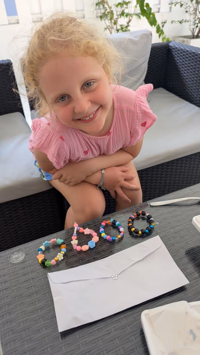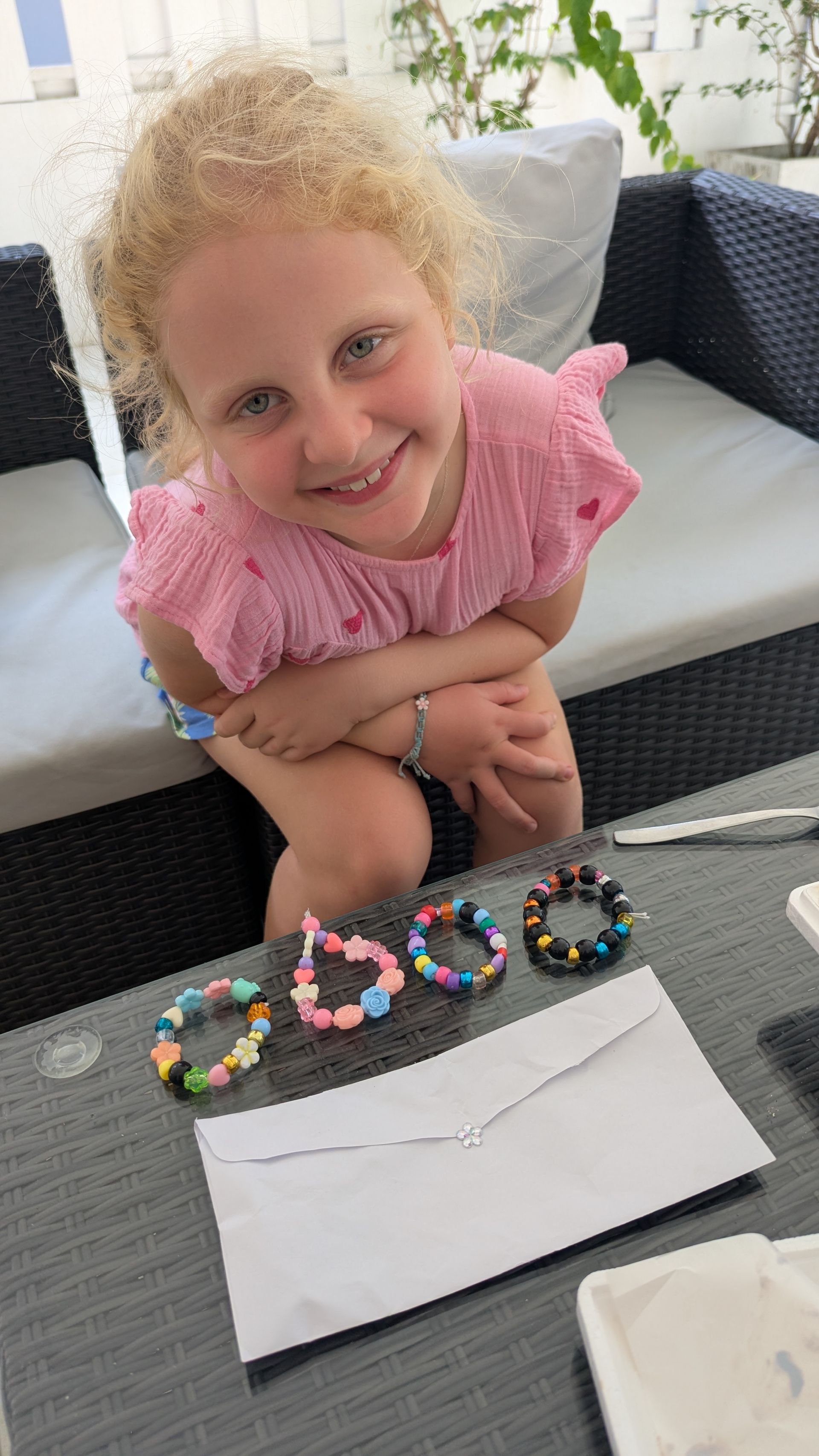 Ich habe Lawa heute selbst abgeholt und wir haben Eis gekauft und etwas mitgenommen, damit Papa auch probieren konnte. Danach haben wir im Pool geplanscht und Karten gespielt. Sie hatte von einer Schulfreundin einen Umschlag mit richtig schönen Armbändern bekommen, die sie selbst gemacht hatte. Jetzt führt Lawa den Wettbewerb mit den meisten Armbändern an, was anscheinend eine Auszeichnung ist.