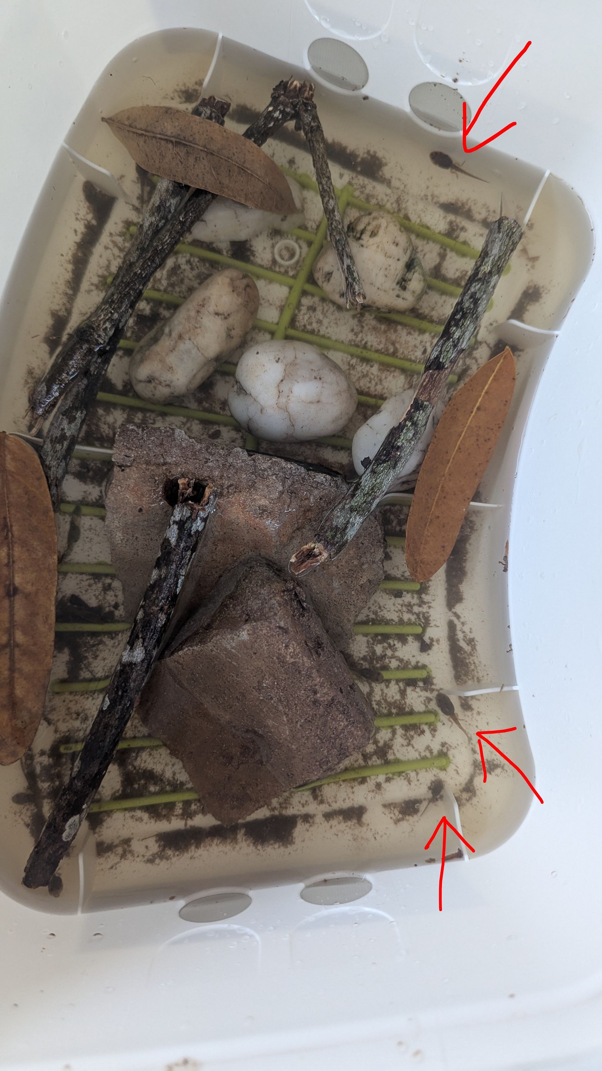 Dann beschloss Lawa, ihre eigene Kaulquappenzucht zu haben, also haben wir sie eingerichtet. Draußen vor der Schule gibt es einen Teich, der ein idealer Brutplatz für Kaulquappen ist. Wir stellten dort einen Teich auf und legten Steine und Stöcke zum Klettern bereit, sobald die Kaulquappen Beine haben.