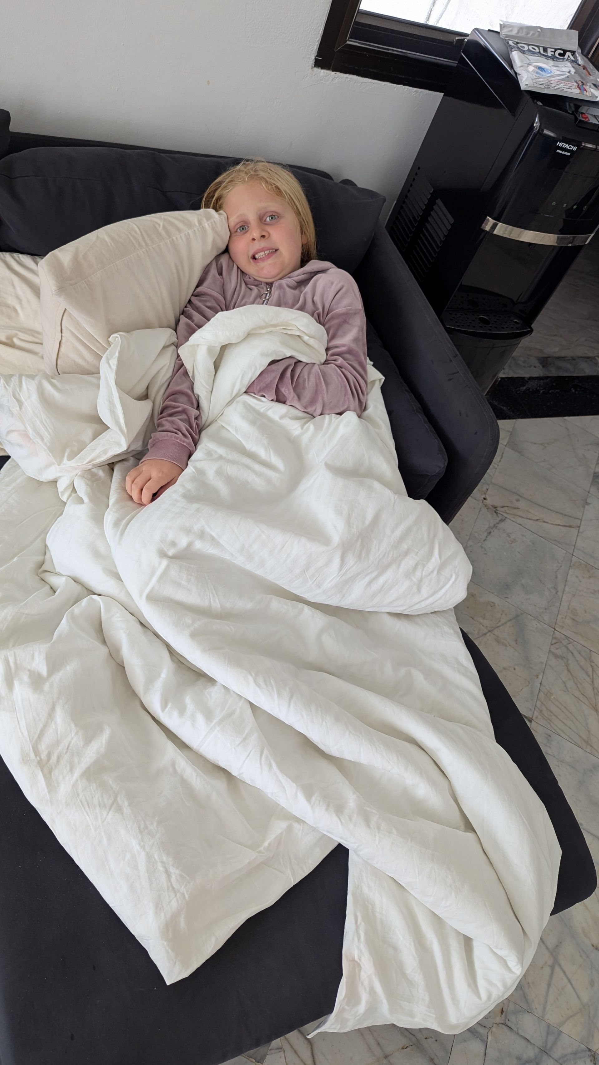 It turned into an afternoon of cuddling on the sofa under the blanket; we still haven't managed to fix the AC. It's currently set to 30 degrees, but it's freezing cold.