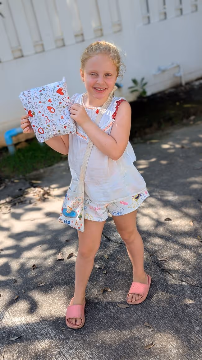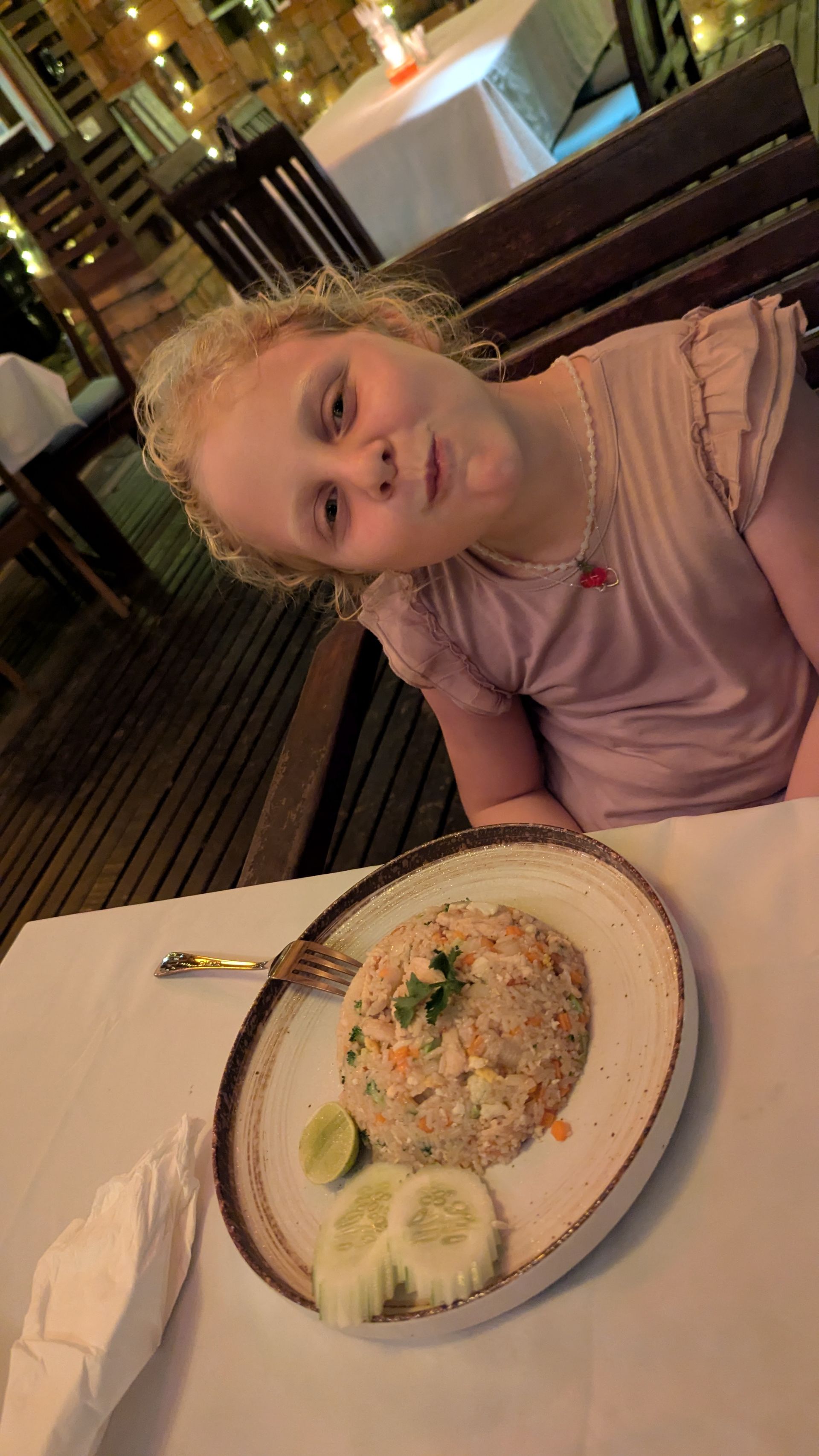 When the weather calmed down a bit, we took a walk to Sala Dan and strolled around a bit. We went to the pier to check boat times. There we met a girl who took a liking to Lawa and she got three bracelets. She was very happy as she had lost one of hers that had broken on the way there.