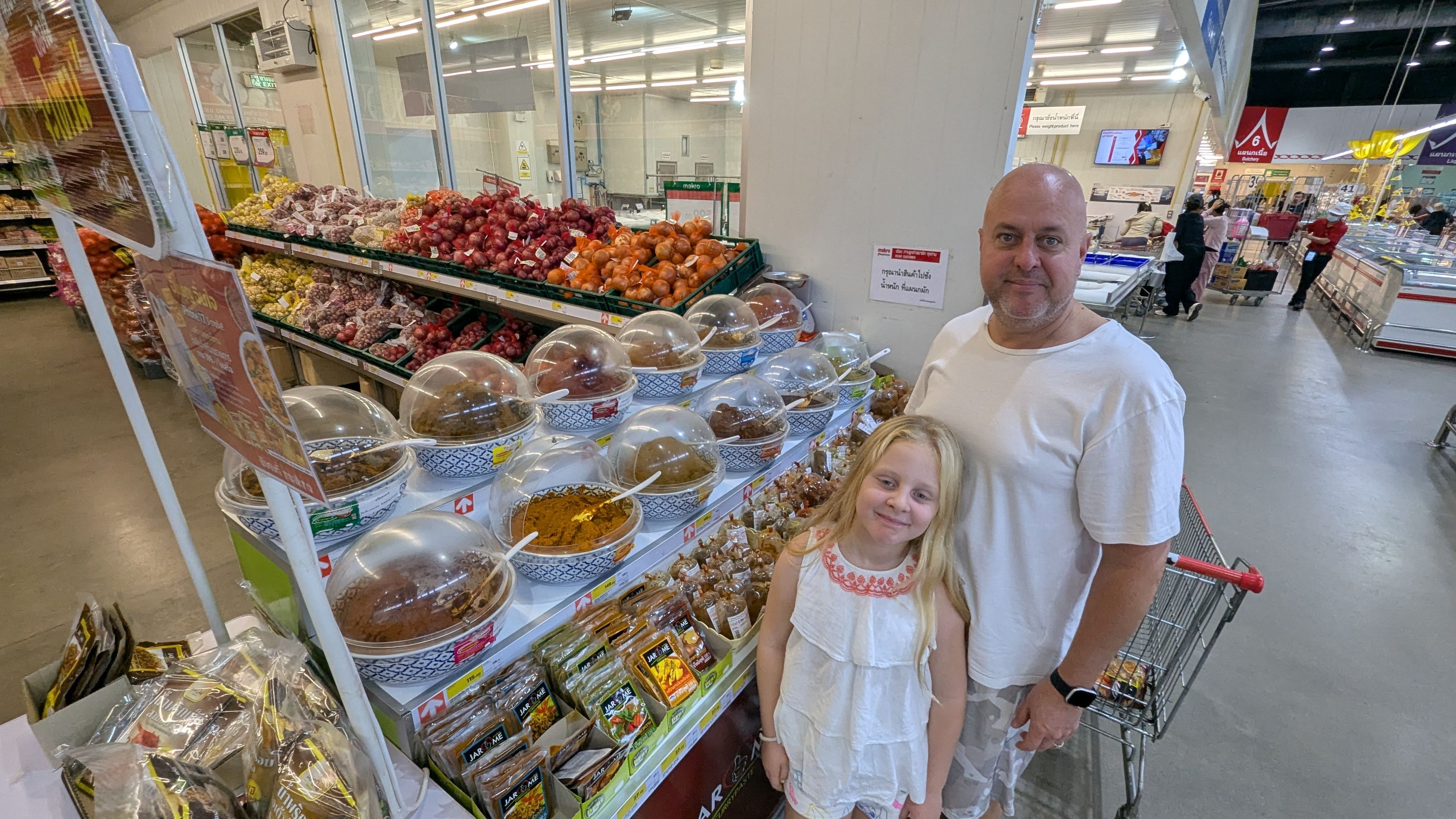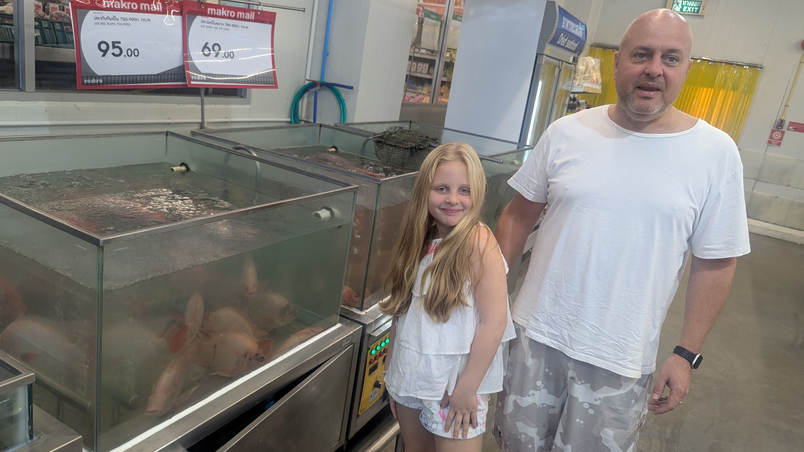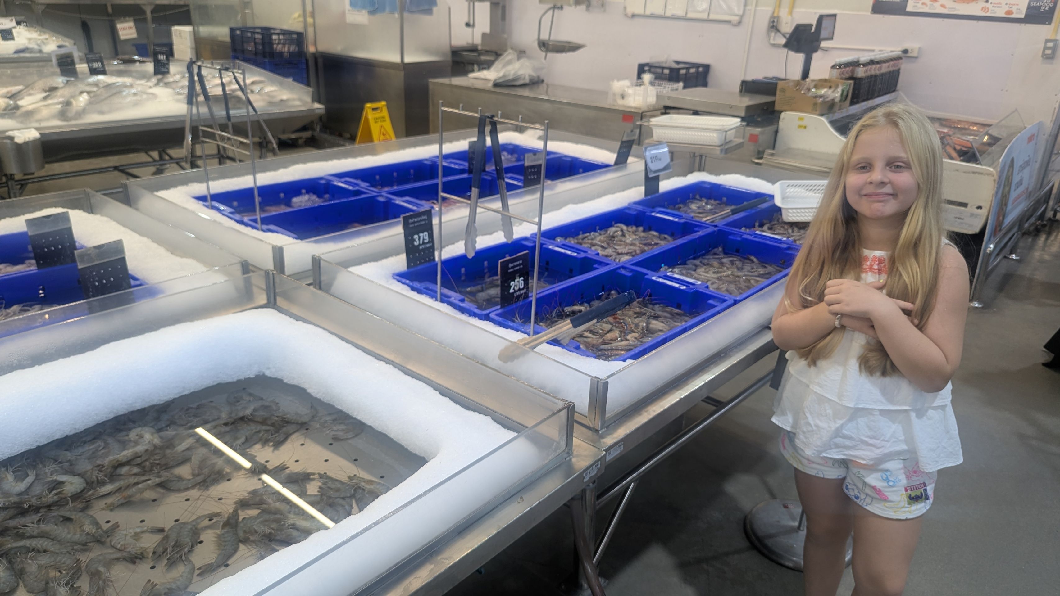 We booked a taxi to go grocery shopping for our stay; we had been recommended a bulk store for businesses, and we found a few nice things. I got to taste some fish in the fish section in exchange for letting her take a picture of us.