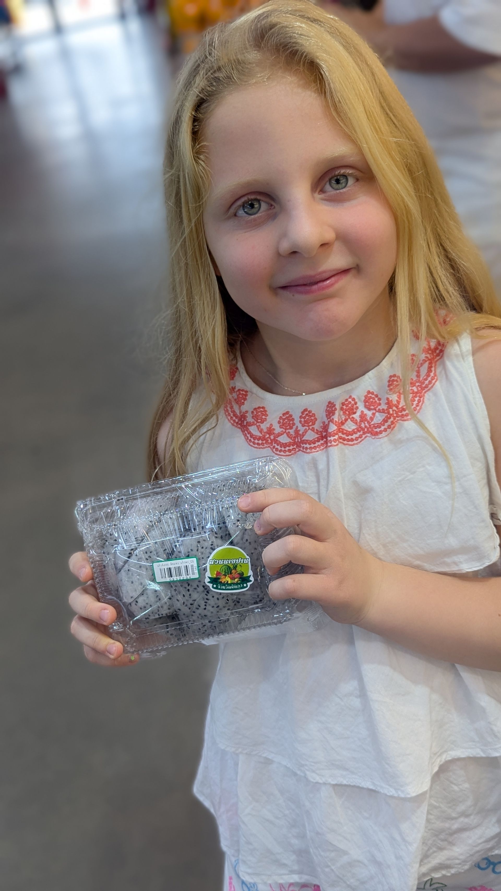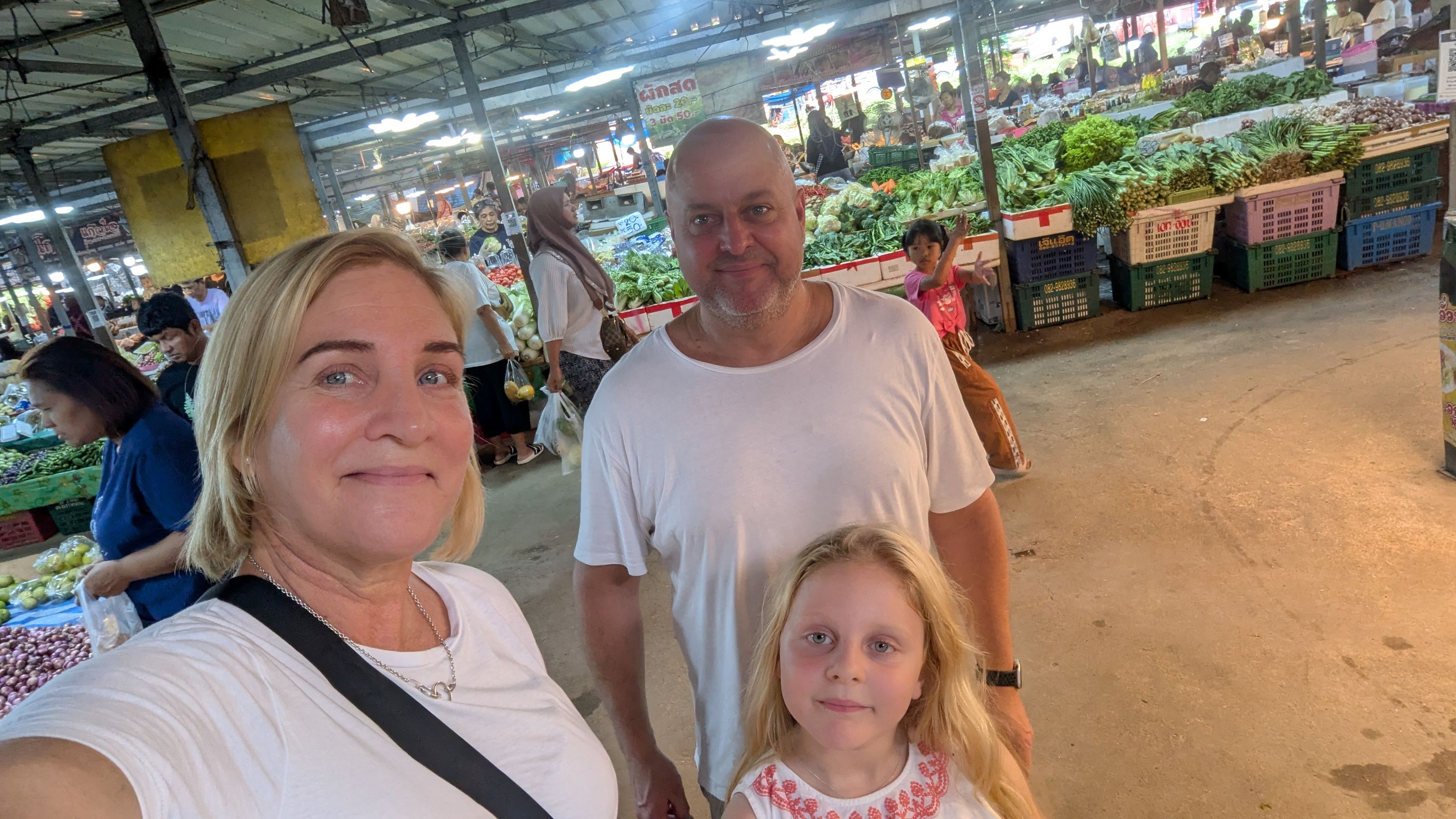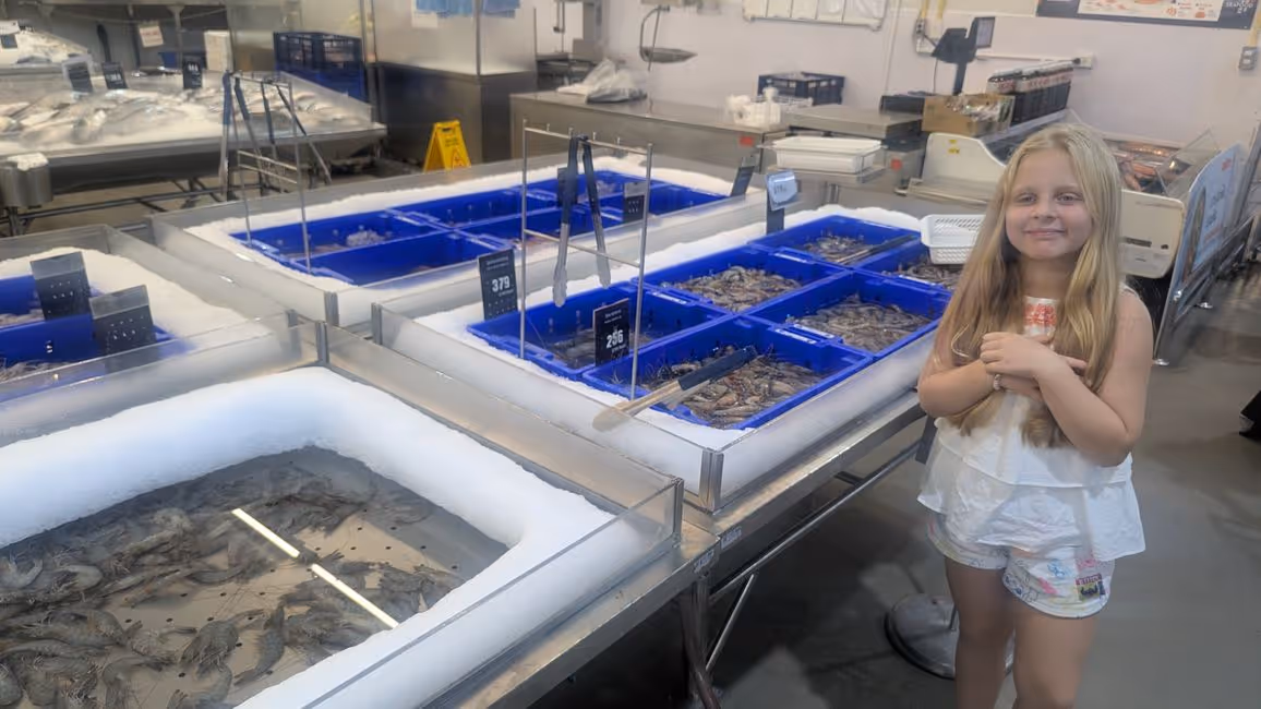 We booked a taxi to go grocery shopping for our stay; we had been recommended a bulk store for businesses, and we found a few nice things. I got to taste some fish in the fish section in exchange for letting her take a picture of us.
