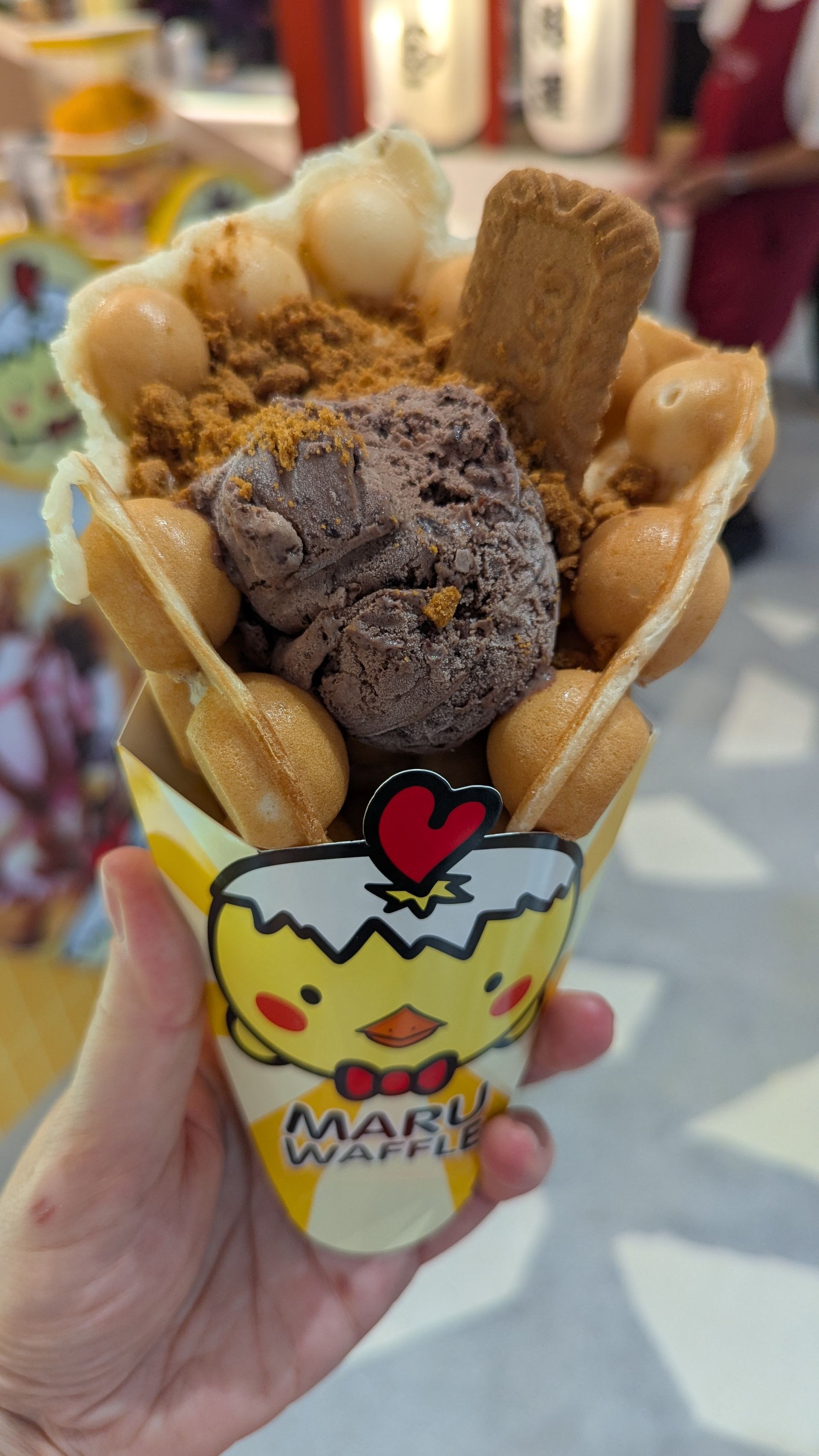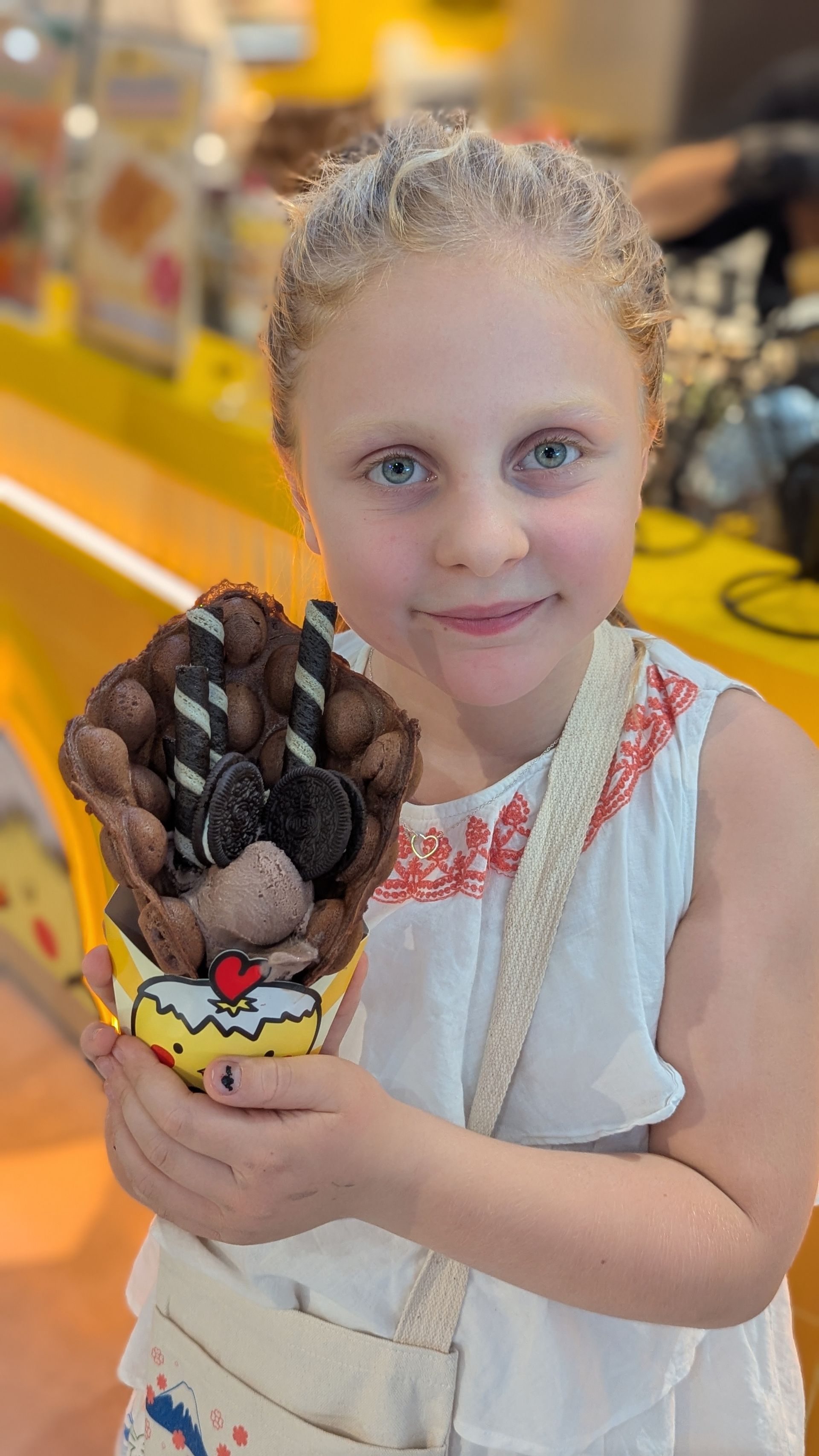 We had bubble waffles with ice cream for lunch; things are good now. Lawa got to spin a lucky wheel and won a fabric bag. And she was in heaven when we walked into a store with separate sections for Stitch, Labubu, Harry Potter, etc. They also have another similar thing to Labubu, but it looks more like a Monchichi here and is very popular. However, we have limited space in our bags, so she had to settle for a hand fan from Stitch.