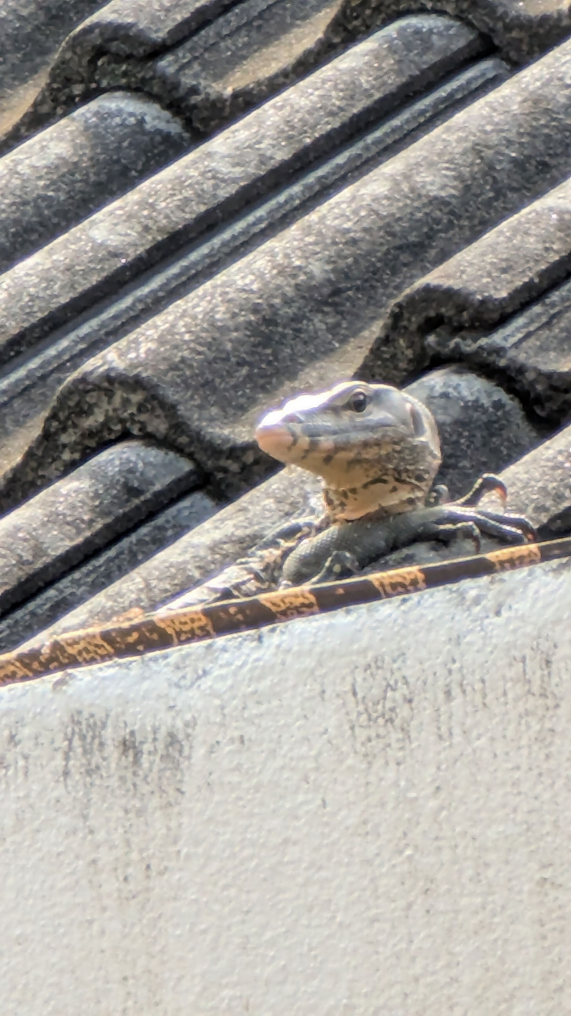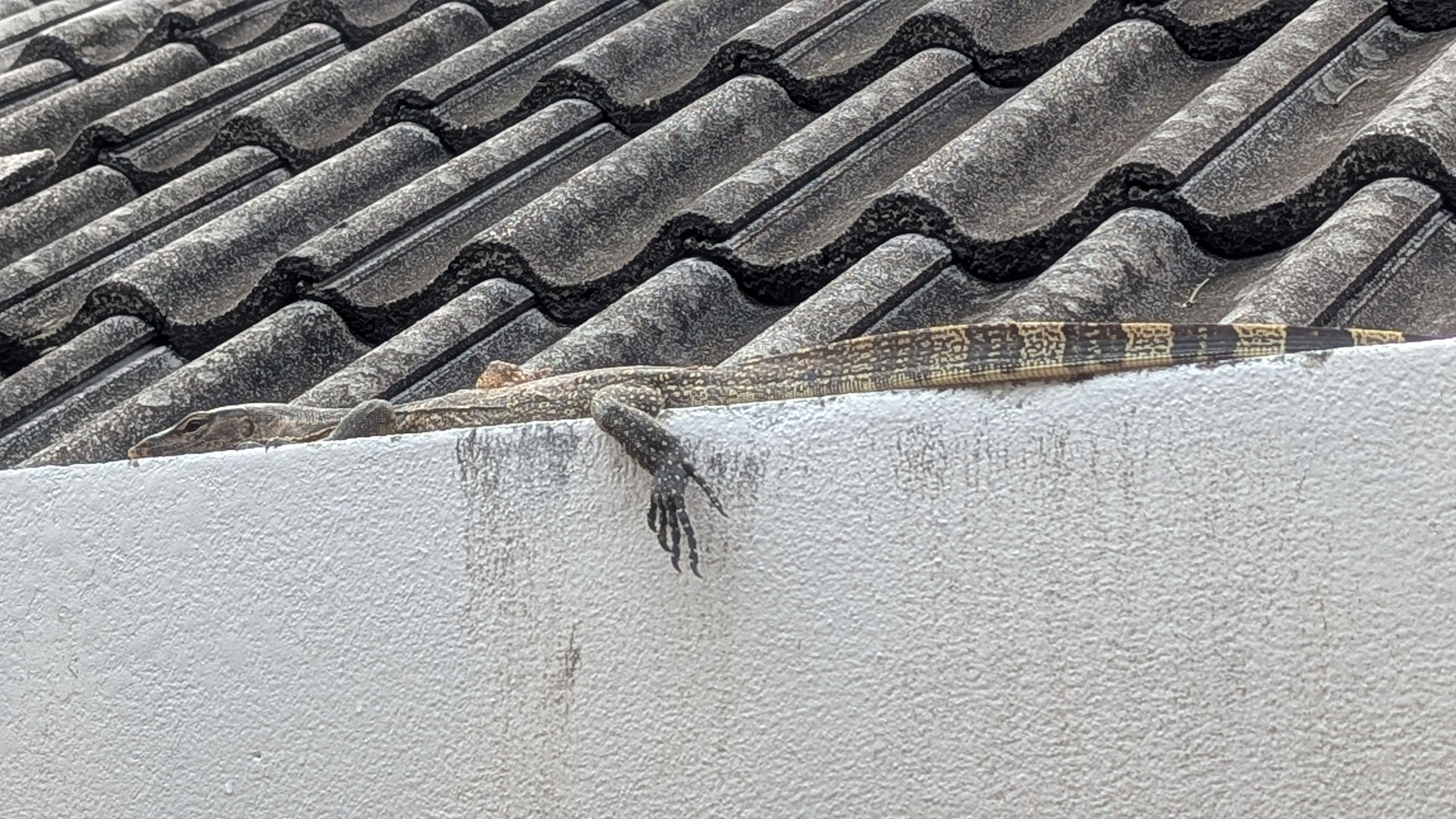 Nach dem morgendlichen Bad von Mulle und mir schrie er plötzlich auf, als er spürte, dass ihn etwas anstarrte. Eine große Eidechse saß auf dem Dach des Nachbarn und beobachtete uns. Wahrscheinlich genoss sie auch die Sonne.