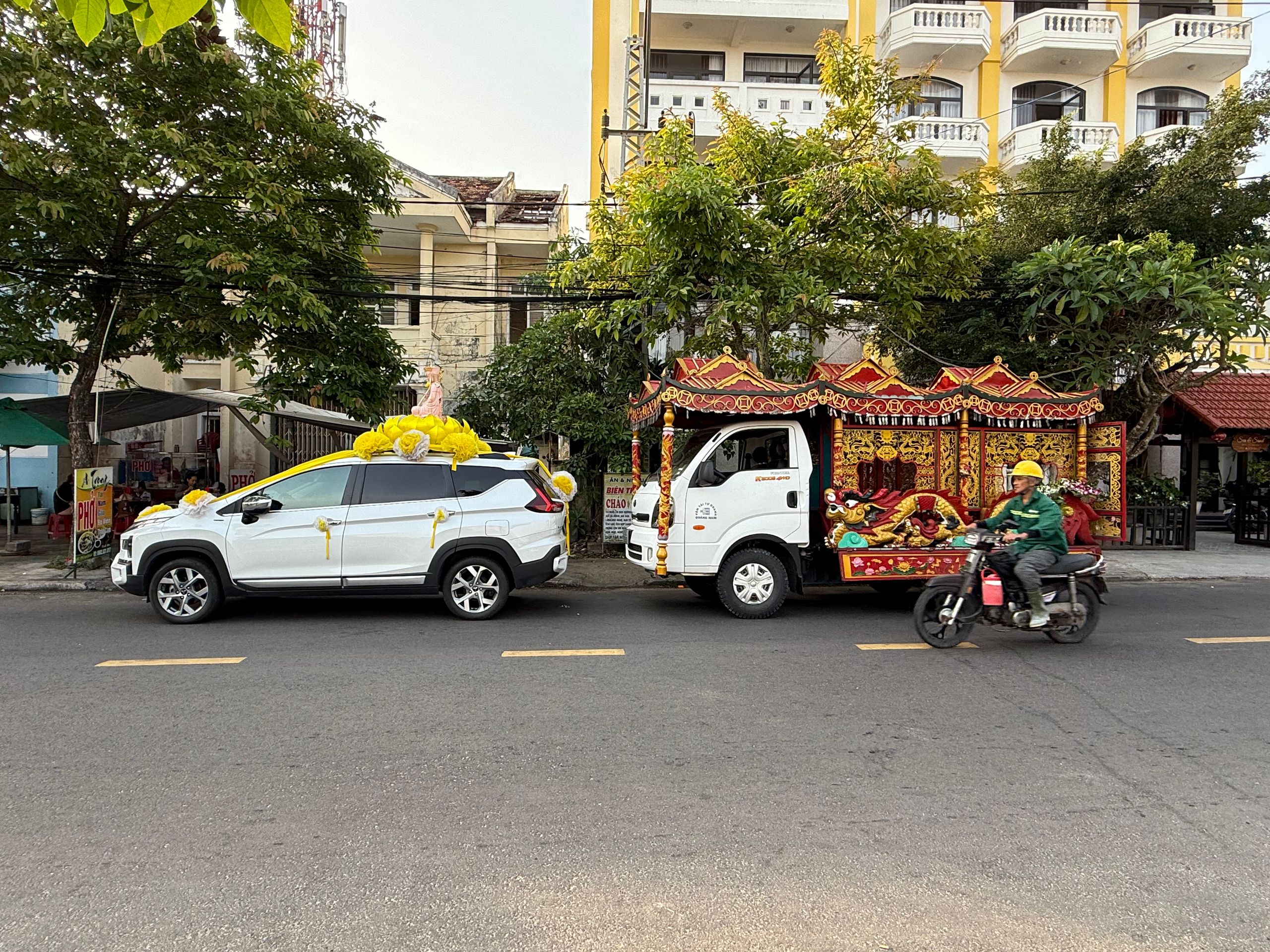 Am zweiten Tag waren wir alle vier in der Altstadt von Hoi An – kostenloser Shuttlebus vom Hotel dorthin. Das Frühstück wurde in einer Straßenküche eingenommen. Guter Kaffee, Brot und etwas zwischen Spiegeleiern und Omelett, serviert in einer kochend heißen kleinen Pfanne. Sehr lecker und sättigend.