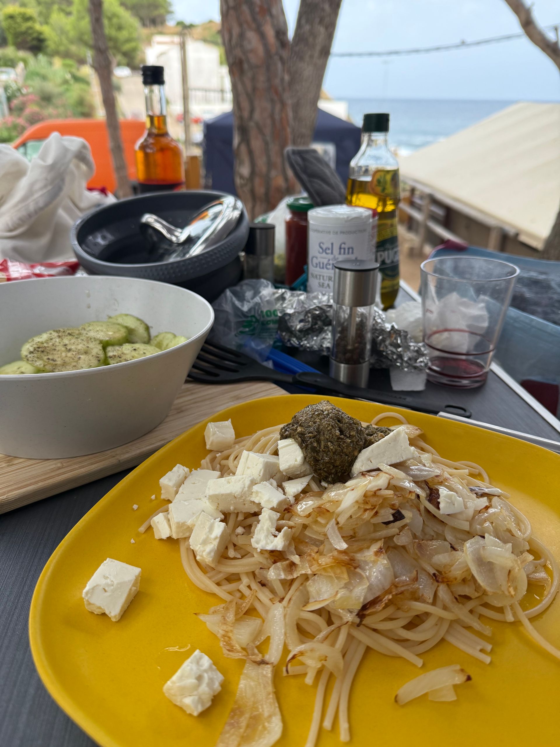 Jetzt sind wir schon eine Woche in Palamos, die Pollen halten sich zurück und wir finden in dem Ort, der uns anfangs wenig gefallen hat, immer mehr Anlaufstellen. Es gibt zum Beispiel eine Pizzeria, die in München das beste italienische Restaurant wäre und ein kleines Café wo es frische Toasts gibt. Der Campingplatz leert sich (Ferienende) und wir sitzen oft abends noch in der leeren Bar, aber es ist nicht langweilig, die Musik ist super und wir verstehen uns gut mit dem Wirt. Wir finden jetzt tatsächlich mal ein paar Lücken wo es nichts zu tun gibt, wir hören Musik, spielen Gitarre, lesen und gehen spazieren. Wahrscheinlich werden wir hier noch ein paar Tage bleiben, denn wir haben Maniokmehl für Marina bestellt, das müssen wir abwarten. Wo es dann hingeht wissen wir noch nicht. Wir wollen uns langsam der Heimat nähern, aber an der Cote d‘Azur zum Beispiel ist die Pollenlage noch nicht gut, das müssen wir beobachten. Die Toskana wäre eine riesen Fahrt und wir haben dort noch keinen Ort gefunden, der unsere Spezialansprüche erfüllt 🤔