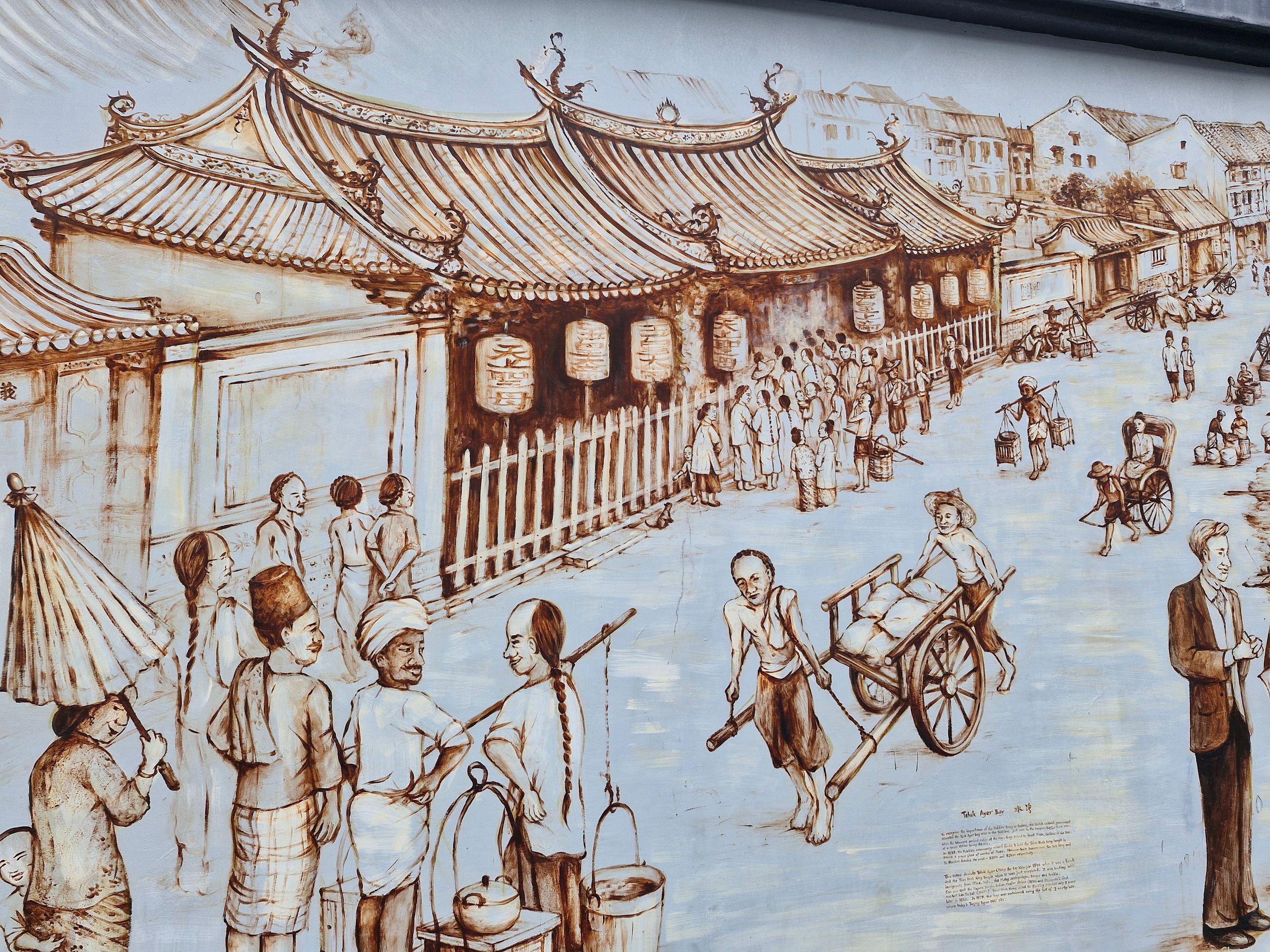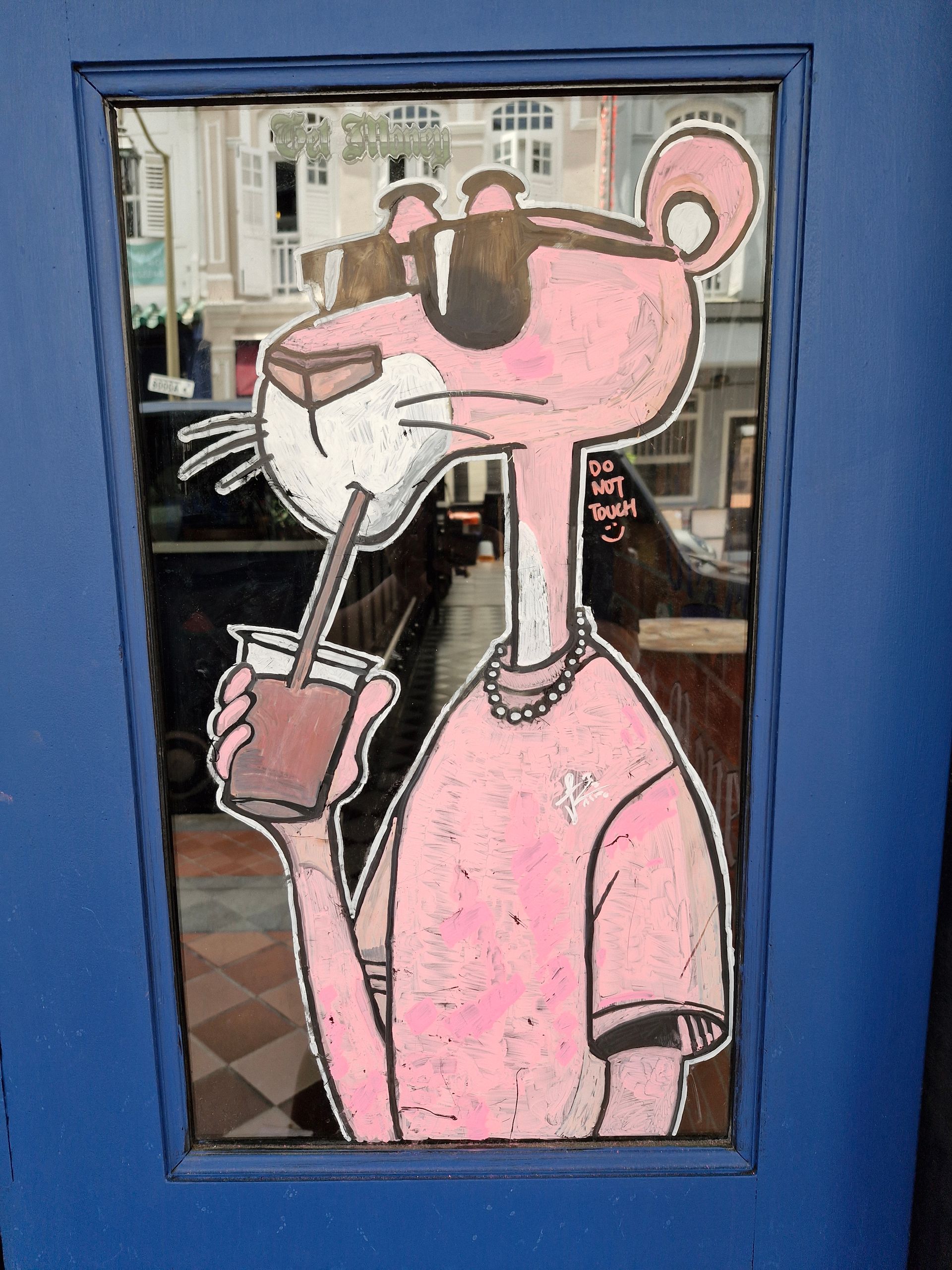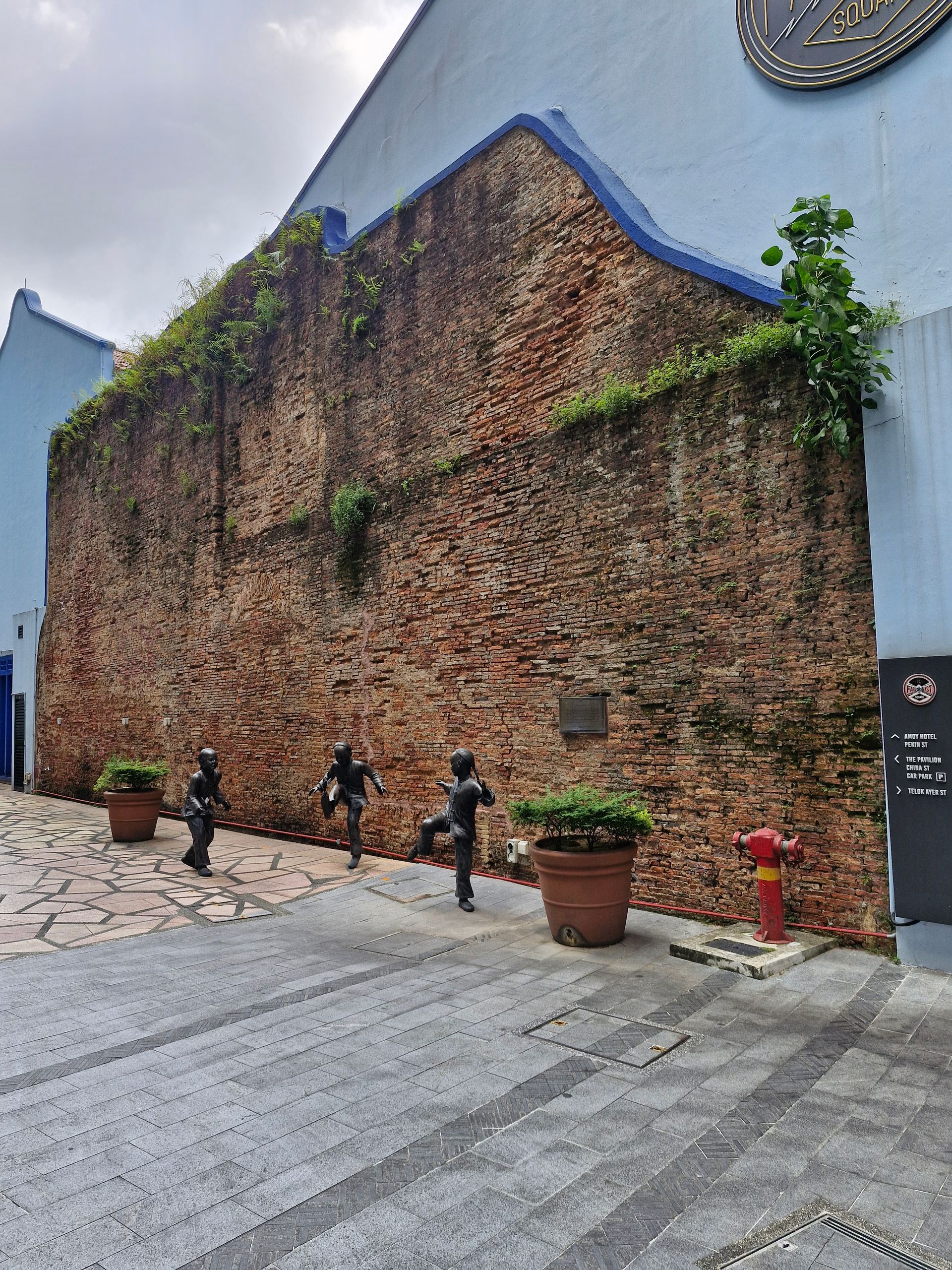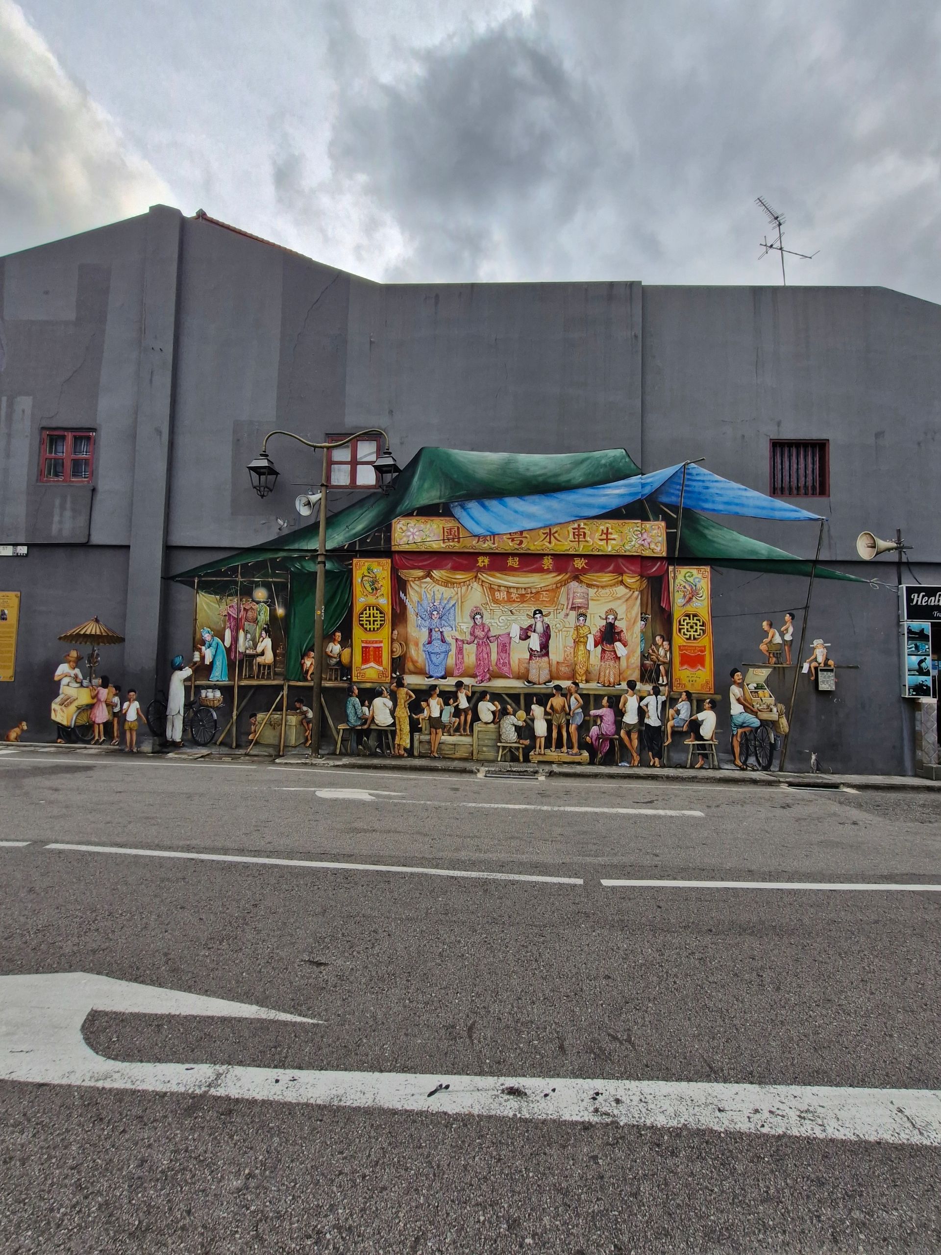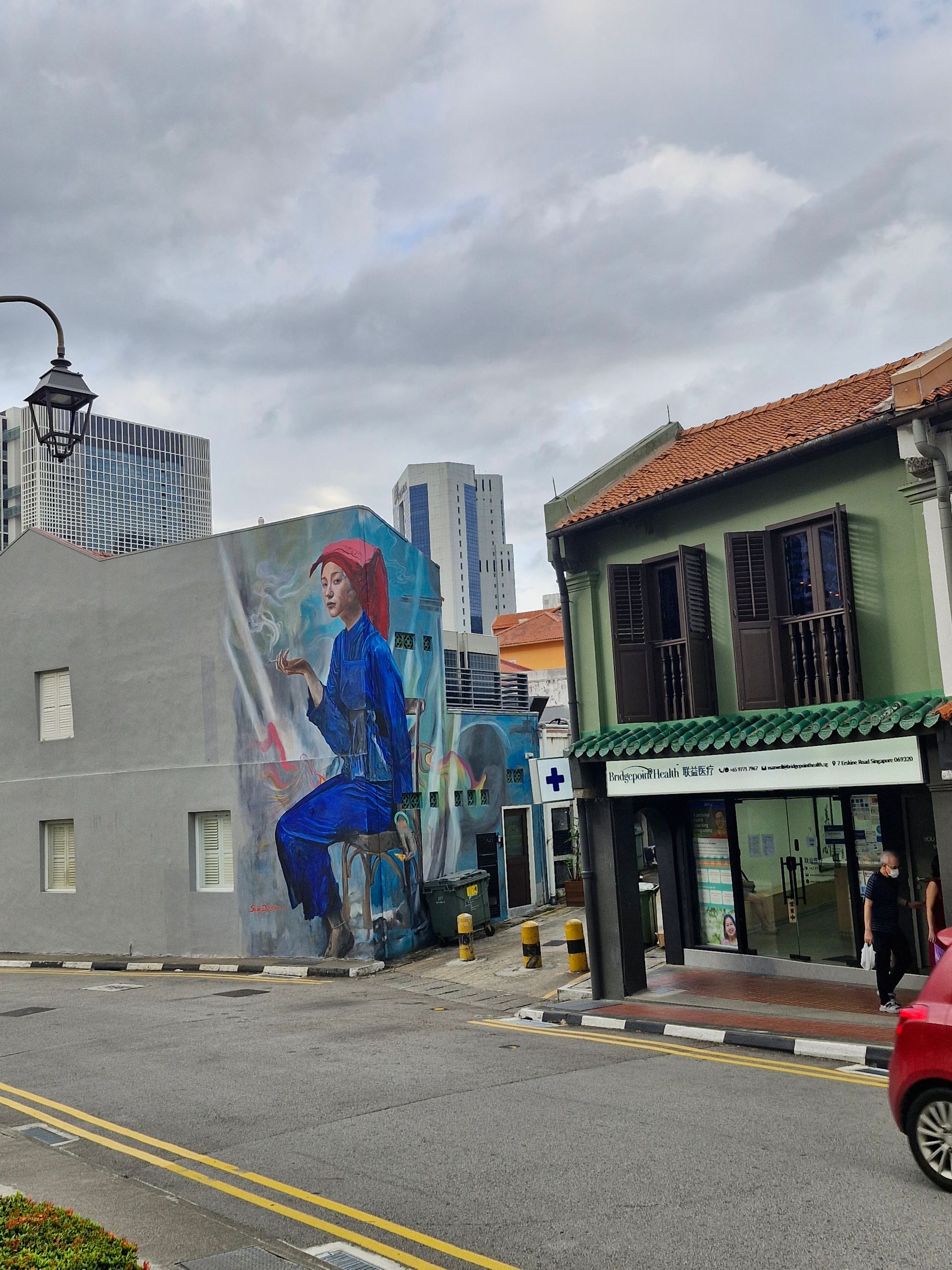 So zum Beispiel auch die nette Dame in Blau mit dem roten Hut und der Zigarette. Das ist ein Kunstwerk von einer der vielen Bauarbeiterinnen, die geholfen haben Singapur aufzubauen. Denn hier in Singapur waren das zumindest in diesem Viertel Großteils Frauen, die auf den Baustellen gearbeitet haben. Ganz klassisch mit der Zigarette in der Hand und dem blauen Anzug. Als Ausgleich für die Arbeit haben diese Frauen erstaunlich gut verdient und in den Wohnungen der Stadt bzw. des Viertels gewohnt, um weitere Gebäude hochzuziehen.