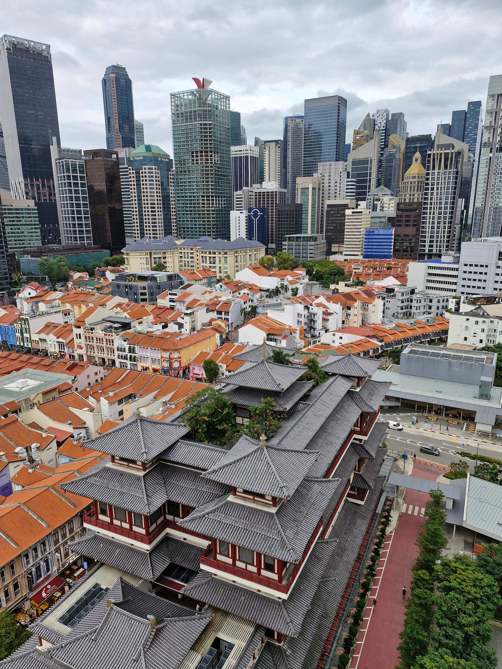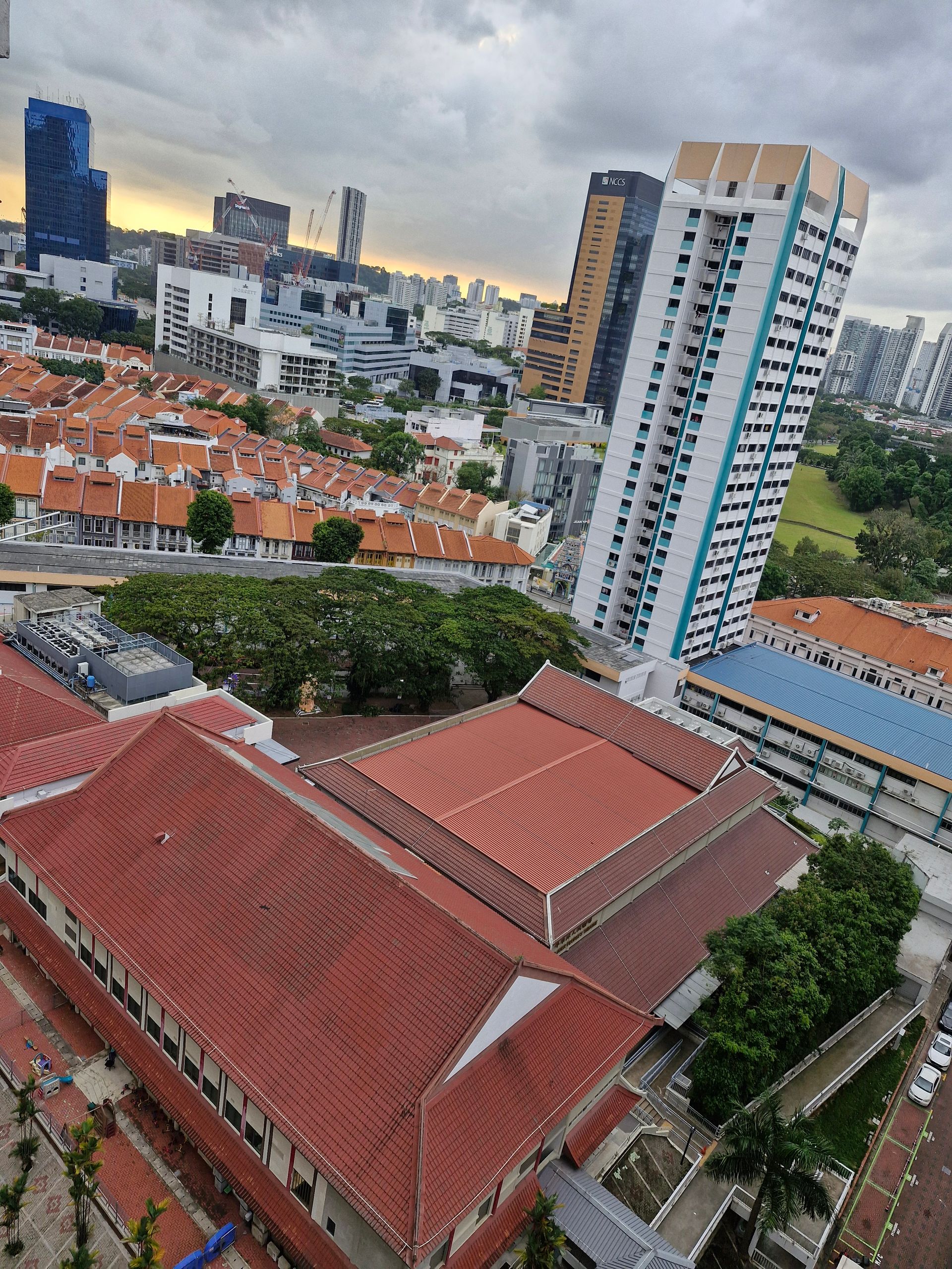 Und besonders auf diesem Foto ist zu sehen, wie gut alt und neu hier zusammen passen und, wo die Grenzen zwischen dem alten Viertel und dem Bankenviertel verläuft. Diesen Ausblick hatten wir nach einer netten Pause in einem der Hawker Center in China Town von einem der Hochhäuser/Wohngebäude im Viertel.