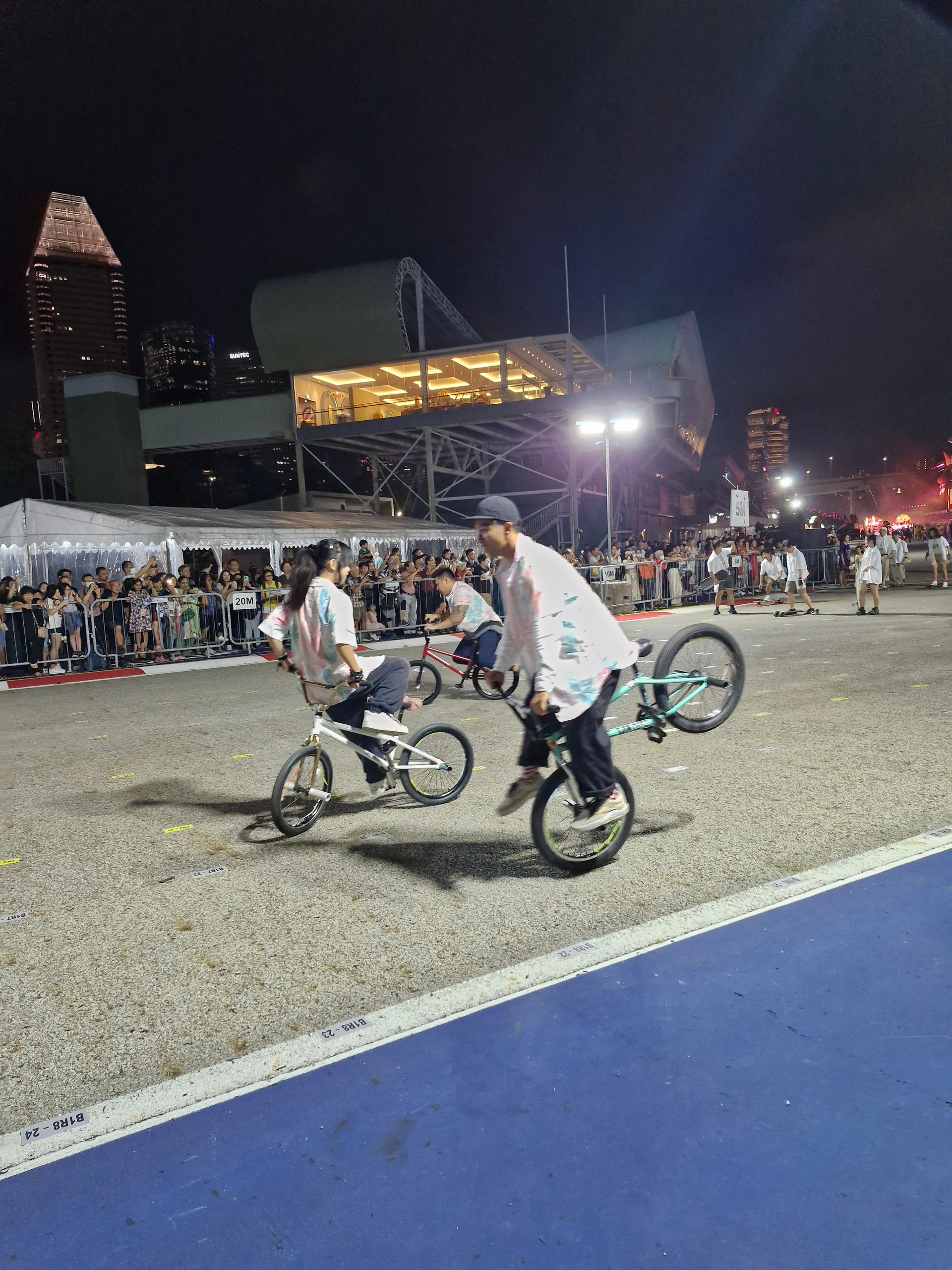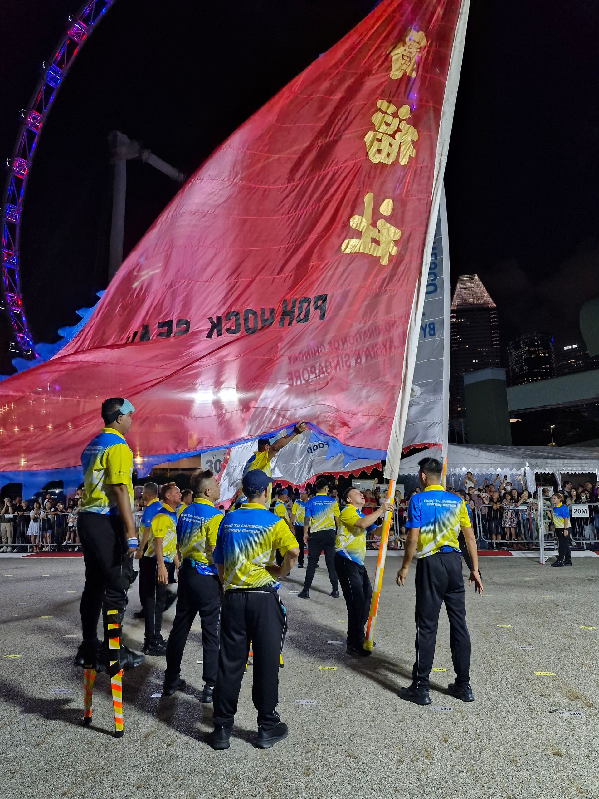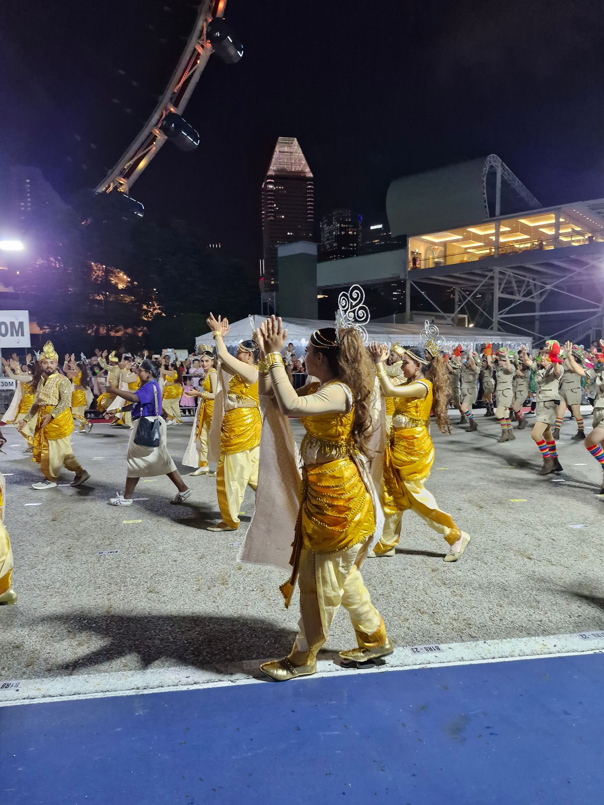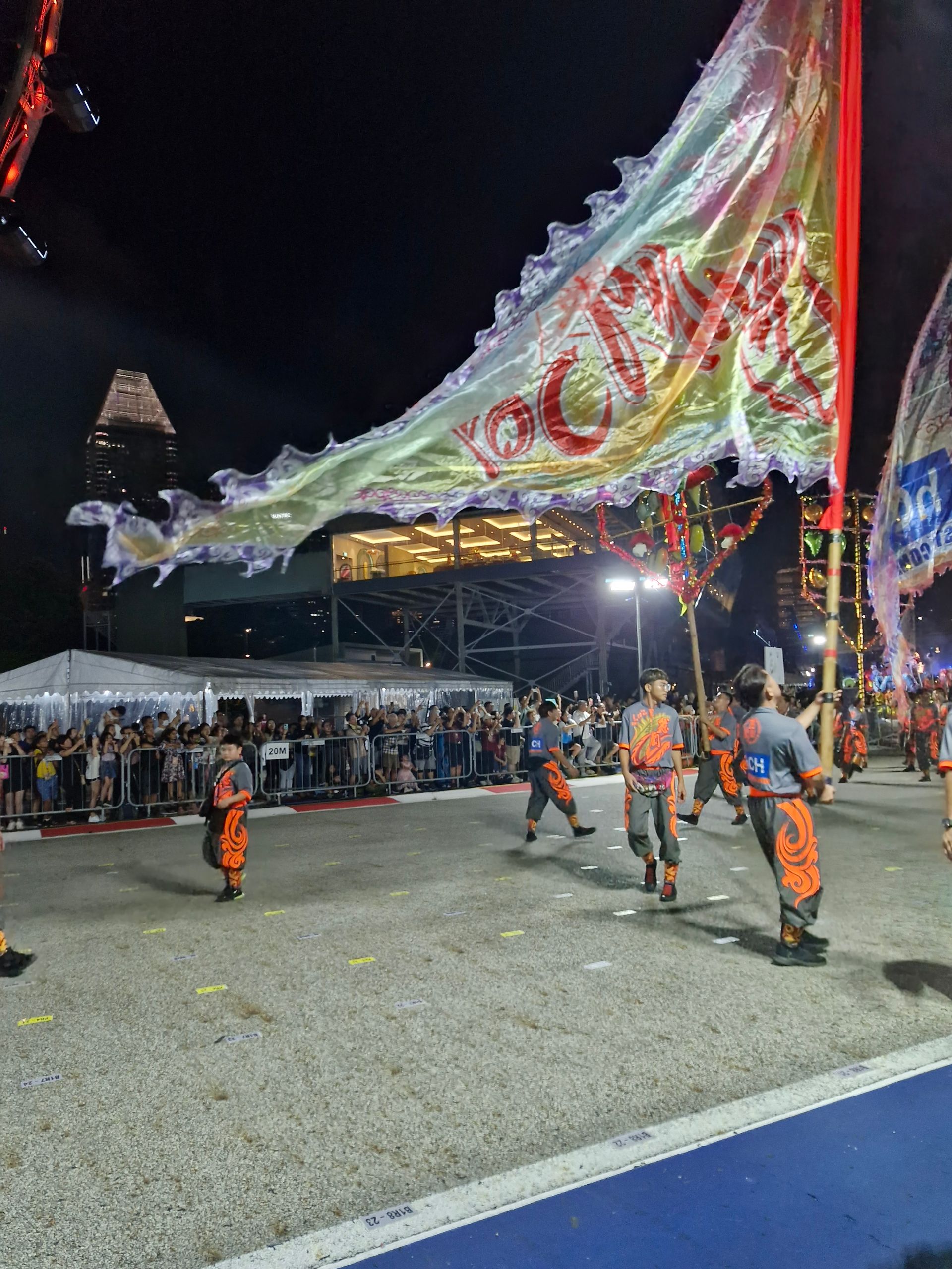 Und weil planlos der Plan los geht sind wir danach in Richtung Kanal gefahren und sind spontan auf die Chengay Parade gestoßen. Eine riesige Parade in Singapur, bei der alle Vereine und Sportkurse und teilweise auch Unternehmen das Luna New Year feiern und die jedes Jahr unter einem anderen Motto stattfindet. Dieses Jahr war es gesundes Essen. Die Parade eine Hauptbühne mit Sitzen und Lichtern und all dem anderen Kram aber es gibt auch einen Abschnitt, bei dem keine Tickets benötigt werden und wo die Parade so oder so durchmuss, um nach der Hauptbühne auf die Standplätze zu kommen. Genau hier haben Julian und ich uns dann hingesetzt und haben beim warten (weil wir eventuell 2h zu früh dran waren) Sage und Wobit kennengelernt. Eine US-Amerikanerin und Kanadierin, die ebenfalls für ein paar Tage in Singapur waren und die beide aktuell Englisch in Südkorea unterrichten.