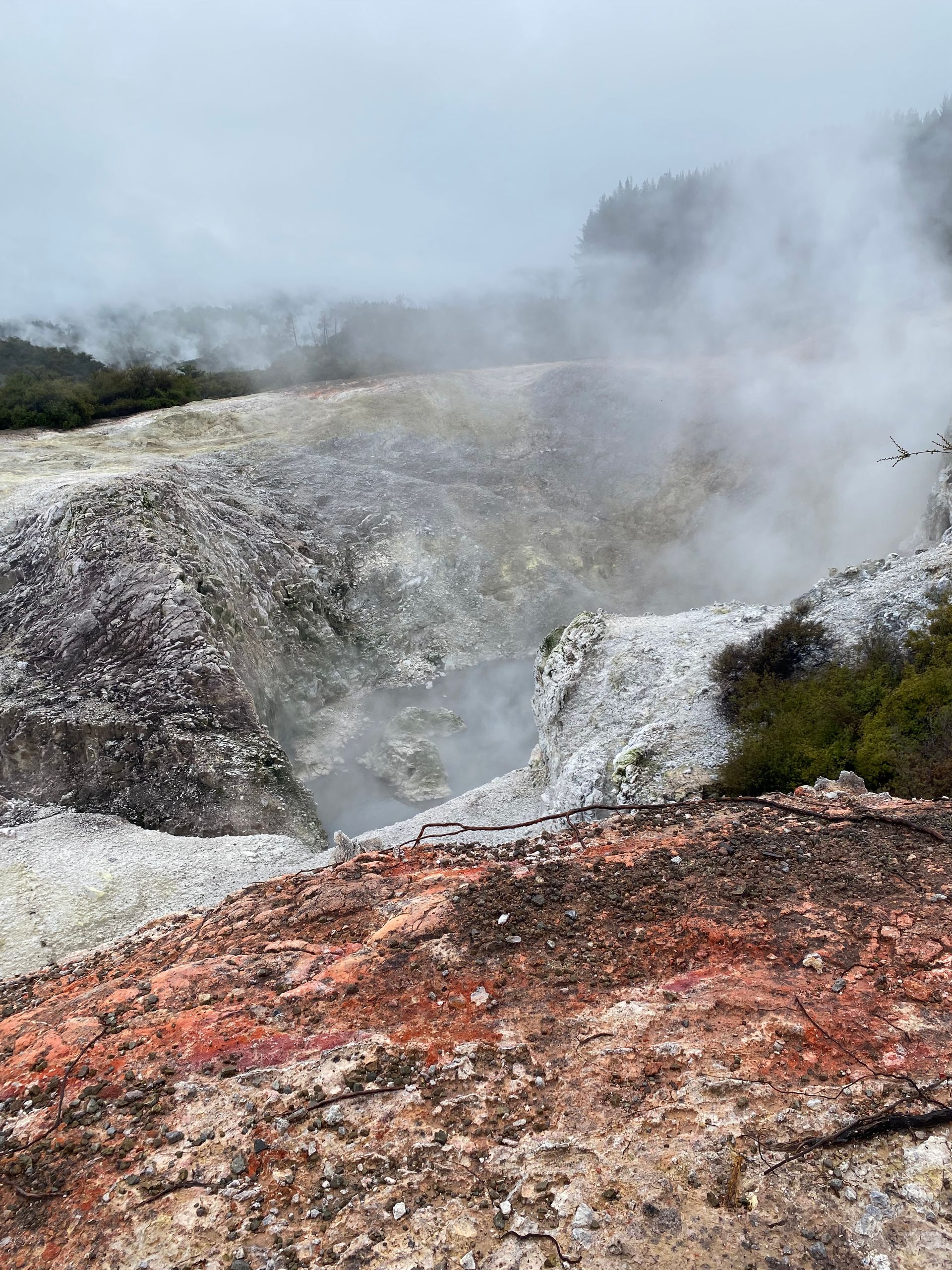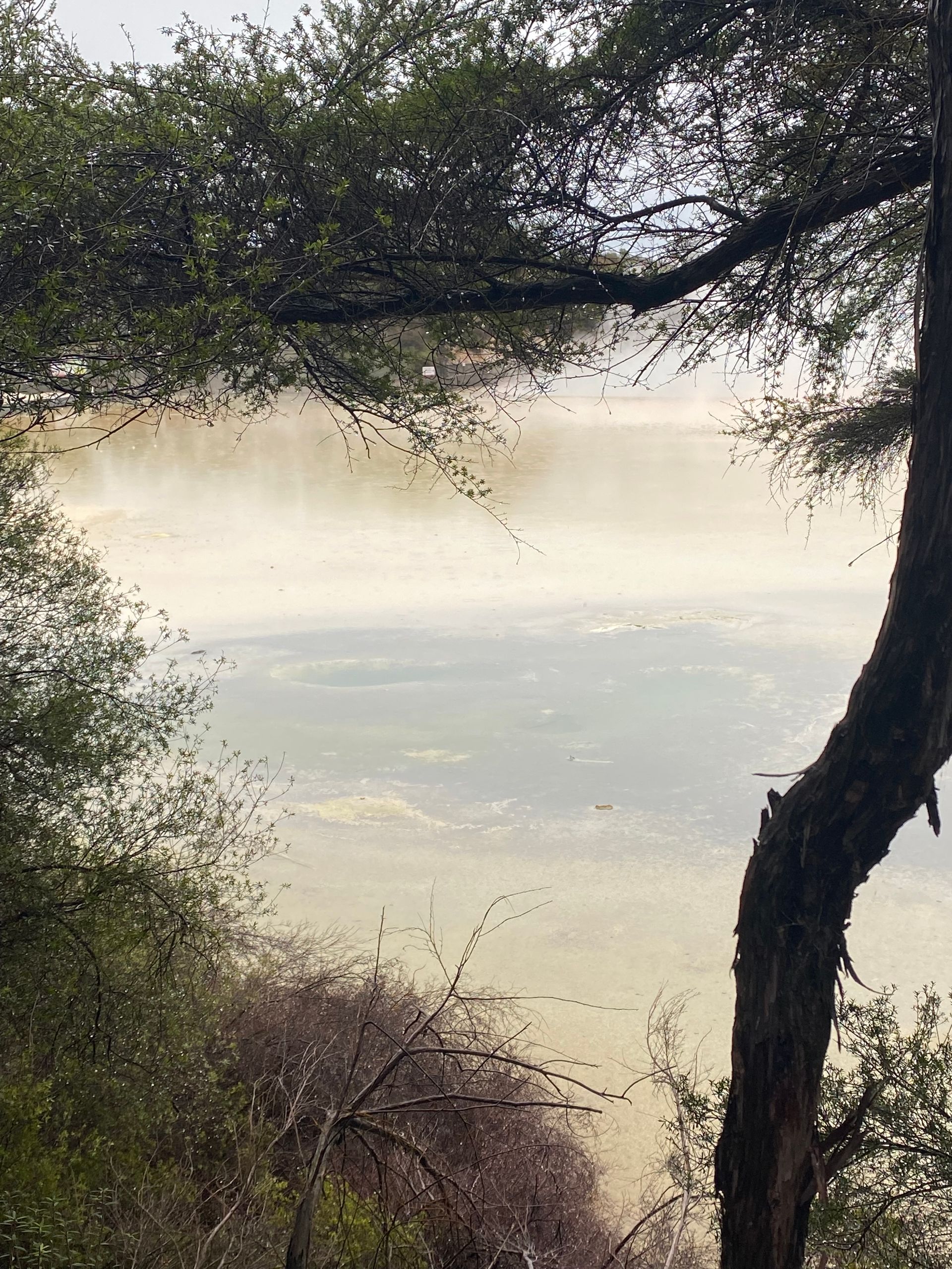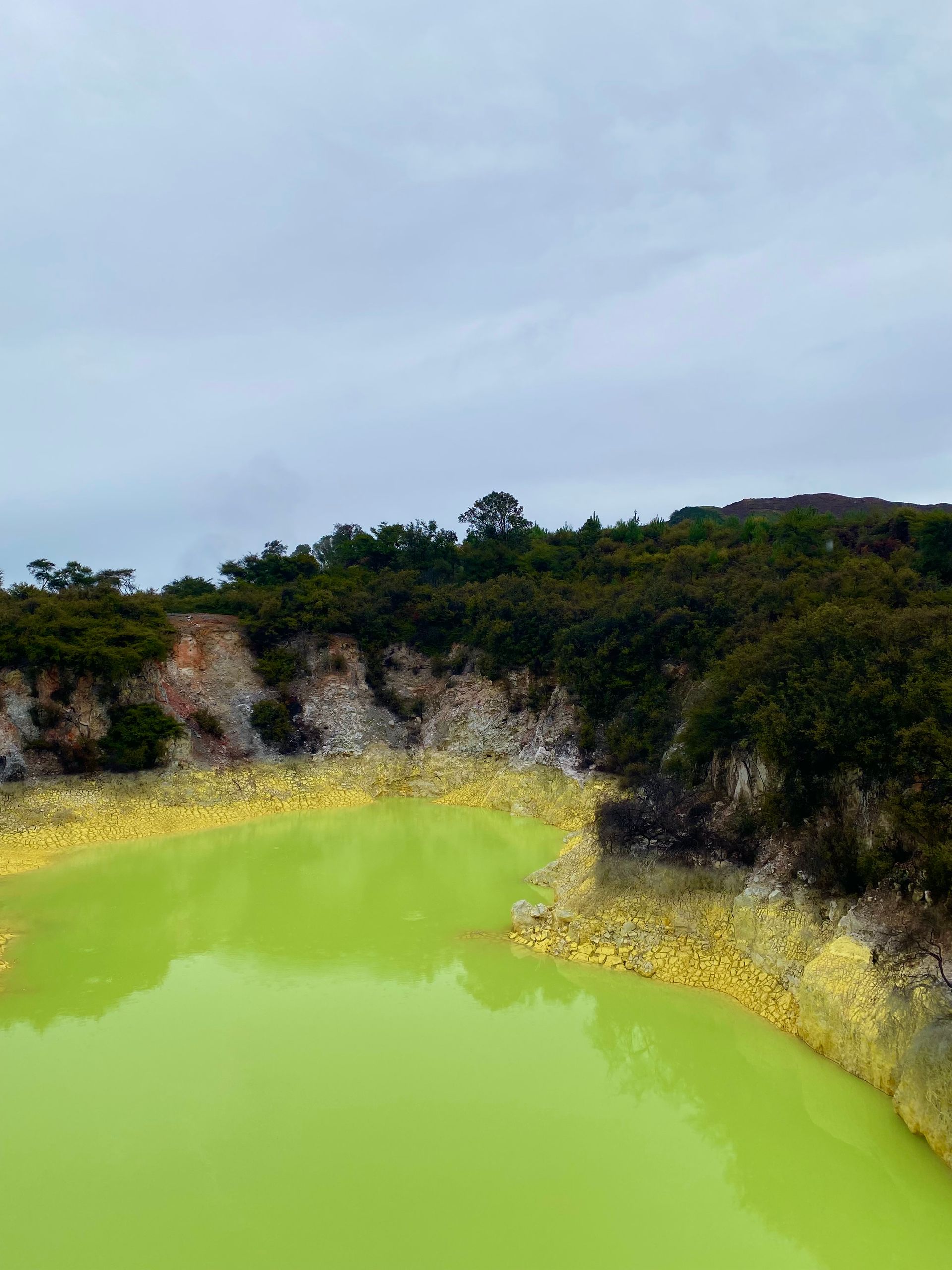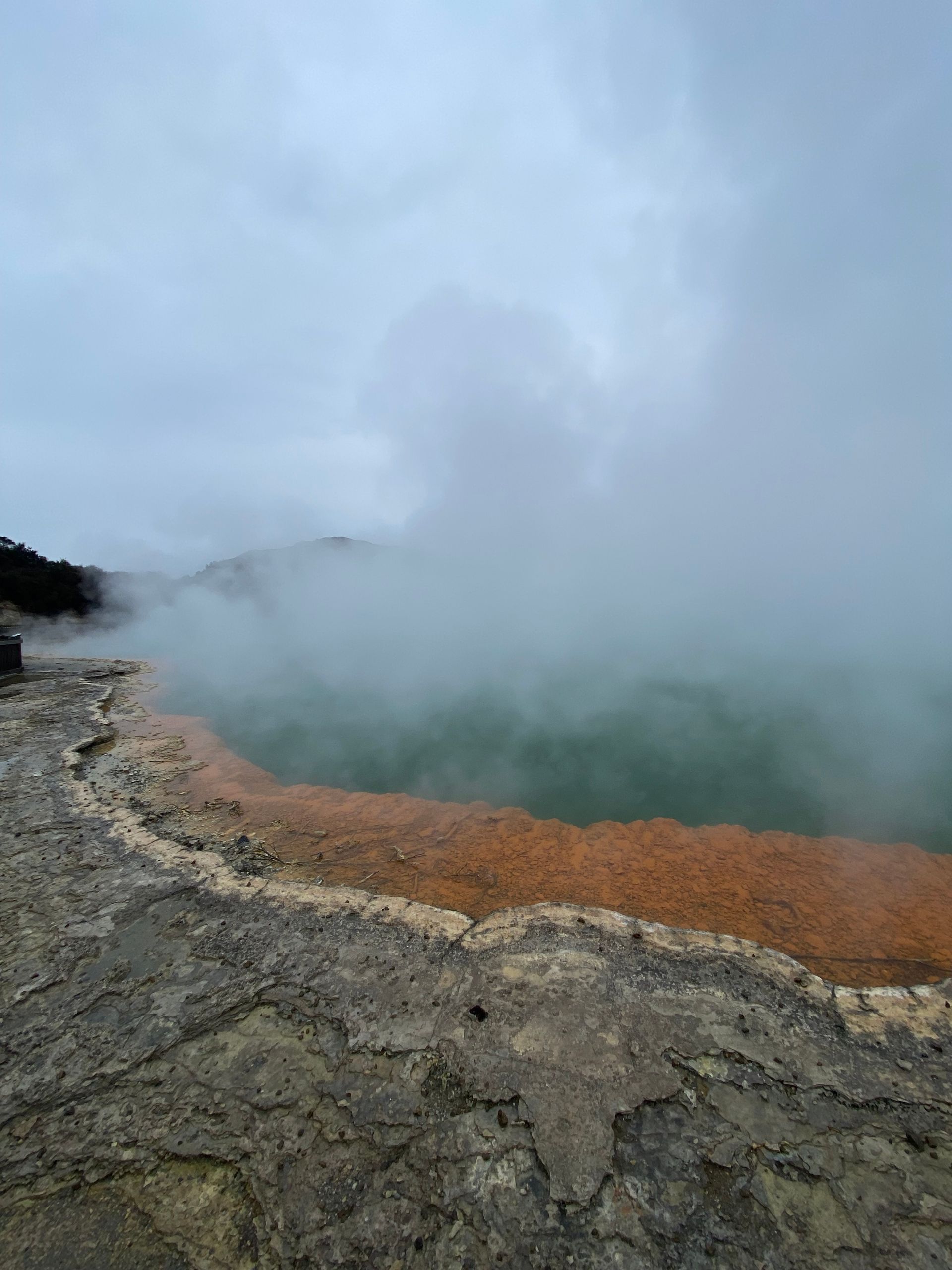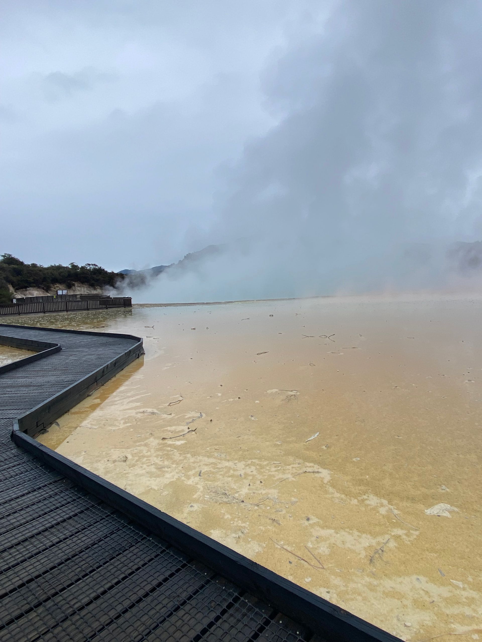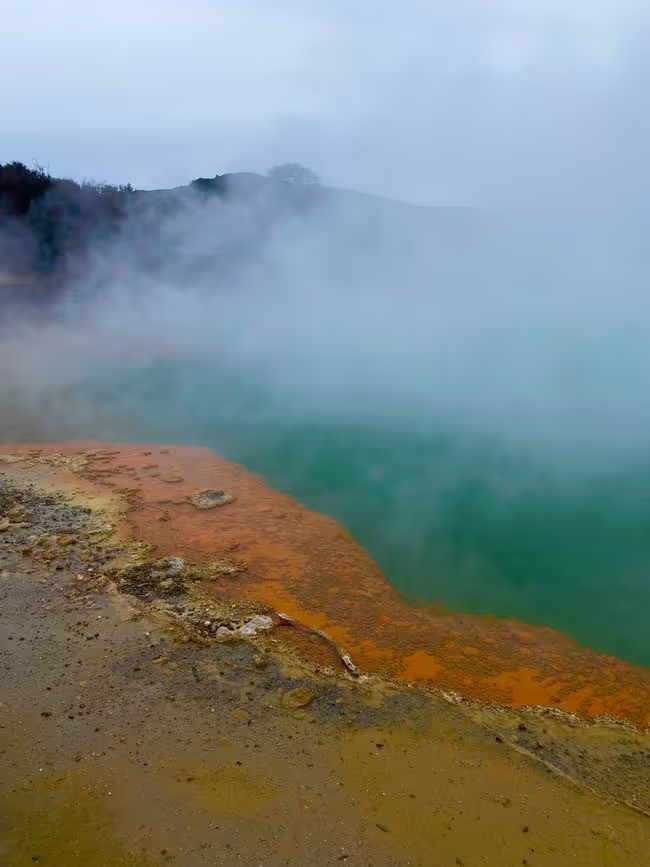 Since I couldn't decide at all, I had 2 parks in front of me today for about 100 dollars, and in hindsight, the second one would have been enough. However, the first one had one of the 2 world-renowned caves in a geothermal area, so that was pretty cool. So, first off, I went to: Orakei Korako Geothermal Park & Cave. The funny thing is that you are actually taken across the river by boat to see it. And since there were hardly any visitors, I basically had a private boat ride, just the captain and me. I also didn’t encounter a single person during the walk, so I had everything to myself. Since nothing was blocked by people, I went through it quite quickly, which for the price of 51 dollars was already crazy; maybe it wasn't worth it, but it was still very cool to see. You walk through wooden walkways, and there was a lot to see. However, it only got really cool in the second park: Wai-O-Tapu. There were definitely more people here, but thankfully it dispersed a bit. Here, there were huge craters, lots of steam, and super crazy colors, neon orange, yellow, etc. The Champagne Pool was really impressive. I treated myself there since financially it was all the same anyway. I had a pie and cheese, it was really good, and the brownie was 12/10. After that, I went to the Warm Lake. There was a small gravel road leading to it with bottomless potholes. A dude stopped me, saying, 'Yeah, it’s not so warm for swimming today, blabla,' it was quite nice, chatted briefly with him, and yes, the water was indeed like a bathtub, so I found it quite warm. However, since it was a muddy puddle full of worms, swimming was out of the question for me. So off I went to Rotorua, the city that smells more like rotten eggs than the parks. I was so lucky and snagged the last free parking spot at the camp. I then walked to see the hot water park. In the middle of the city, there are steaming, boiling lakes at 100 degrees. No wonder it stinks here. For whatever reason, there are really alarmingly many homeless people and junkies (can you say that? Yeah, you know what I mean). I was at the i-site a bit, maybe because I almost used everything up :) Tomorrow there’s still a lot planned here before I head to Hamilton. Now that the sun is actually out, I will take a walk this afternoon and enjoy it and try to get used to the smell.