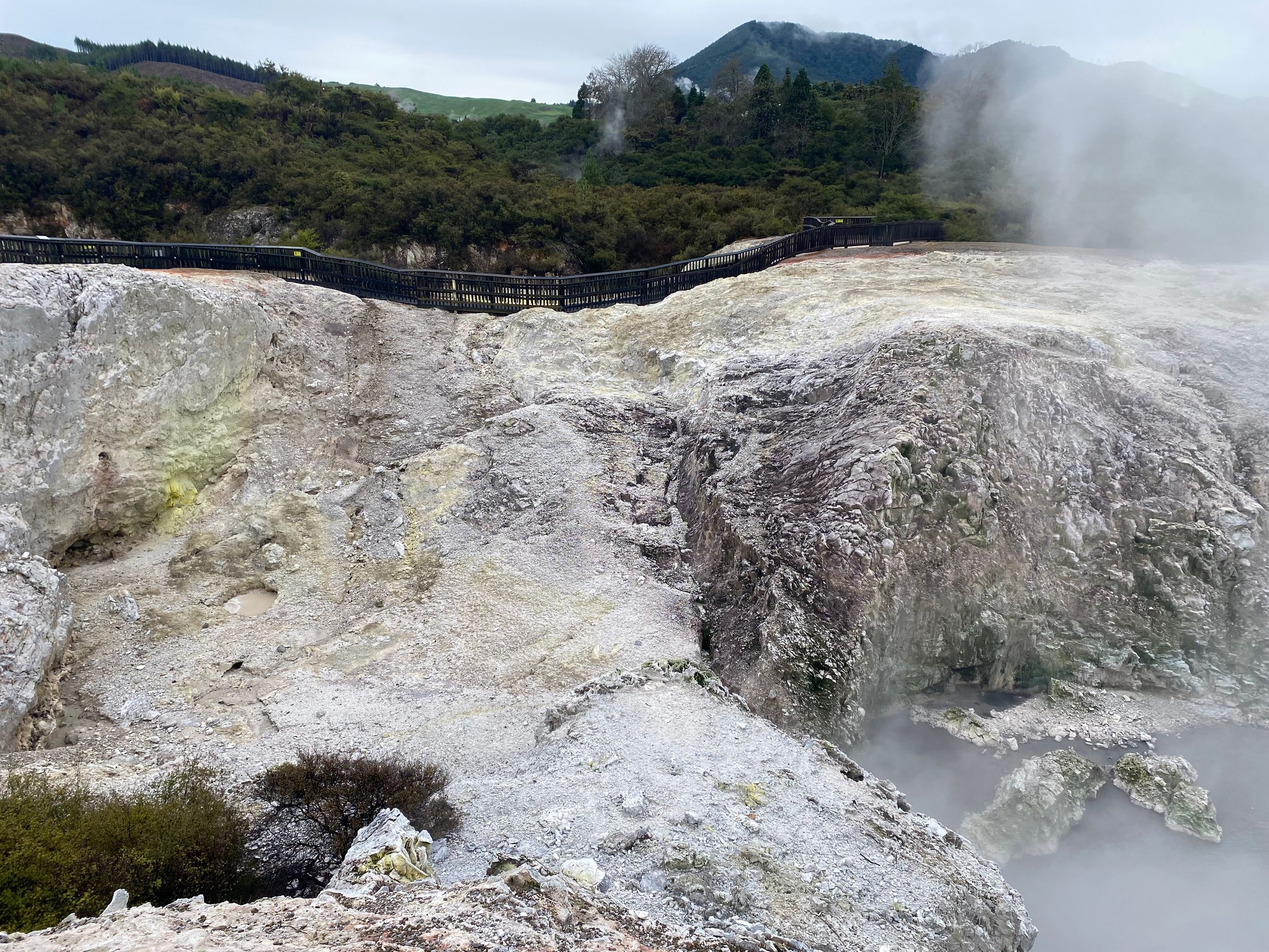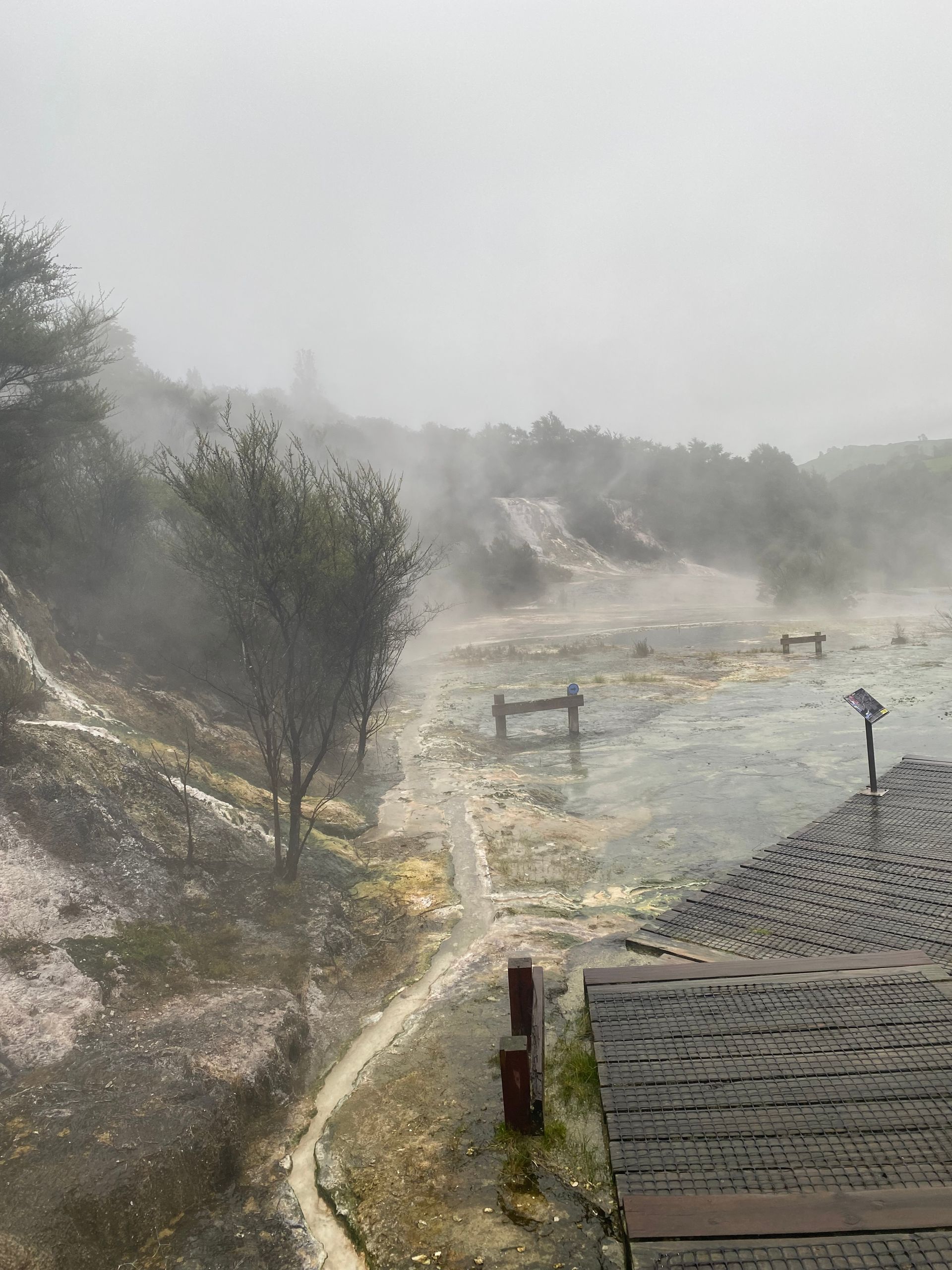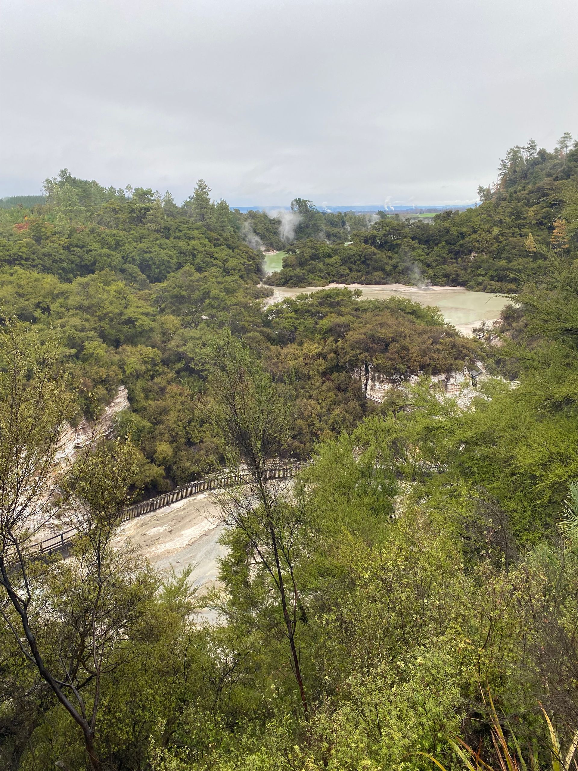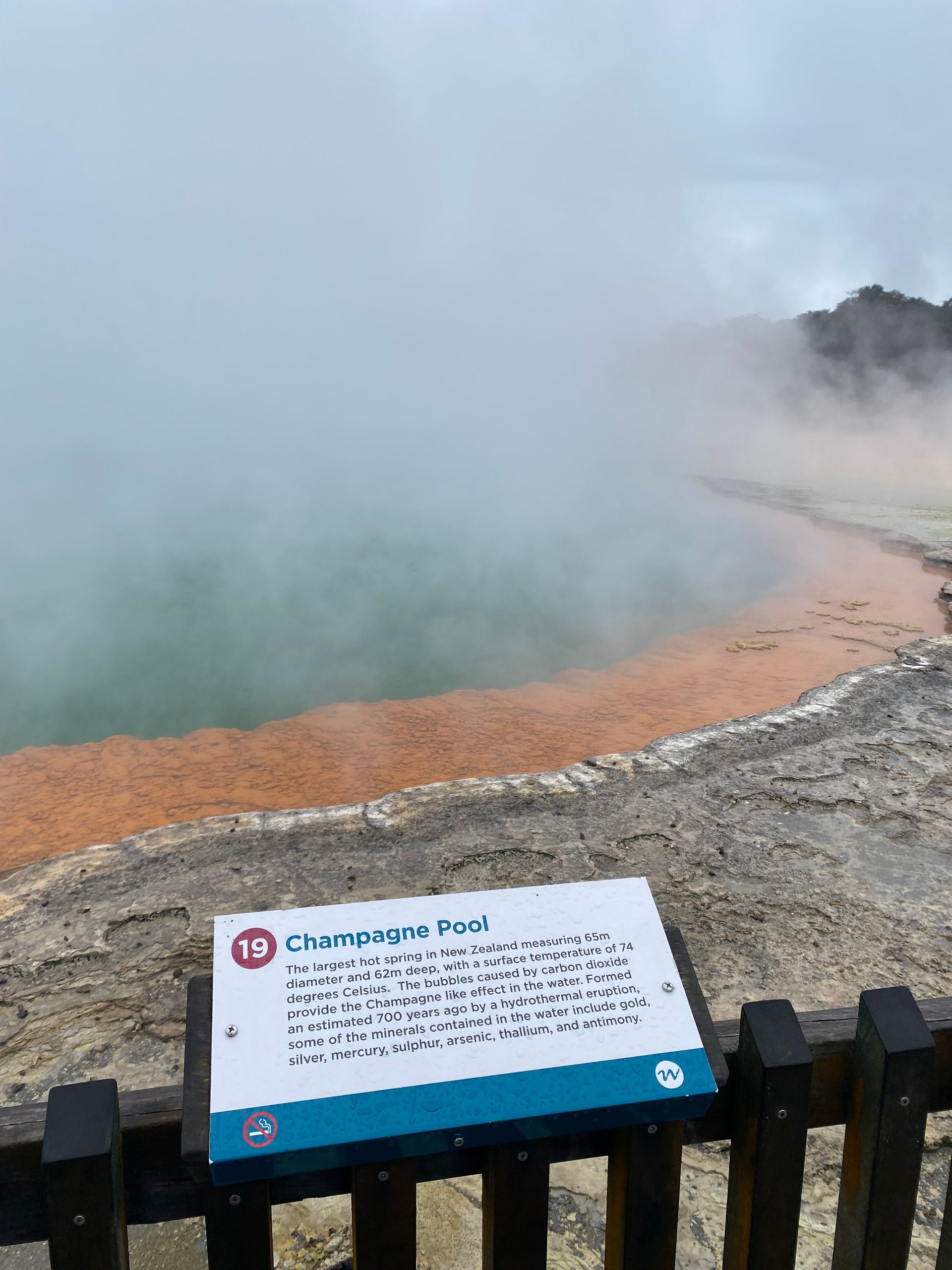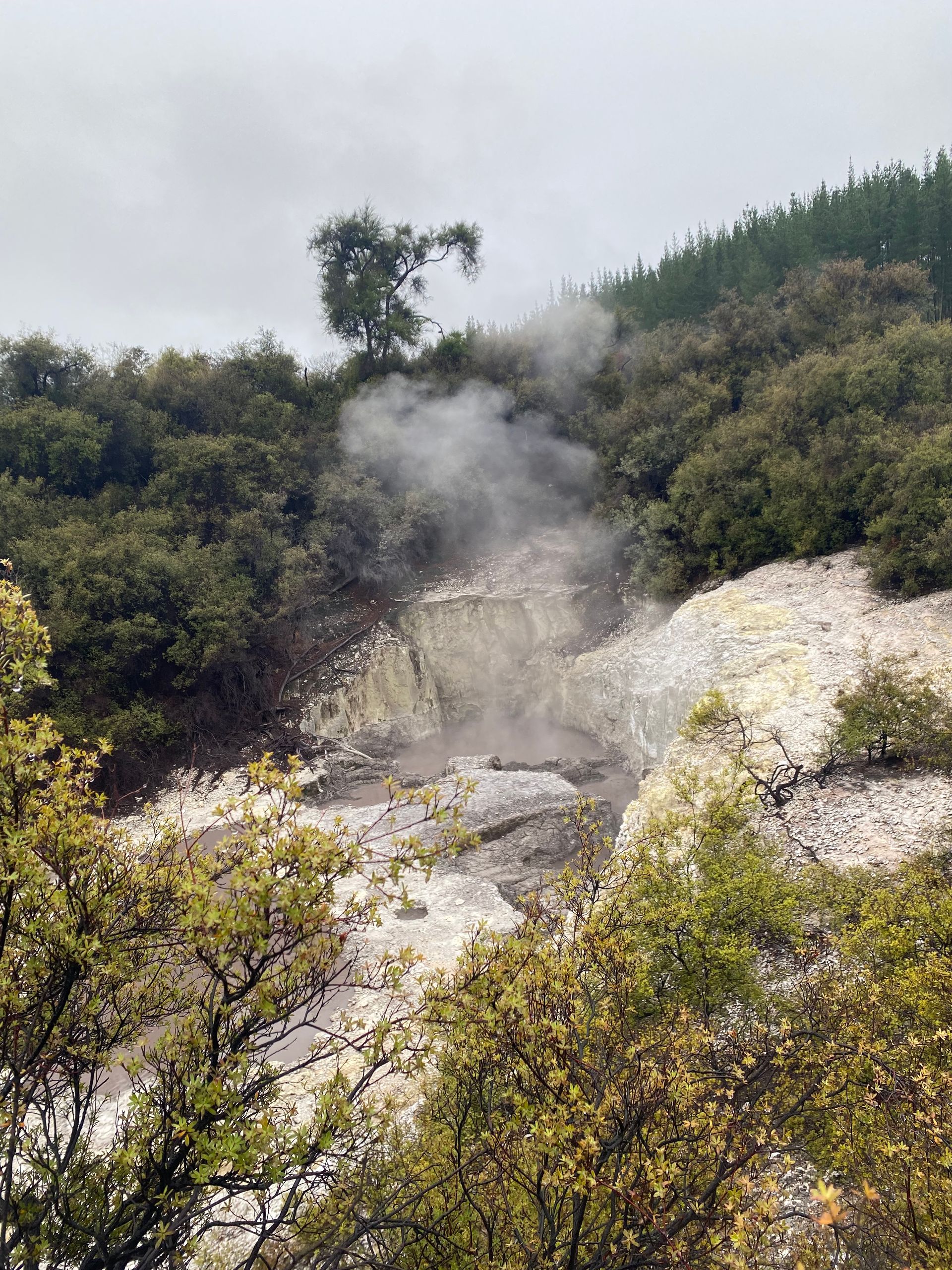Since I couldn't decide at all, I had 2 parks in front of me today for about 100 dollars, and in hindsight, the second one would have been enough. However, the first one had one of the 2 world-renowned caves in a geothermal area, so that was pretty cool. So, first off, I went to: Orakei Korako Geothermal Park & Cave. The funny thing is that you are actually taken across the river by boat to see it. And since there were hardly any visitors, I basically had a private boat ride, just the captain and me. I also didn’t encounter a single person during the walk, so I had everything to myself. Since nothing was blocked by people, I went through it quite quickly, which for the price of 51 dollars was already crazy; maybe it wasn't worth it, but it was still very cool to see. You walk through wooden walkways, and there was a lot to see. However, it only got really cool in the second park: Wai-O-Tapu. There were definitely more people here, but thankfully it dispersed a bit. Here, there were huge craters, lots of steam, and super crazy colors, neon orange, yellow, etc. The Champagne Pool was really impressive. I treated myself there since financially it was all the same anyway. I had a pie and cheese, it was really good, and the brownie was 12/10. After that, I went to the Warm Lake. There was a small gravel road leading to it with bottomless potholes. A dude stopped me, saying, 'Yeah, it’s not so warm for swimming today, blabla,' it was quite nice, chatted briefly with him, and yes, the water was indeed like a bathtub, so I found it quite warm. However, since it was a muddy puddle full of worms, swimming was out of the question for me. So off I went to Rotorua, the city that smells more like rotten eggs than the parks. I was so lucky and snagged the last free parking spot at the camp. I then walked to see the hot water park. In the middle of the city, there are steaming, boiling lakes at 100 degrees. No wonder it stinks here. For whatever reason, there are really alarmingly many homeless people and junkies (can you say that? Yeah, you know what I mean). I was at the i-site a bit, maybe because I almost used everything up :) Tomorrow there’s still a lot planned here before I head to Hamilton. Now that the sun is actually out, I will take a walk this afternoon and enjoy it and try to get used to the smell.