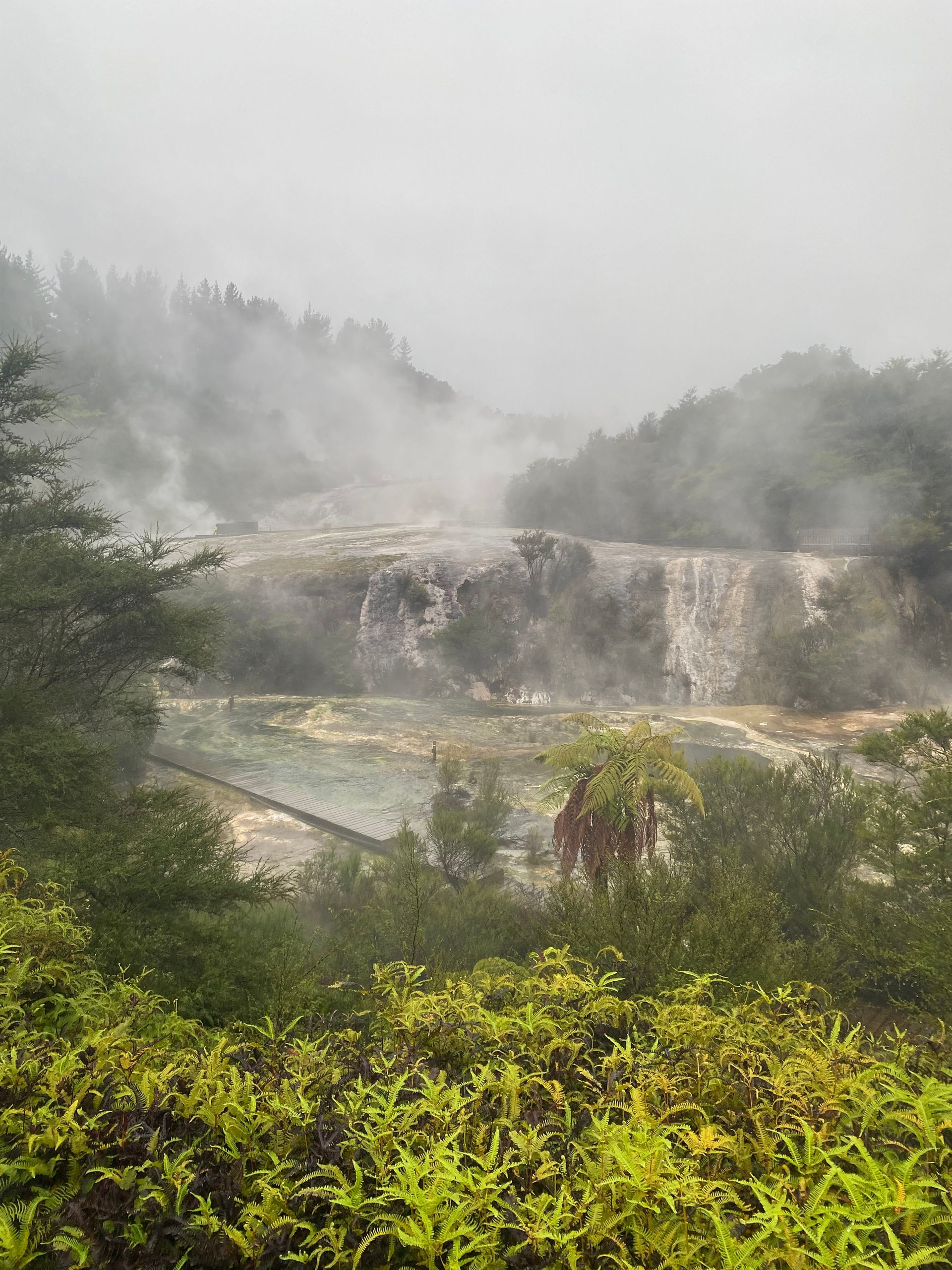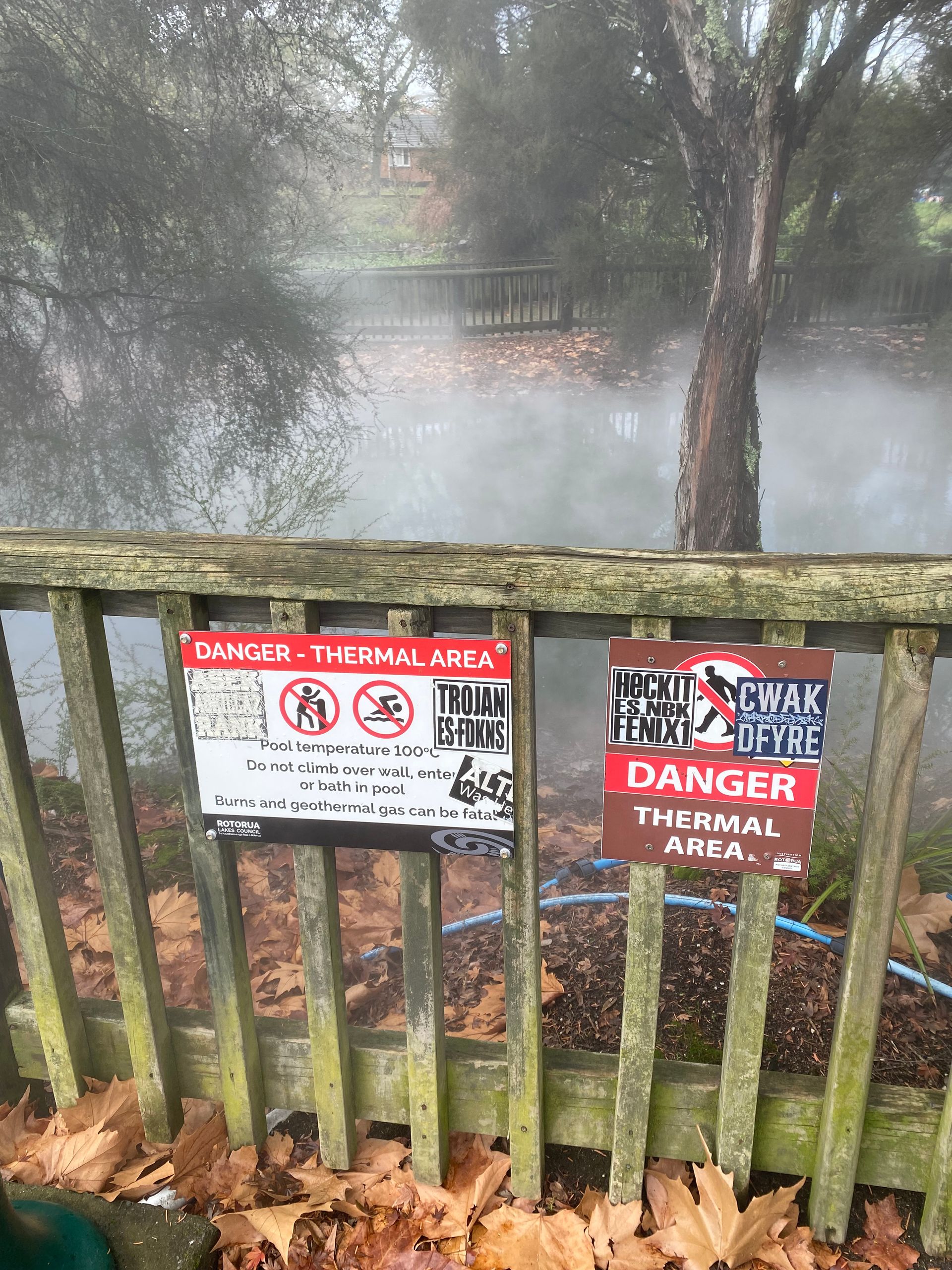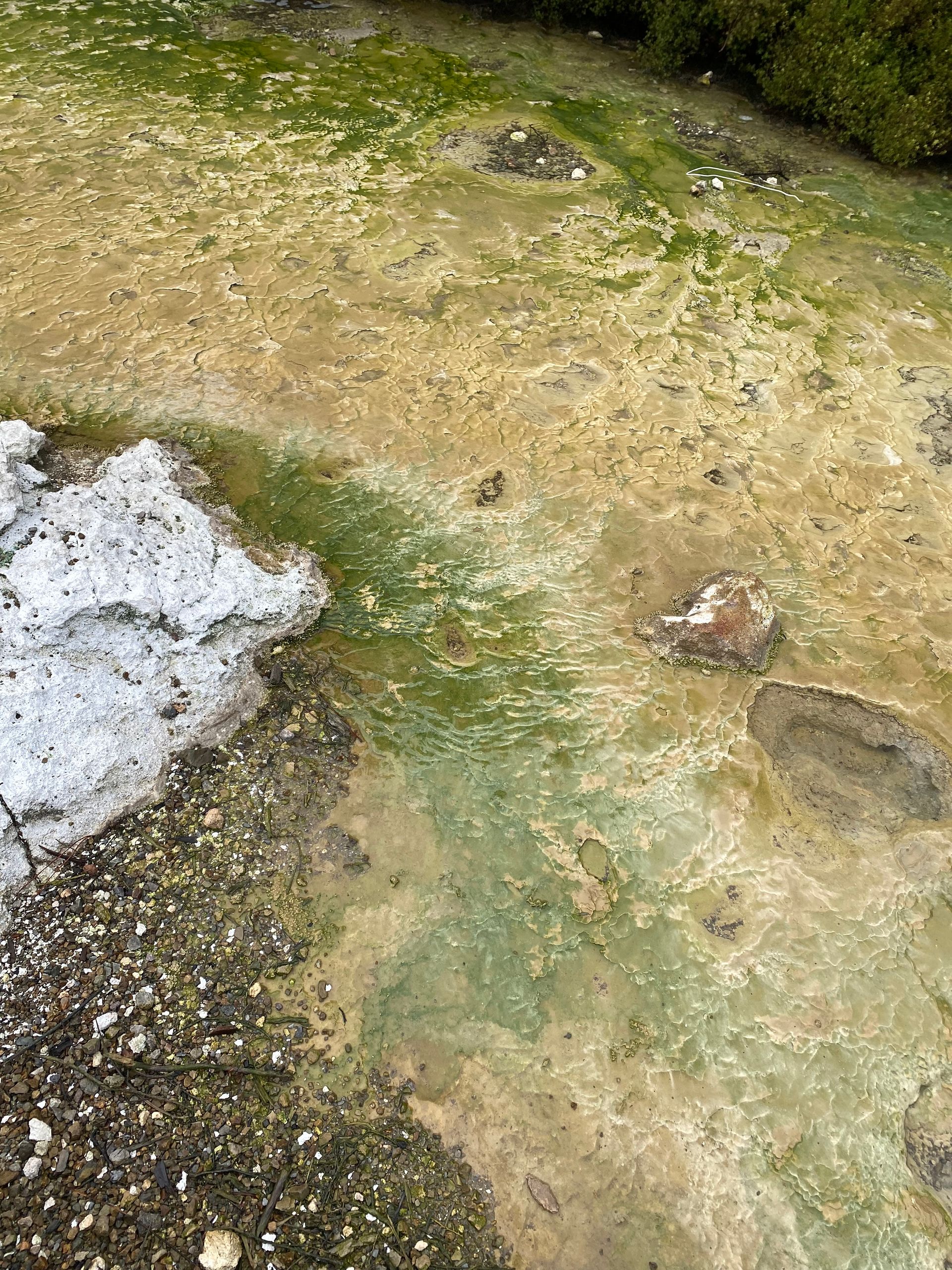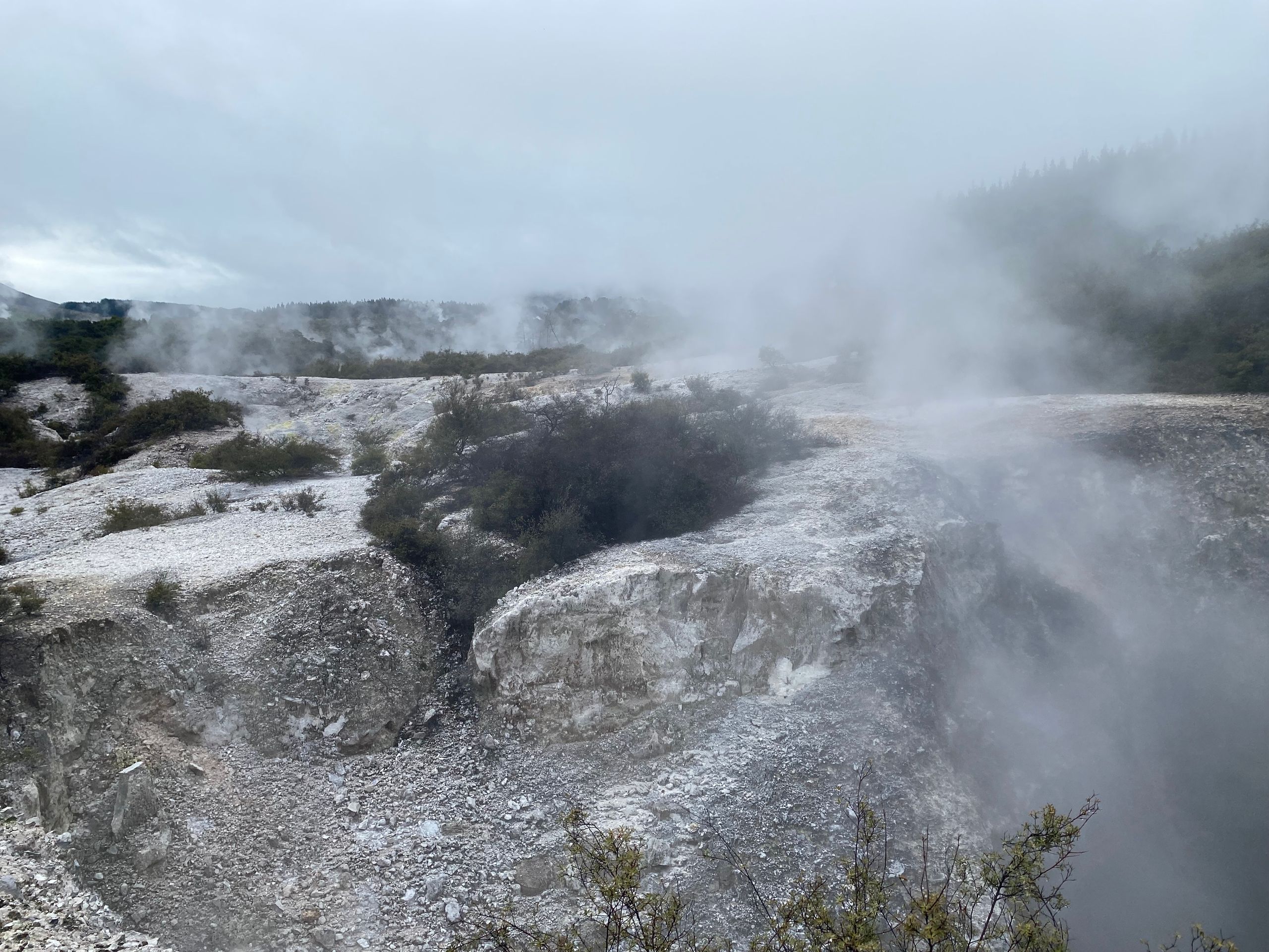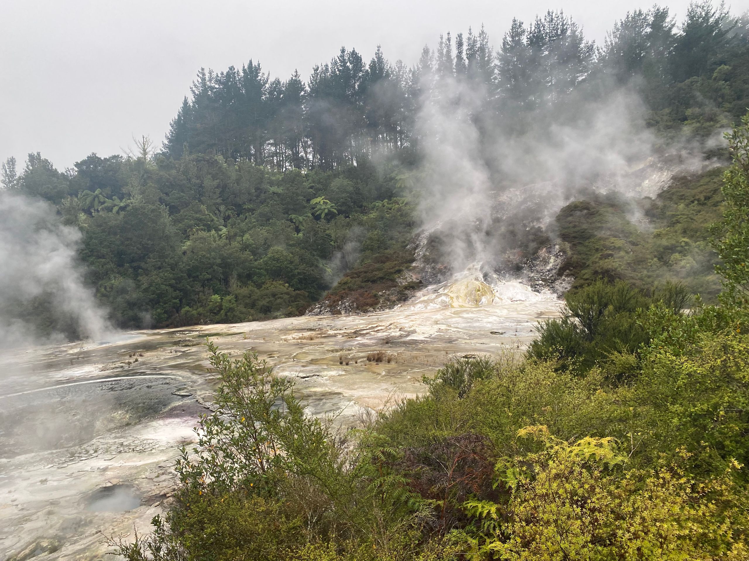 Since I couldn't decide at all, I had 2 parks in front of me today for about 100 dollars, and in hindsight, the second one would have been enough. However, the first one had one of the 2 world-renowned caves in a geothermal area, so that was pretty cool. So, first off, I went to: Orakei Korako Geothermal Park & Cave. The funny thing is that you are actually taken across the river by boat to see it. And since there were hardly any visitors, I basically had a private boat ride, just the captain and me. I also didn’t encounter a single person during the walk, so I had everything to myself. Since nothing was blocked by people, I went through it quite quickly, which for the price of 51 dollars was already crazy; maybe it wasn't worth it, but it was still very cool to see. You walk through wooden walkways, and there was a lot to see. However, it only got really cool in the second park: Wai-O-Tapu. There were definitely more people here, but thankfully it dispersed a bit. Here, there were huge craters, lots of steam, and super crazy colors, neon orange, yellow, etc. The Champagne Pool was really impressive. I treated myself there since financially it was all the same anyway. I had a pie and cheese, it was really good, and the brownie was 12/10. After that, I went to the Warm Lake. There was a small gravel road leading to it with bottomless potholes. A dude stopped me, saying, 'Yeah, it’s not so warm for swimming today, blabla,' it was quite nice, chatted briefly with him, and yes, the water was indeed like a bathtub, so I found it quite warm. However, since it was a muddy puddle full of worms, swimming was out of the question for me. So off I went to Rotorua, the city that smells more like rotten eggs than the parks. I was so lucky and snagged the last free parking spot at the camp. I then walked to see the hot water park. In the middle of the city, there are steaming, boiling lakes at 100 degrees. No wonder it stinks here. For whatever reason, there are really alarmingly many homeless people and junkies (can you say that? Yeah, you know what I mean). I was at the i-site a bit, maybe because I almost used everything up :) Tomorrow there’s still a lot planned here before I head to Hamilton. Now that the sun is actually out, I will take a walk this afternoon and enjoy it and try to get used to the smell.