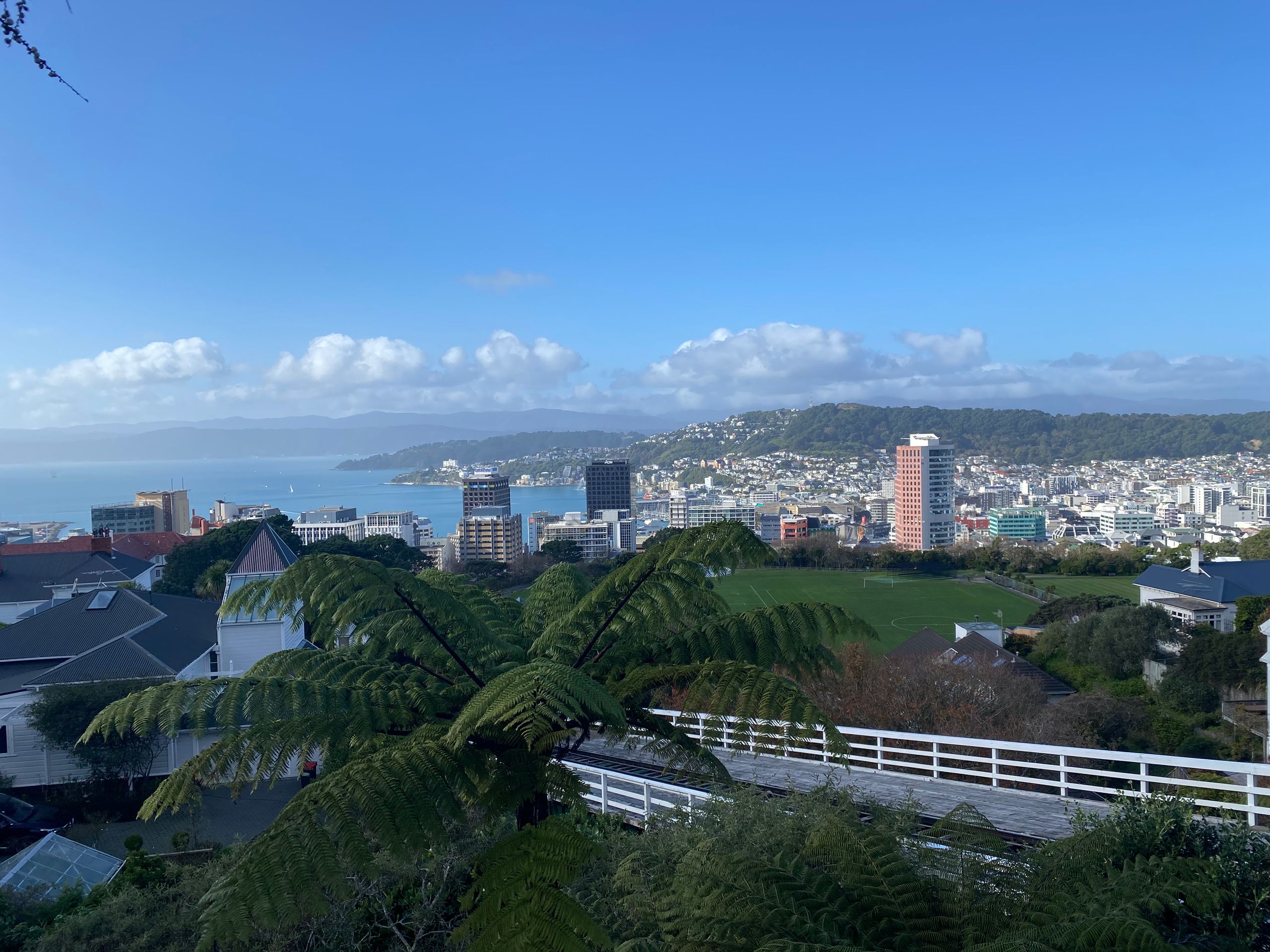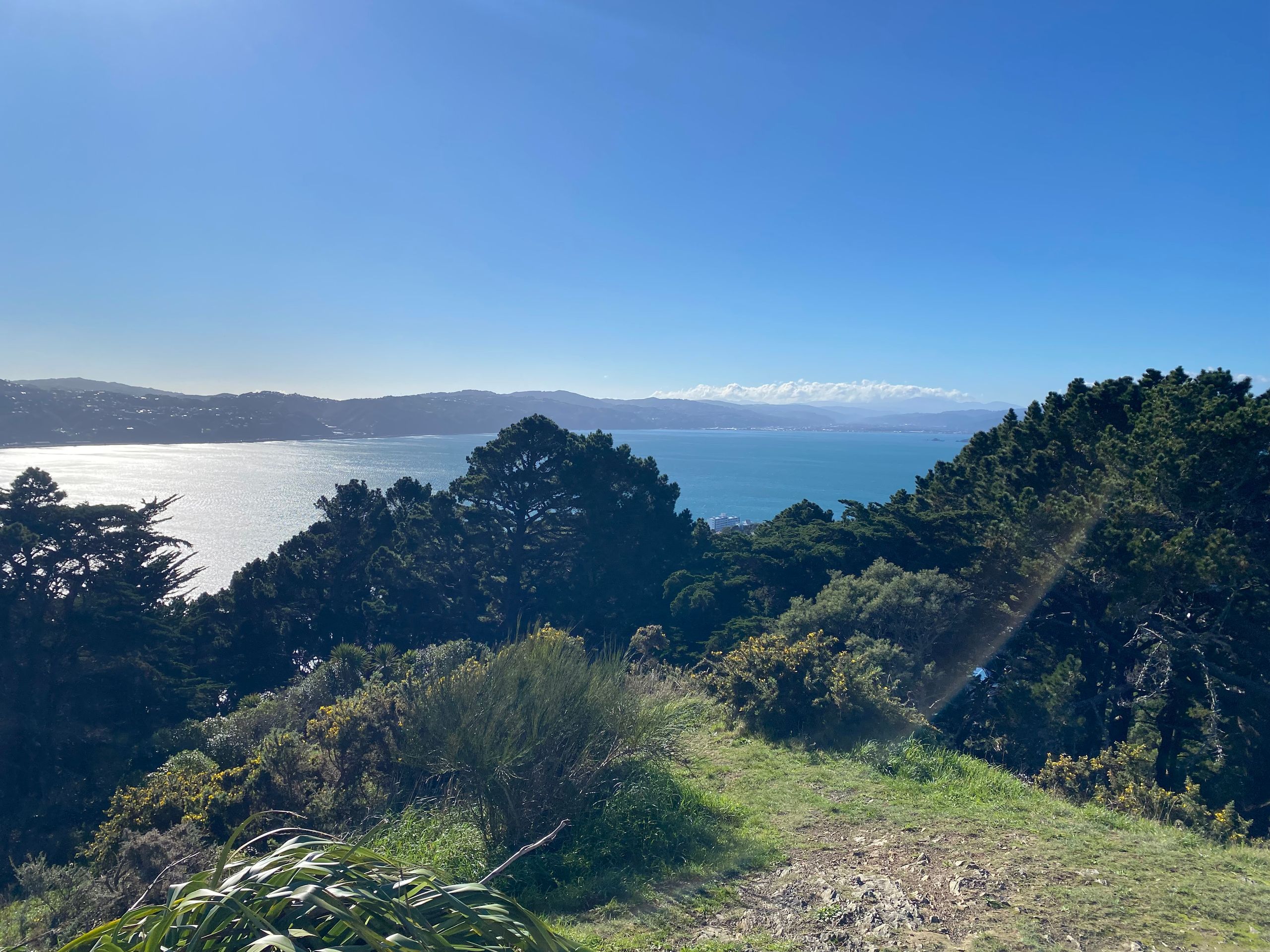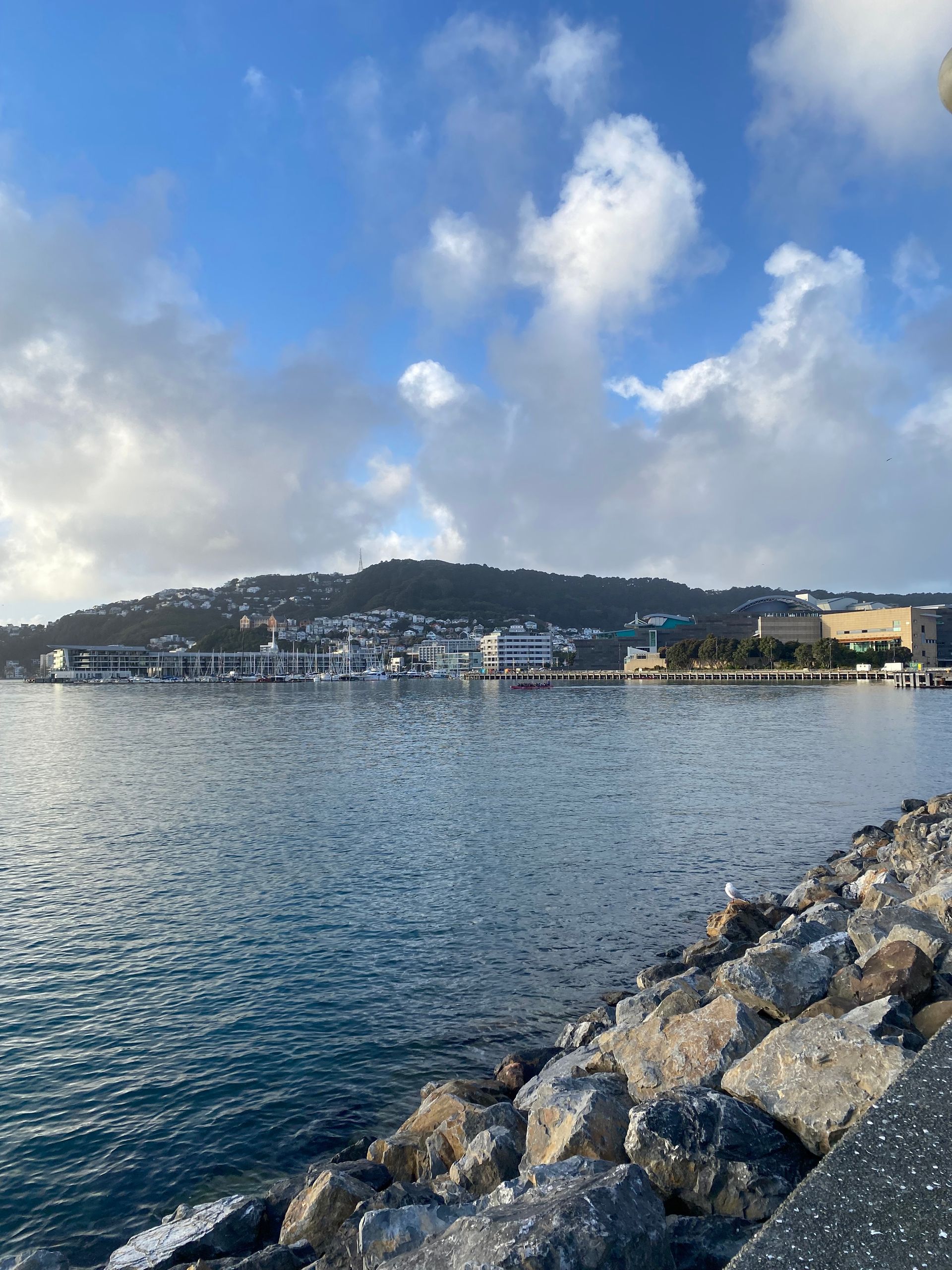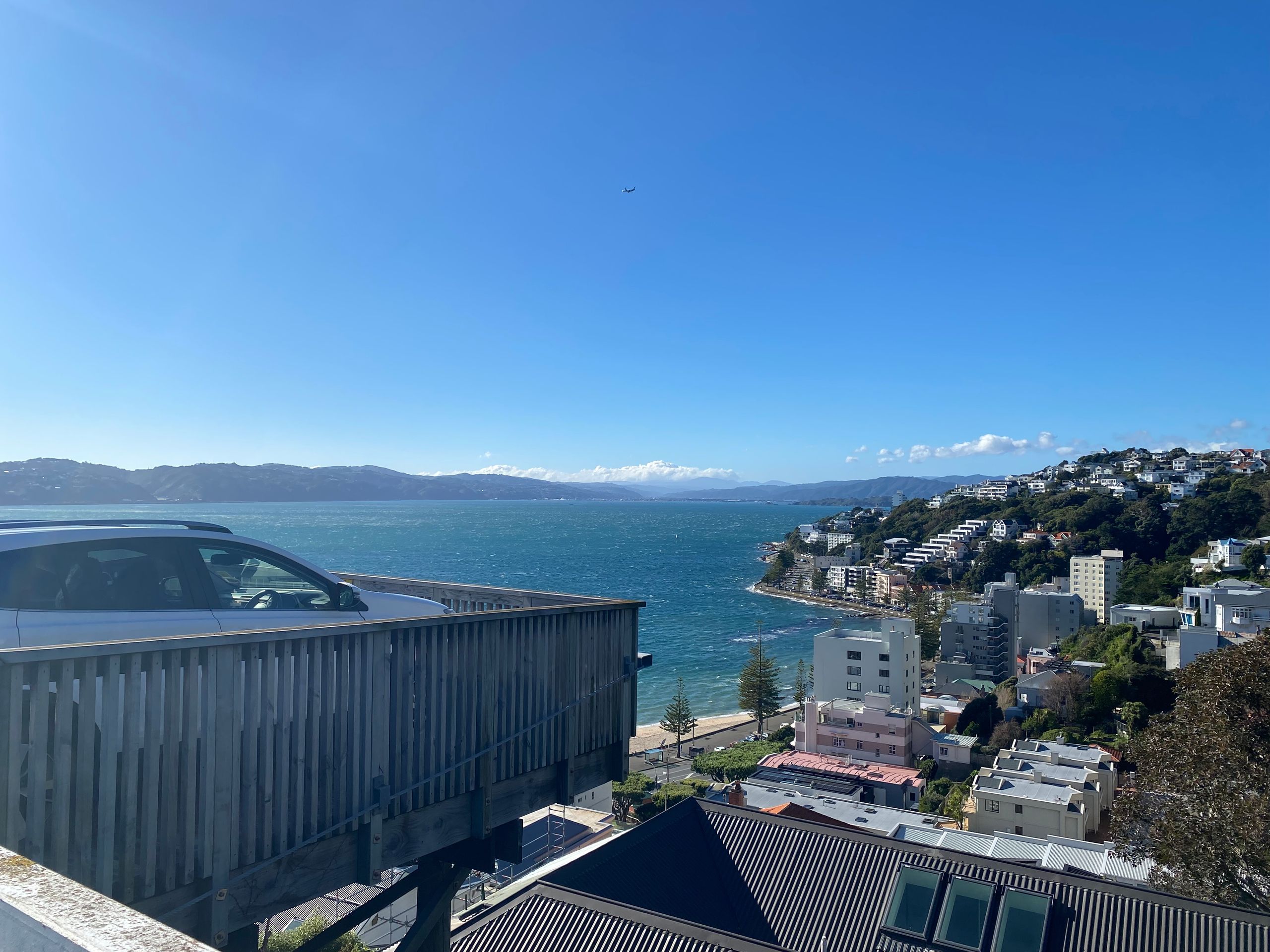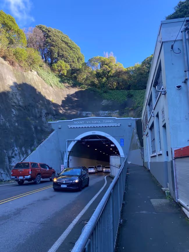 Then, to completely wear myself out, I walked through the Mt. Victoria tunnel and then, as you might expect, up Mt. Victoria. It was okay; it wasn't that high, but I had such a cool view over the city and the sea, a 360-degree panoramic view. On the way, I made a few stops on nice benches and then went down to Oriental Bay. A mega beautiful beach with the skyscrapers in the background. I then walked back along the sea to the camp, and the wind was already blowing before, it's quite windy in Wellington anyway. But on the way, I almost got blown away; it was really hard to keep my balance, I tell you. That was funny at first, but eventually, it got annoying and I still had many kilometers ahead of me. After some time and two blisters later, I was at the car. I later got food for dinner because I can’t cook here.