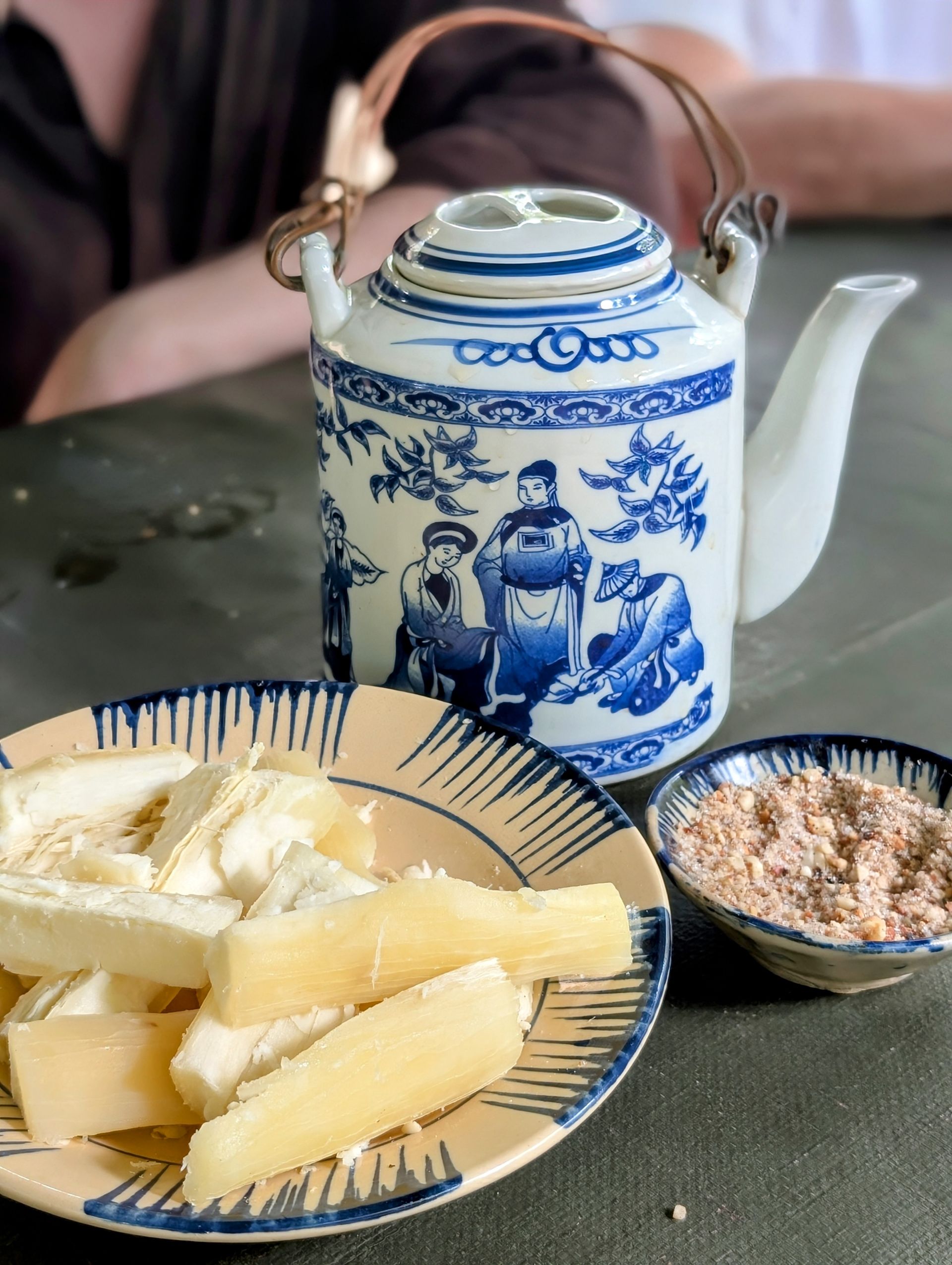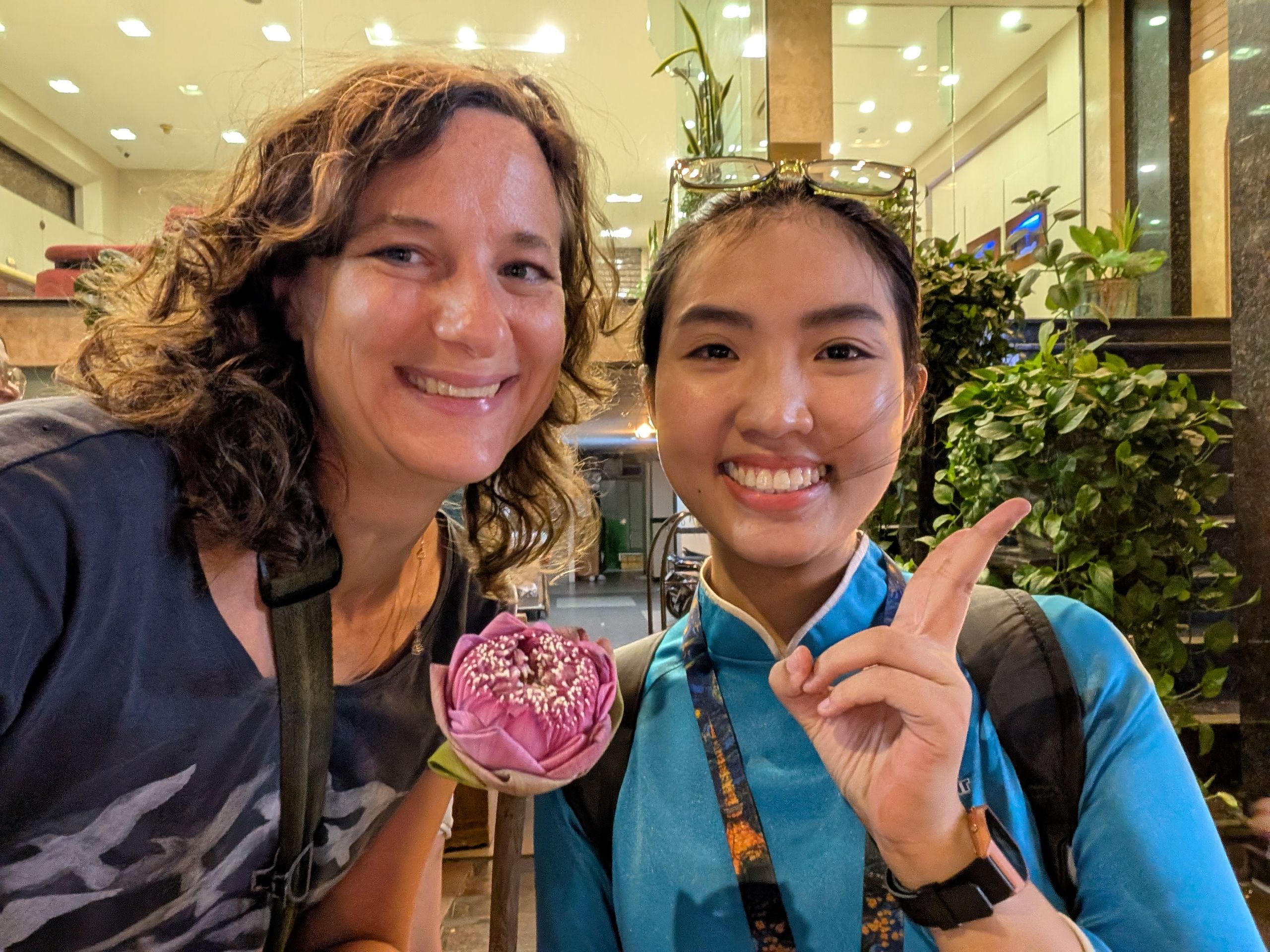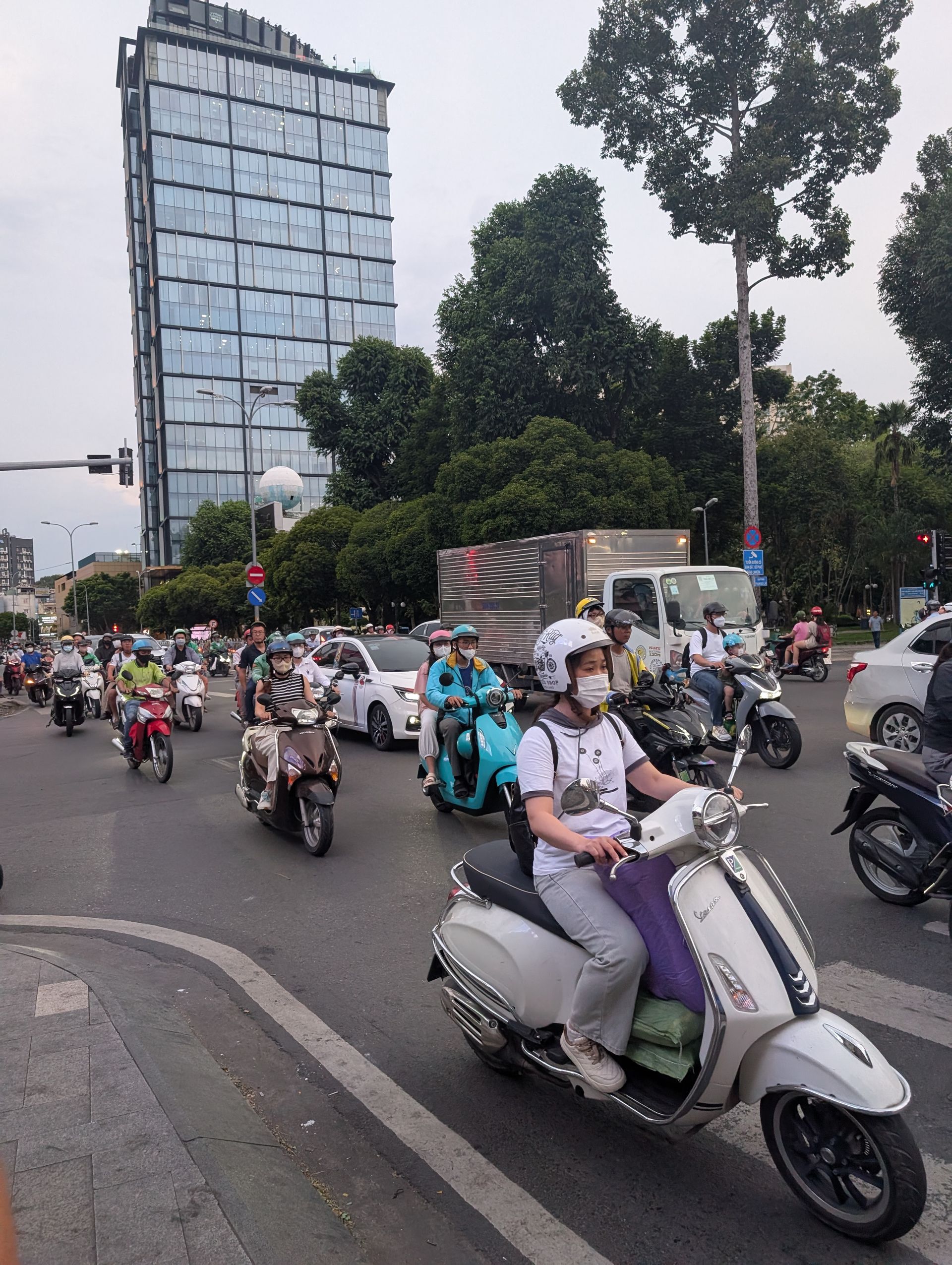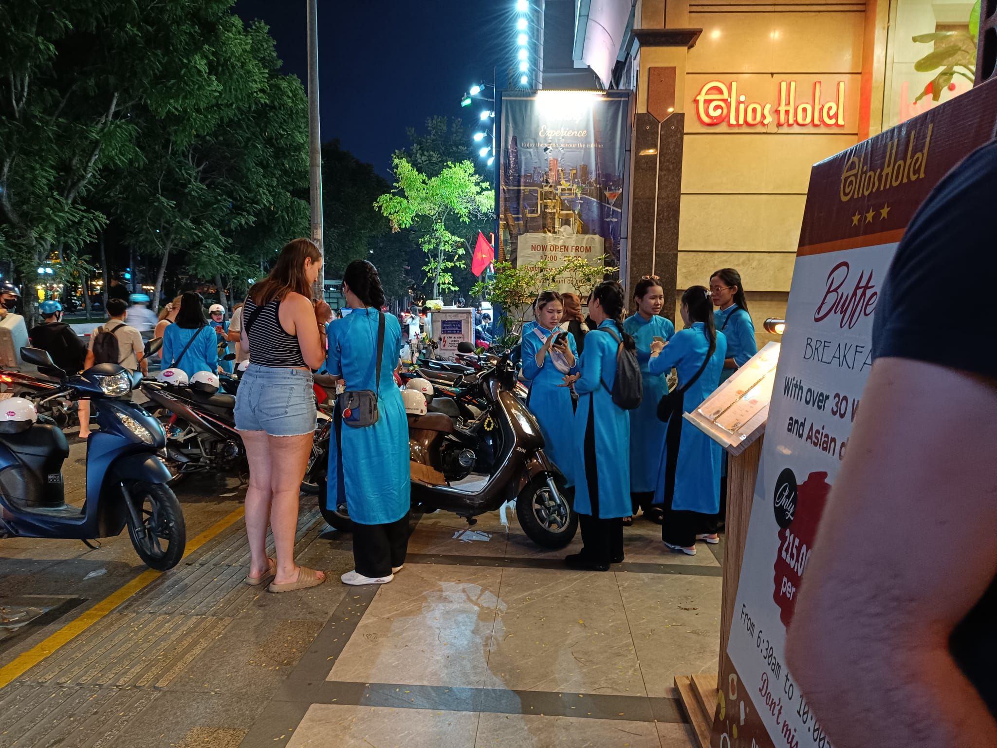 A group of young women dressed in blue picks us up on their scooters, and we zip through the evening streets of Sài Gòn – a cheerful, colorful street food tour. Riding a scooter here is a whole different league, and I talk to my tour guide a lot about traffic, rules, languages, and life in our two very different countries. We eat Bánh mì, Bánh xèo, Bánh khoai lang chiên, Pizza Việt Nam, and Kem bơ. So basically: sandwich, pancakes, fries, pizza, and ice cream – just in Vietnamese. For one specialty, only two people dare – despite my 'Oh yes!' resolution, I’m not joining, as it clearly exceeds my comfort zone: Trứng vịt lộn, a nearly developed duck fetus in the egg. Bon appétit…