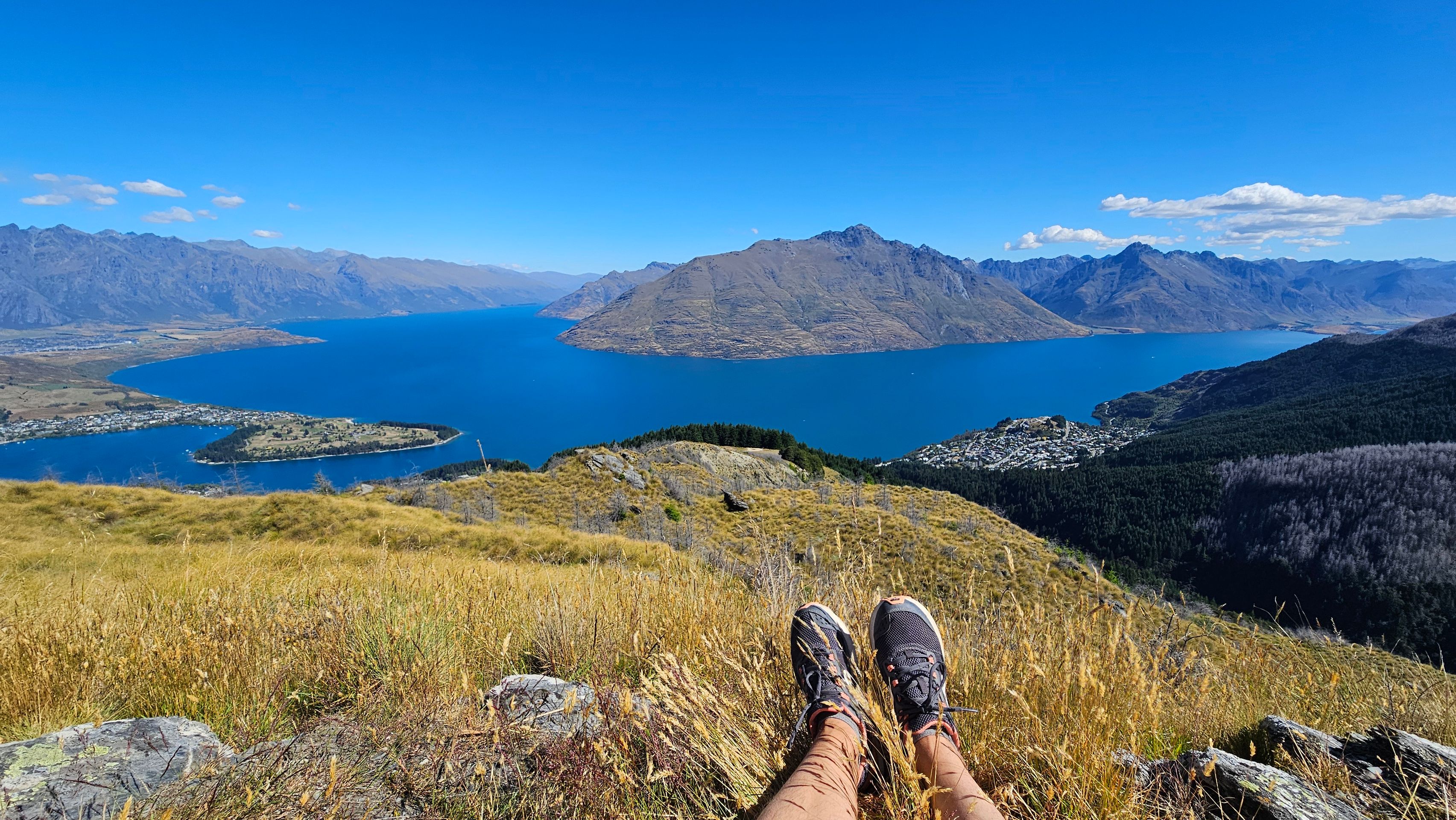 The next morning, I took a quick dip in the ice-cold Lake Wakatipu and then just strolled around the city a bit. In Queenstown, there’s something for everyone: you can ride the gondola, paraglide, indoor skydive, zip-line, mountain bike, go on a summer toboggan run, bungee jump,... I hiked on the Tiki Trail to the gondola station, took a look at Queenstown from above, and then continued up the Ben Lomond Track a bit further until I left the hustle and bustle and all the people behind me. There, I sat down on the grass, enjoyed the sun warming me, and took in the view of the town and Lake Wakatipu.