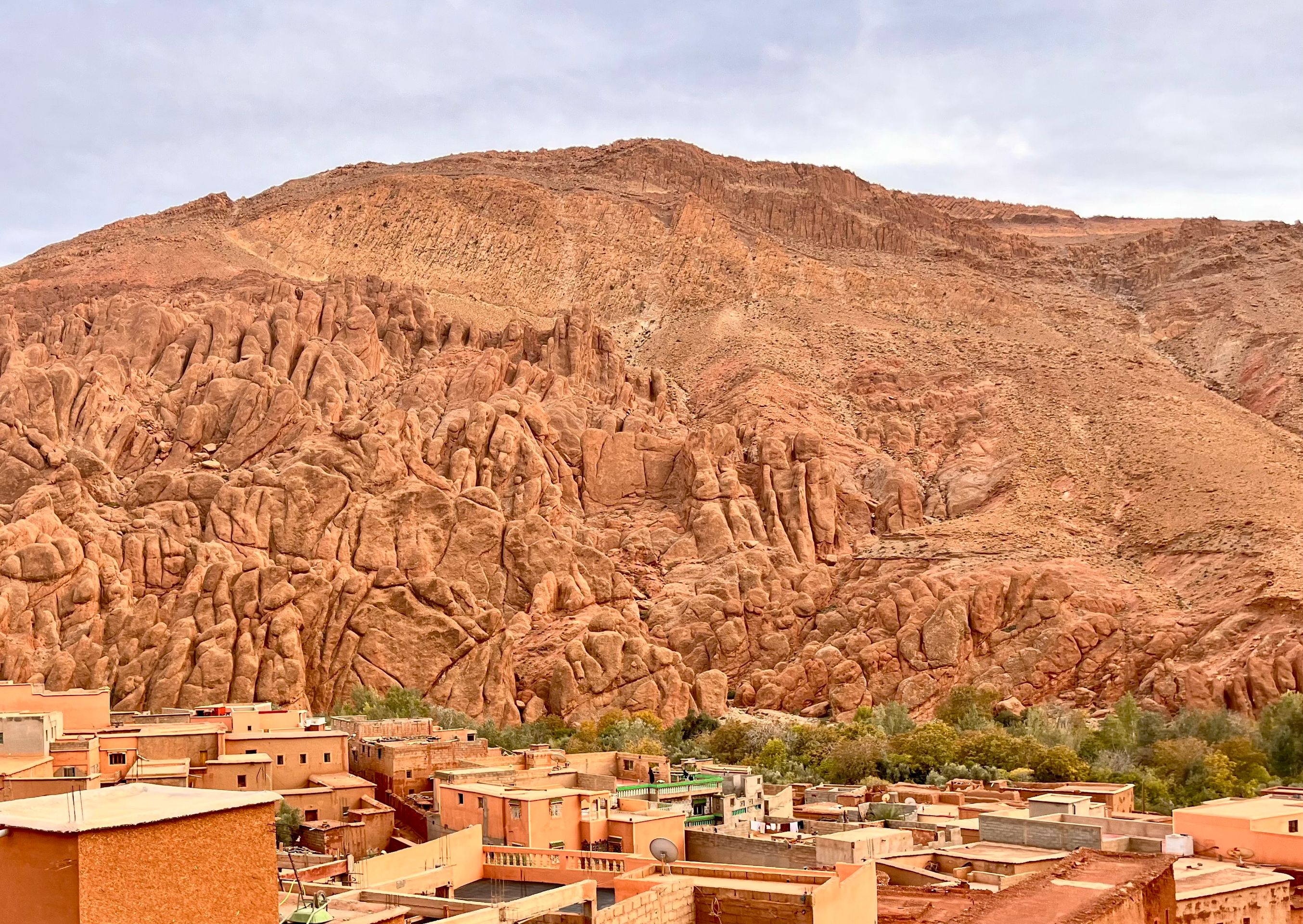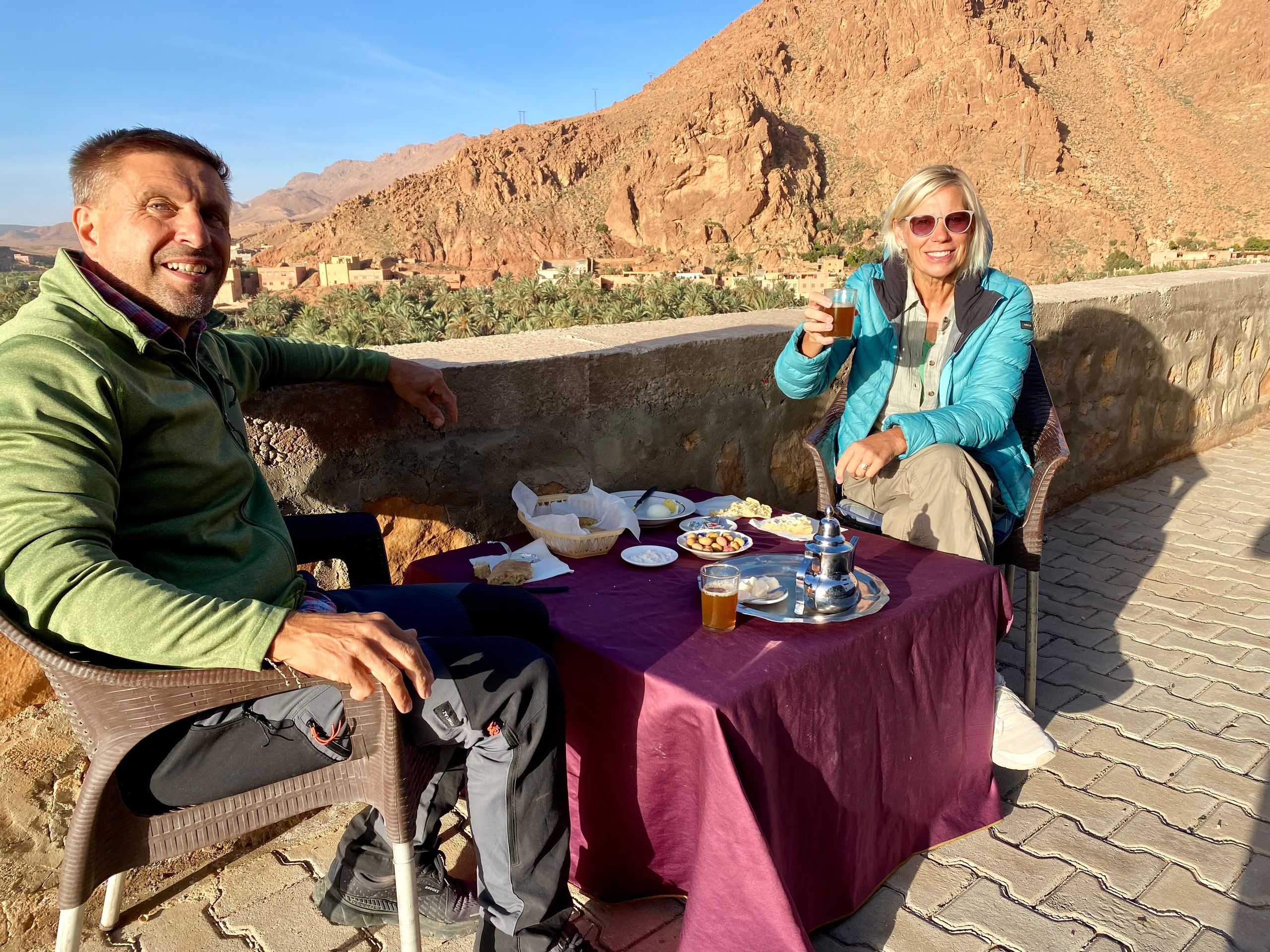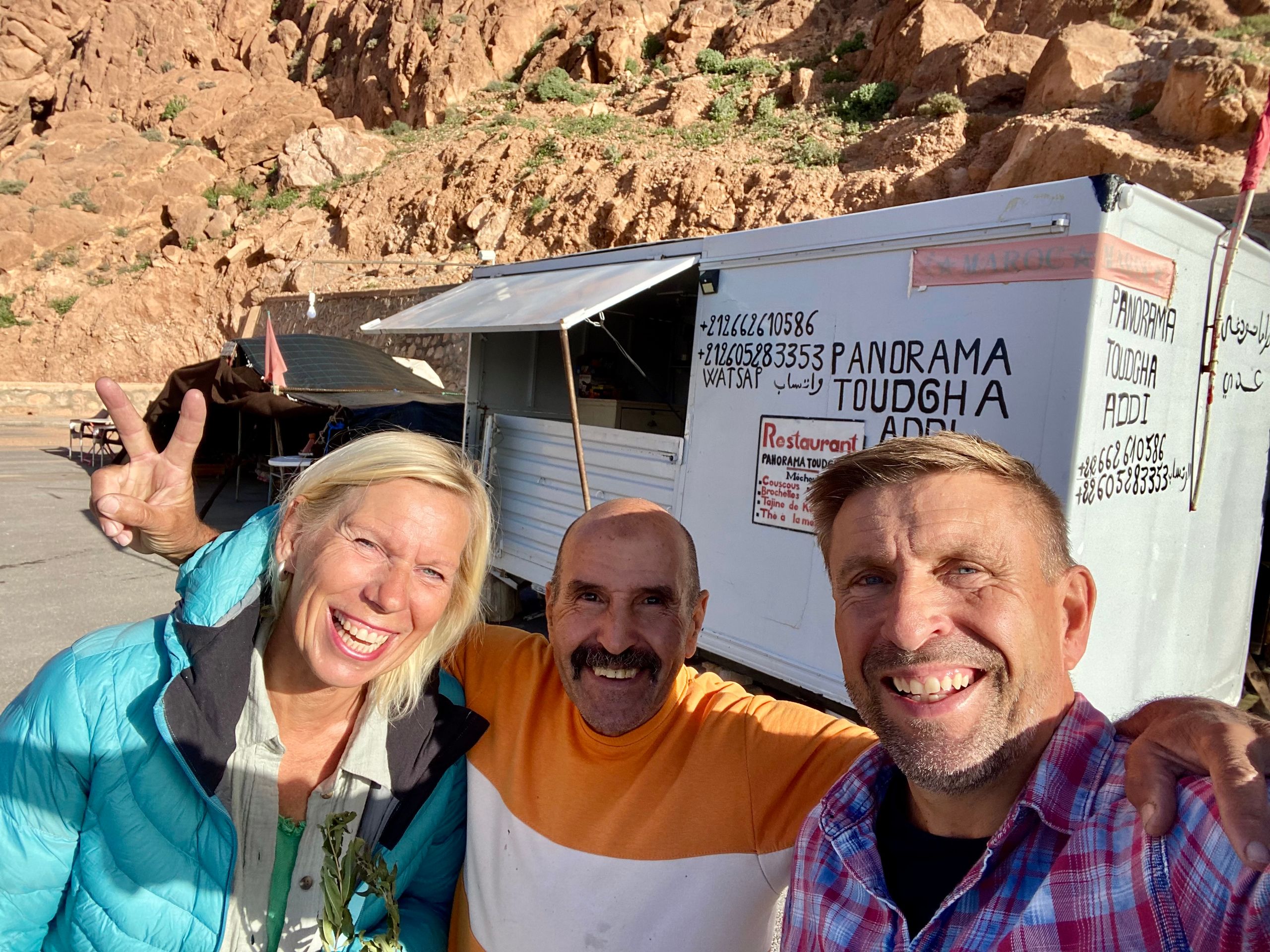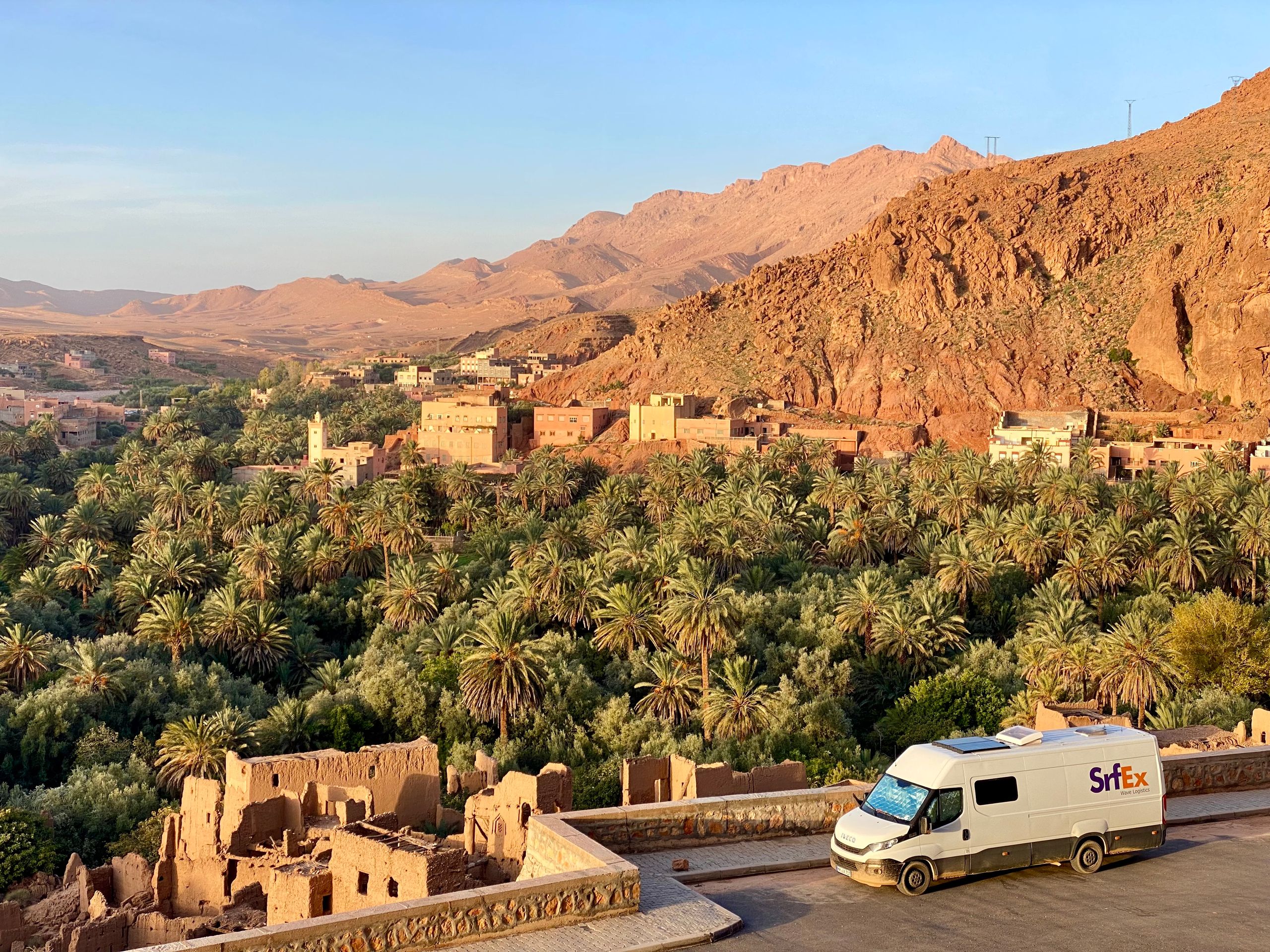 In the evening we reach Toudaha El Oulia, a small oasis town at the entrance to the Todra Gorge. We spend the night in the parking lot of a lonely panoramic road with a breathtaking view of the town, the oasis, and an old, dilapidated Kasbah. Here we are all alone. The only snack bar in the parking lot seems to be closed. We take a walk through the oasis and the kasbah, preparing for a quiet night. When we return to the parking lot, the owner of the snack bar appears. Apparently, he saw from his house in town that potential customers were on