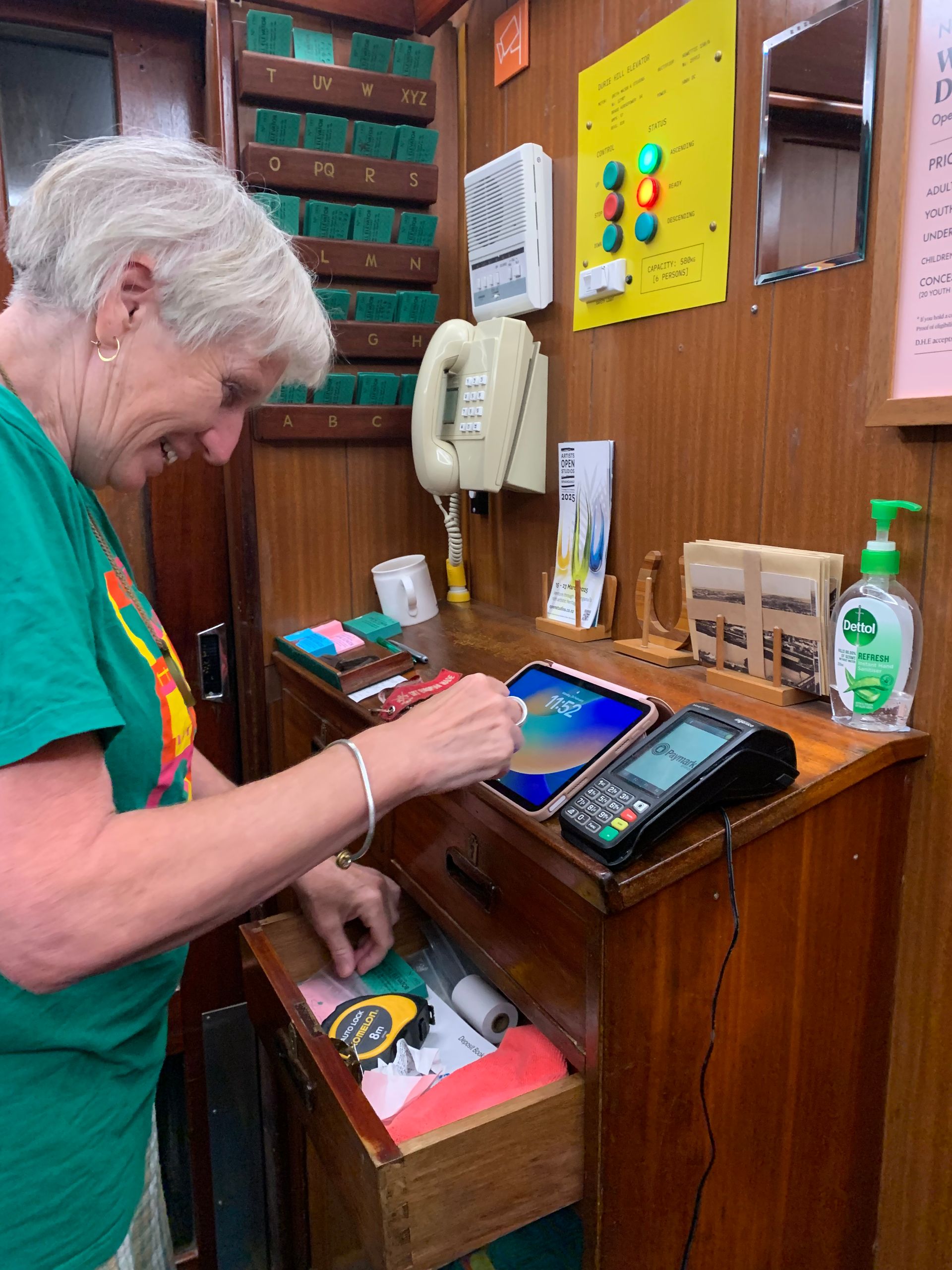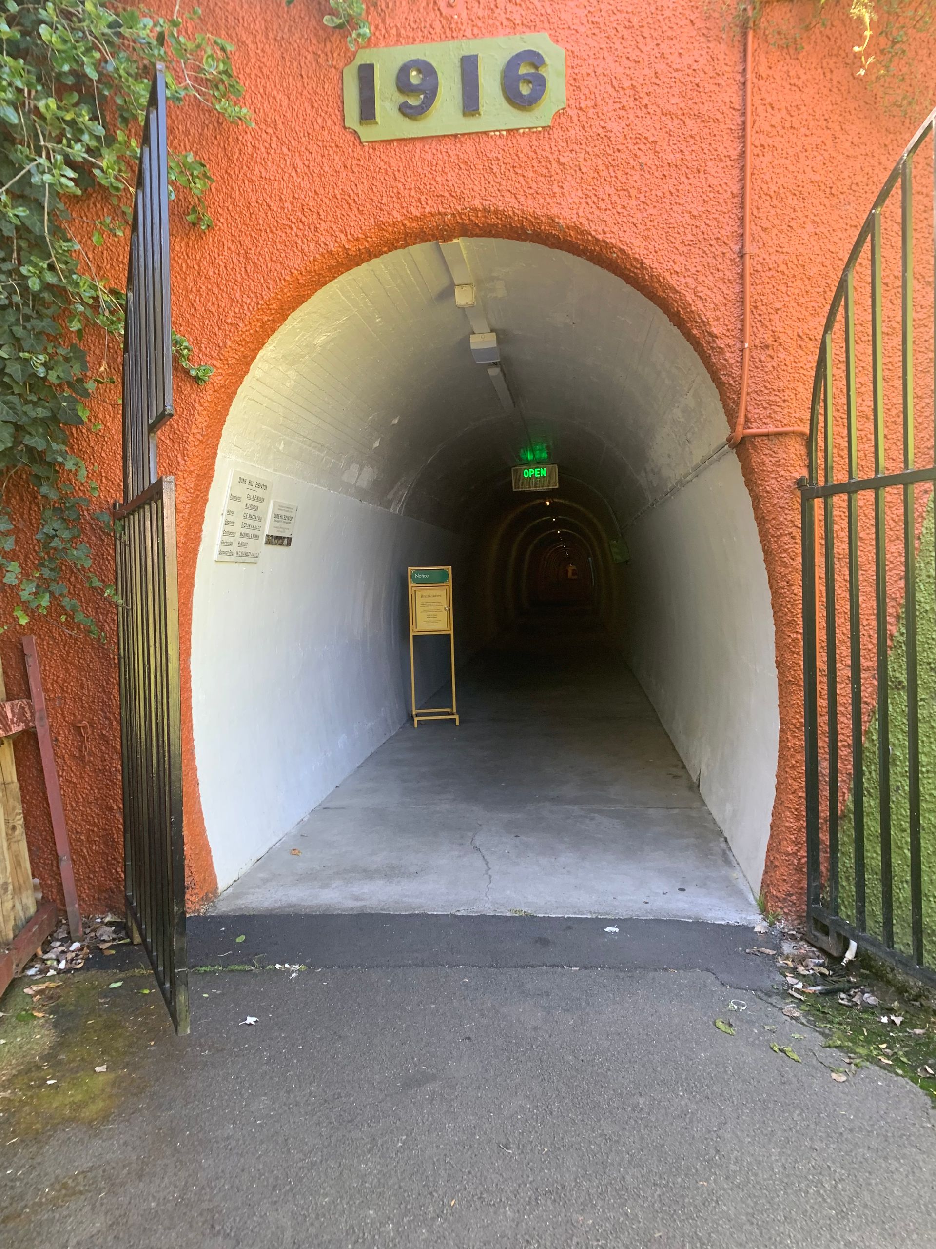 The first activity in the late morning is a walk through a park along the river to the Durie Hill Memorial Tower on a hill, which you can ascend via an elevator inside the hill, 'The Durie Hill Elevator', built in 1919 - the interior of the elevator looks like this.