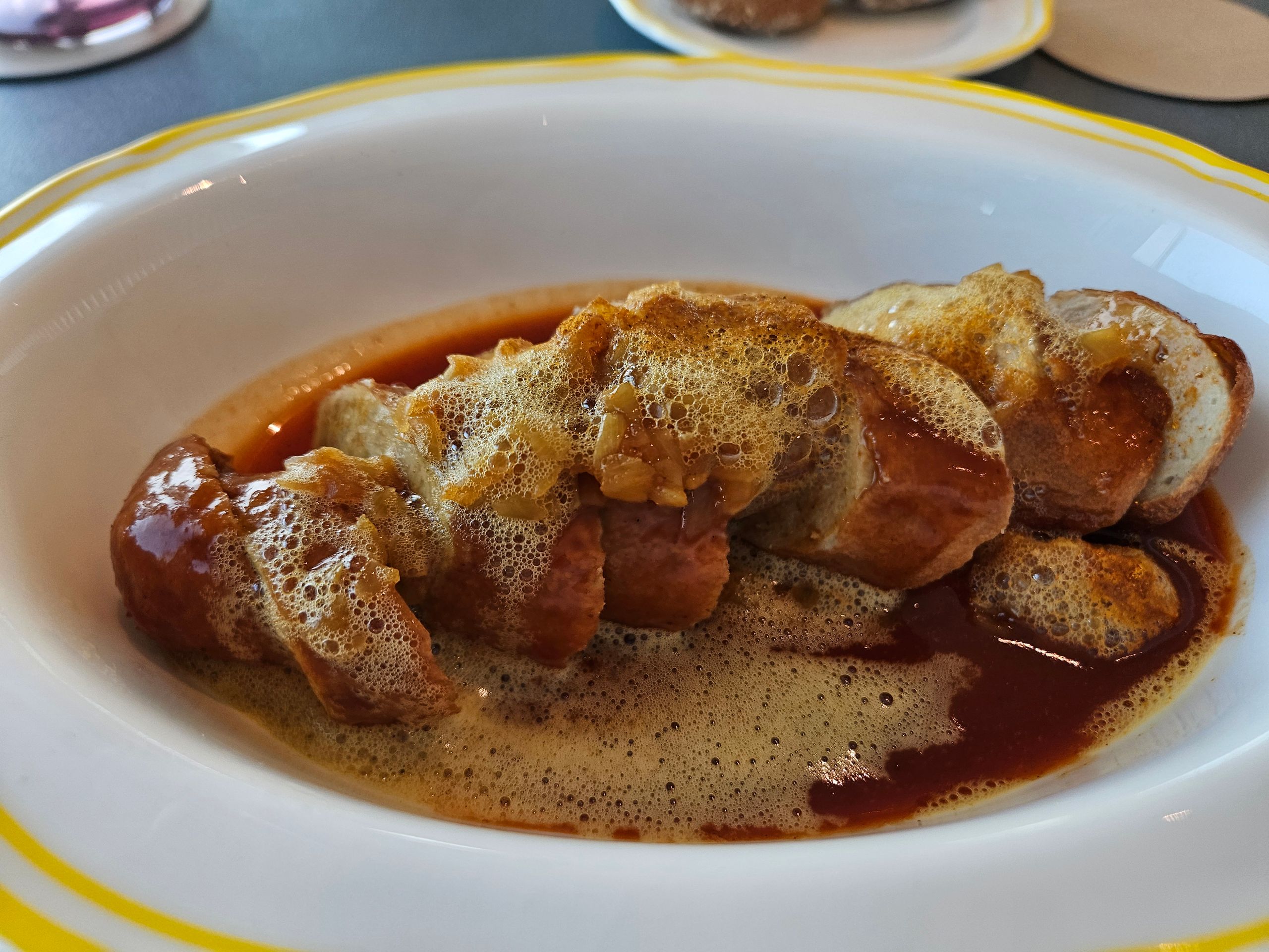 We chose the 'Hot & Cold' menu priced at €29. This includes the famous currywurst. Almost nothing is more typical for Berlin. It came served on porcelain and was truly delicious! It was accompanied by Schrippen, which is the Berlin word for bread rolls, and I believe the waiters are encouraged to use that term. Unfortunately, they were bland baked goods without salt.