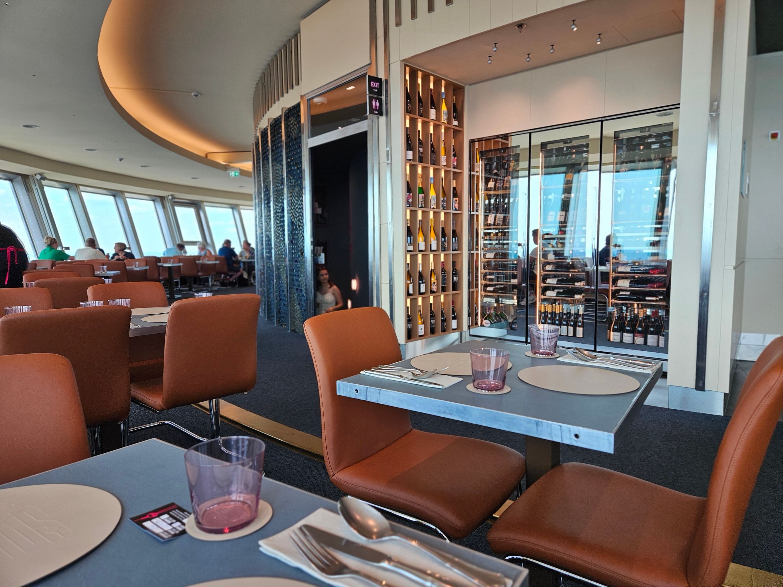 Once at the top, you first enjoy the view. It is impressive. The restaurant rotates slowly and evenly while the city unfolds below like a model train landscape. Complete with moving trains!